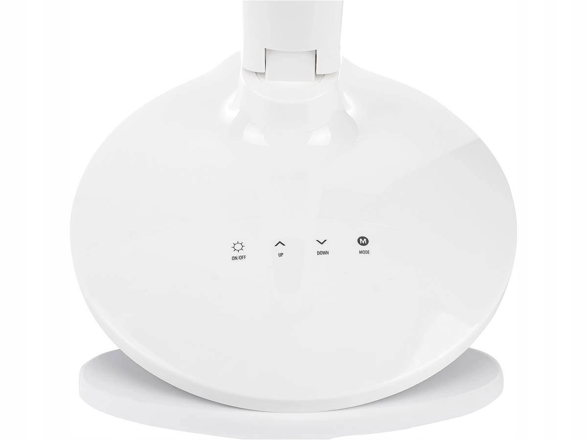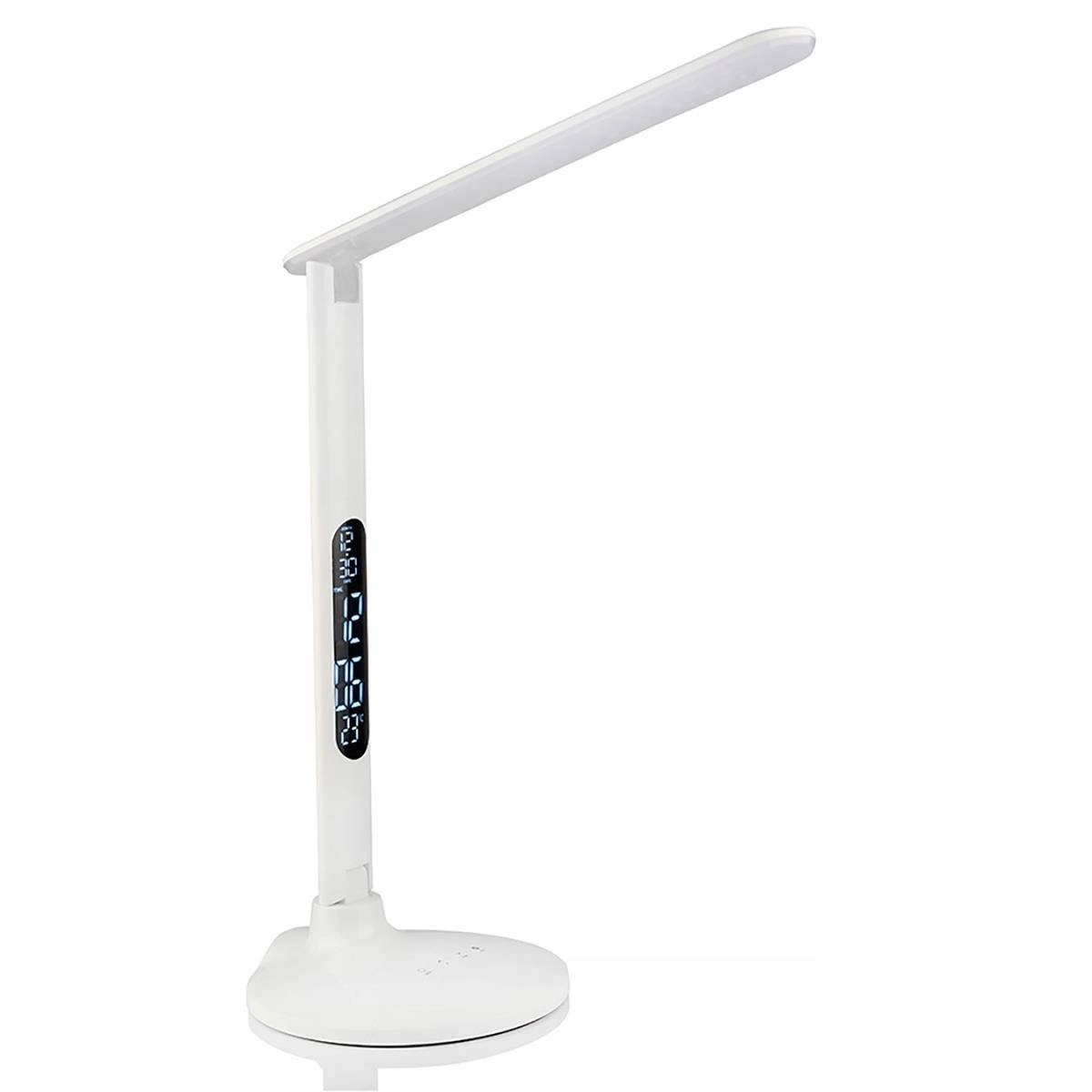 Designerska lampka biurkowa LED 10W wyposażona w wielofunkcyjny wyświetlacz, ładowarkę USB, filtr EYE PROTECTION, budzik, dotykowy włącznik i ściemniacz umożliwiający ustawianie 5 stopni jasności. Lampka posiada system MAGIC MODE, dzięki któremu poprzez panel dotykowy lampki można ustawić dowolnie wybraną barwę światła i tryb pracy : DO NAUKI 5500K, RELAXU/SNU 3000K, CZYTANIA 4200K. Głowicę lampki można wyginać w dowolny sposób co ułatwia optymalne ustawienie padania strumienia światła. Lampka gotowa do pracy.
