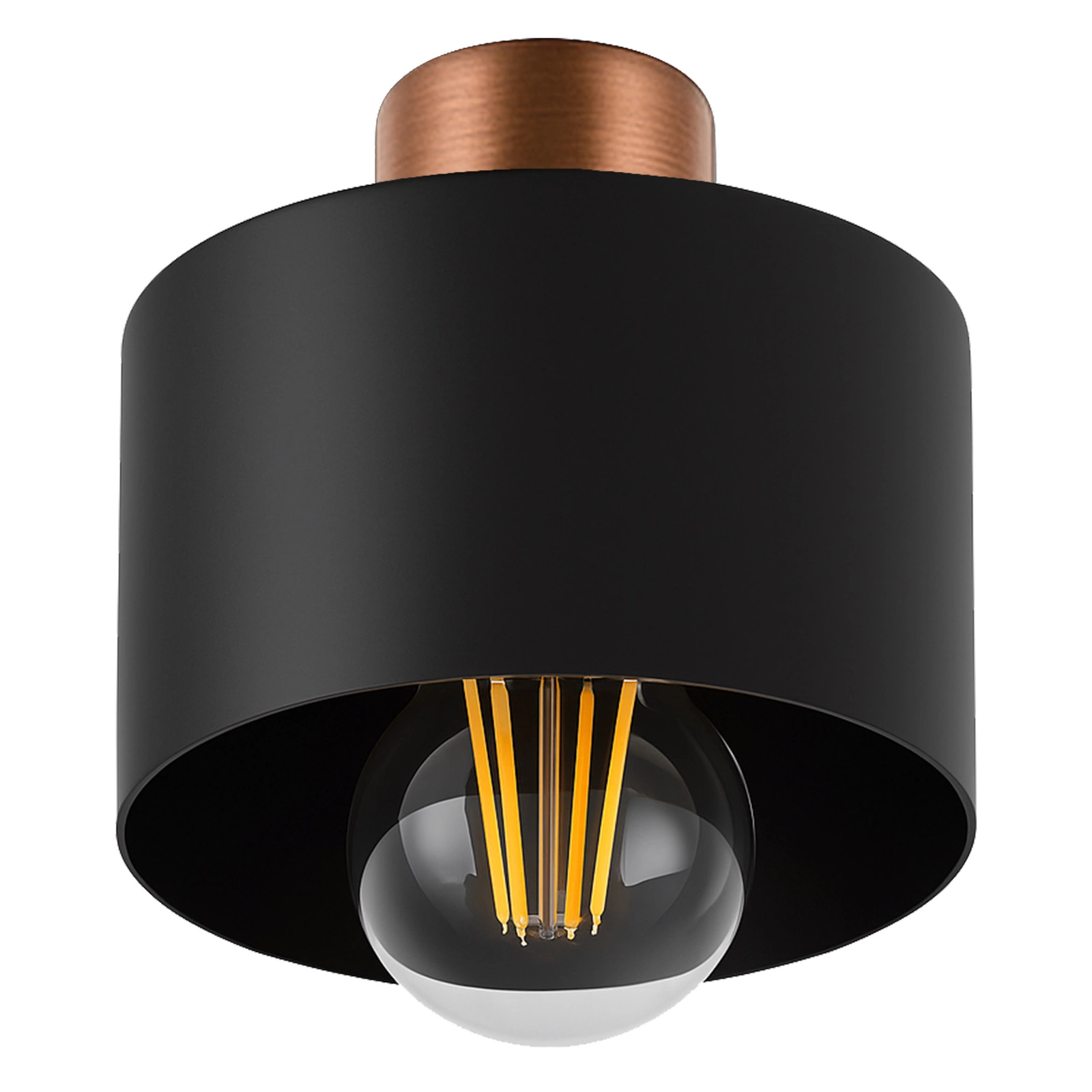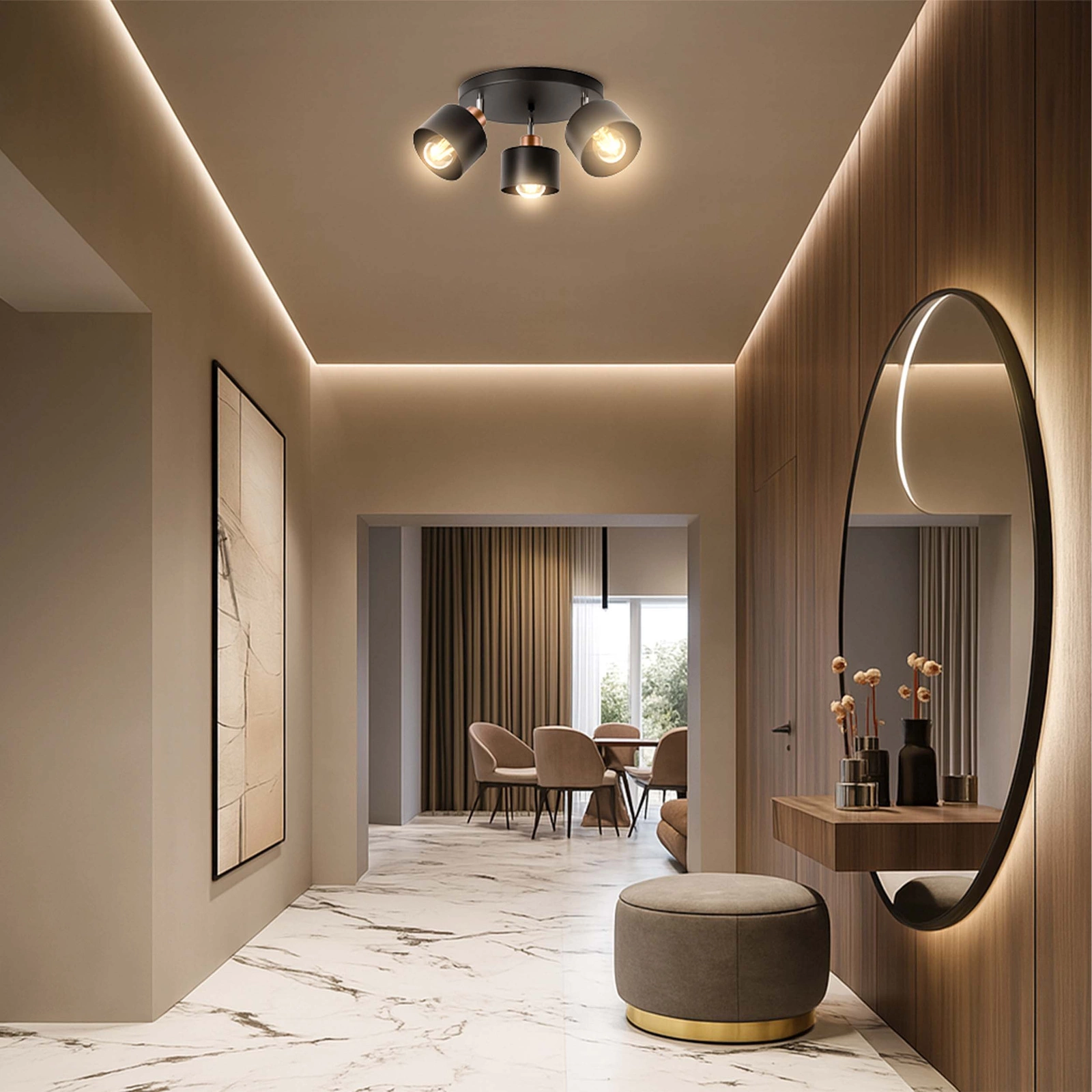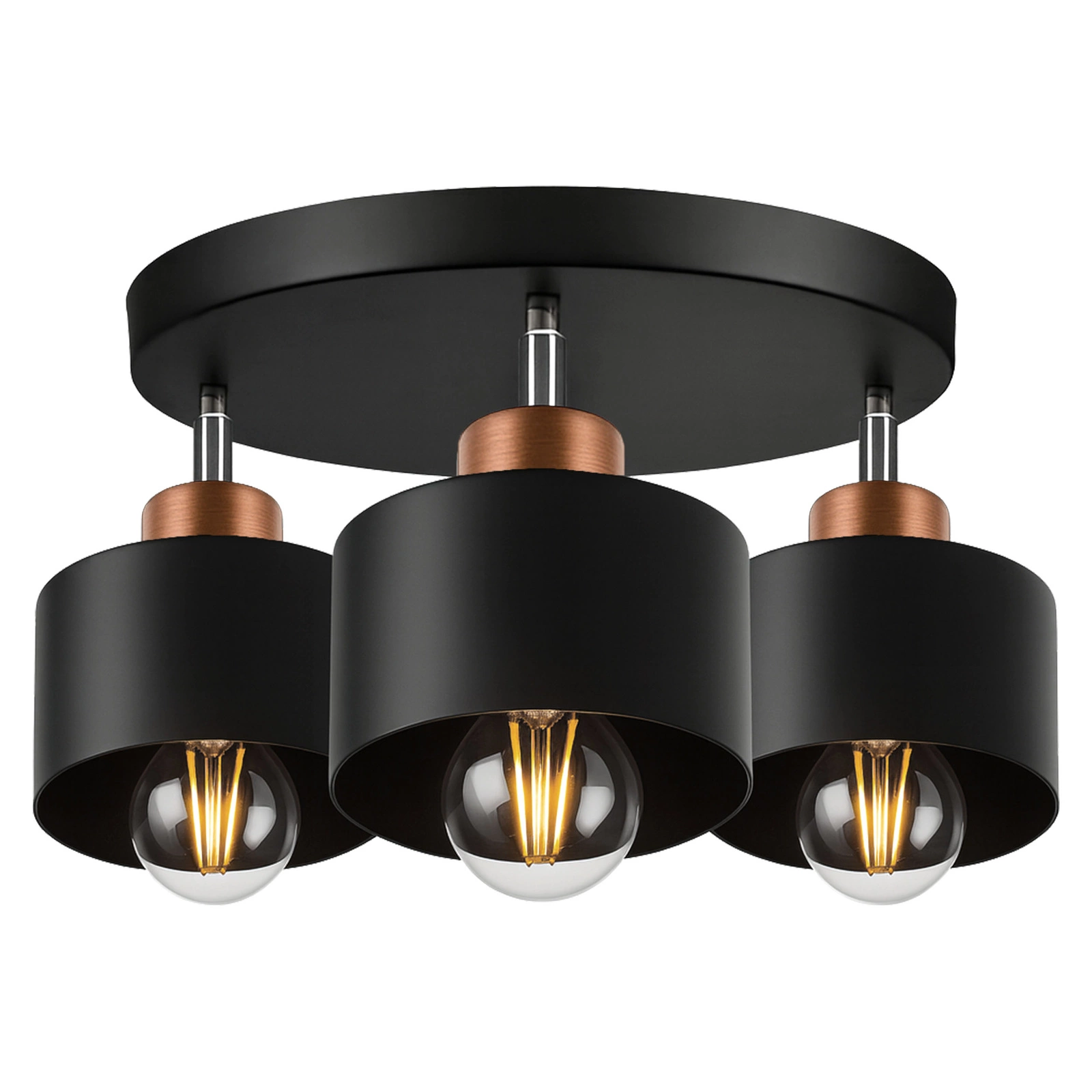 - Elegancka lampa 3×E27 w stylu loft łączy minimalistyczną formę z funkcjonalnością. Matowa czerń z miedzianym dodatkiem i cylindryczne klosze tworzą ponadczasowy zestaw, który bez trudu doświetli salon, kuchnię czy jadalnię – także przy niższych sufitach (wysokość tylko 20 cm).