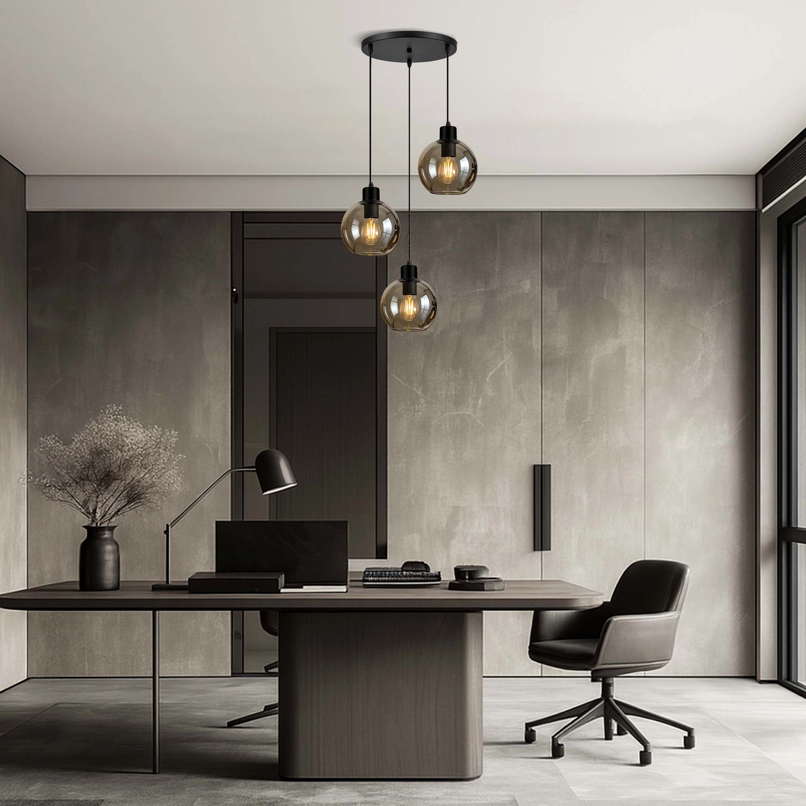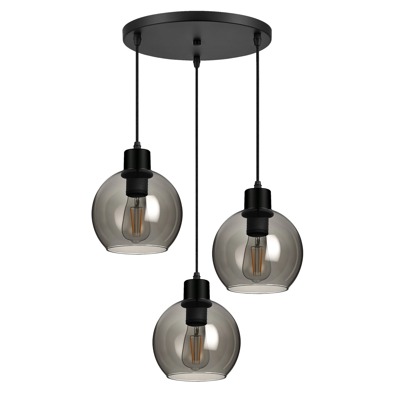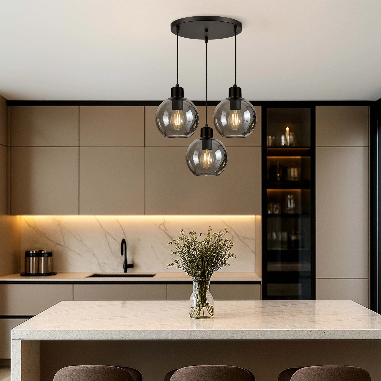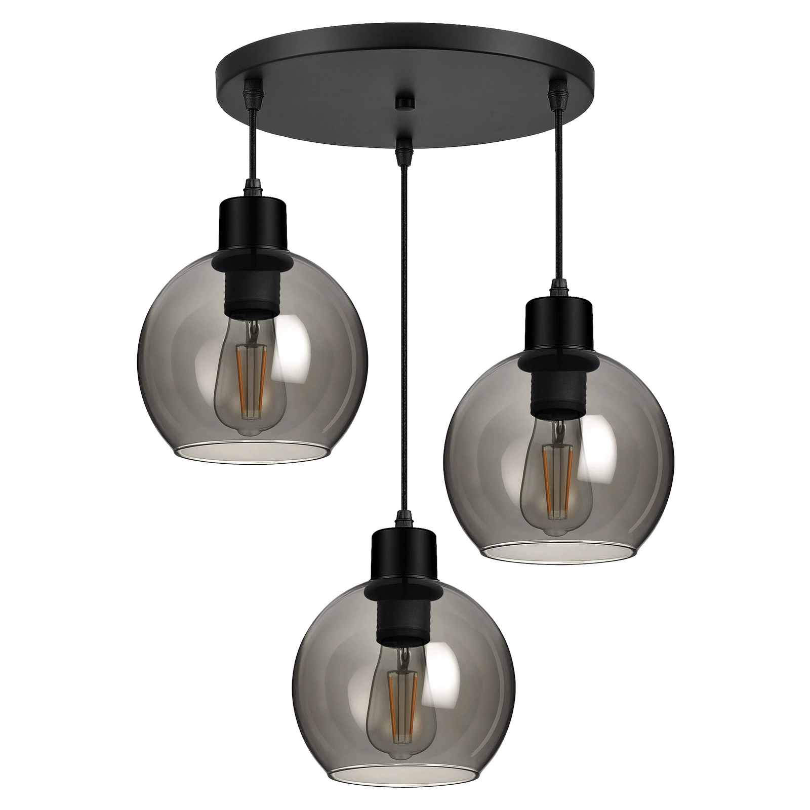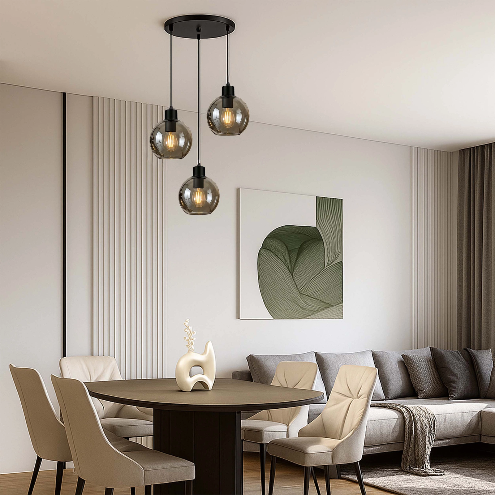 Stylowa i funkcjonalna lampa sufitowa z trzema szklanymi kloszami to połączenie nowoczesnego designu z industrialną nutą. Klosze z przydymionego szkła pięknie rozpraszają światło i dodają wnętrzu charakteru. Sprawdzi się zarówno w salonie, jadalni, jak i nad kuchenną wyspą.