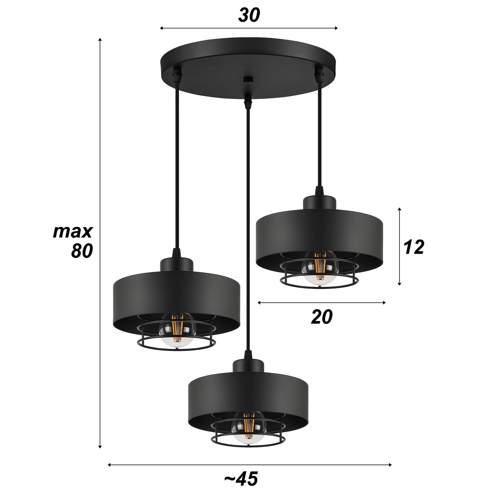 - ⚙️Parametry techniczne: ▪️Średnica podsufitki: 30 cm ▪️Średnica klosza: 20 cm ▪️Wysokość klosza: 12 cm ▪️Długość całkowita (max): 80 cm (regulowana) ▪️Gwint: 3x E27 ▪️Maks. moc: 3x 40W (zalecane LED 4–8W) ▪️Kolor: czarny mat ▪️Materiał: metal malowany proszkowo ▪️Stopień ochrony: IP20 ▪️Zasilanie: 230V