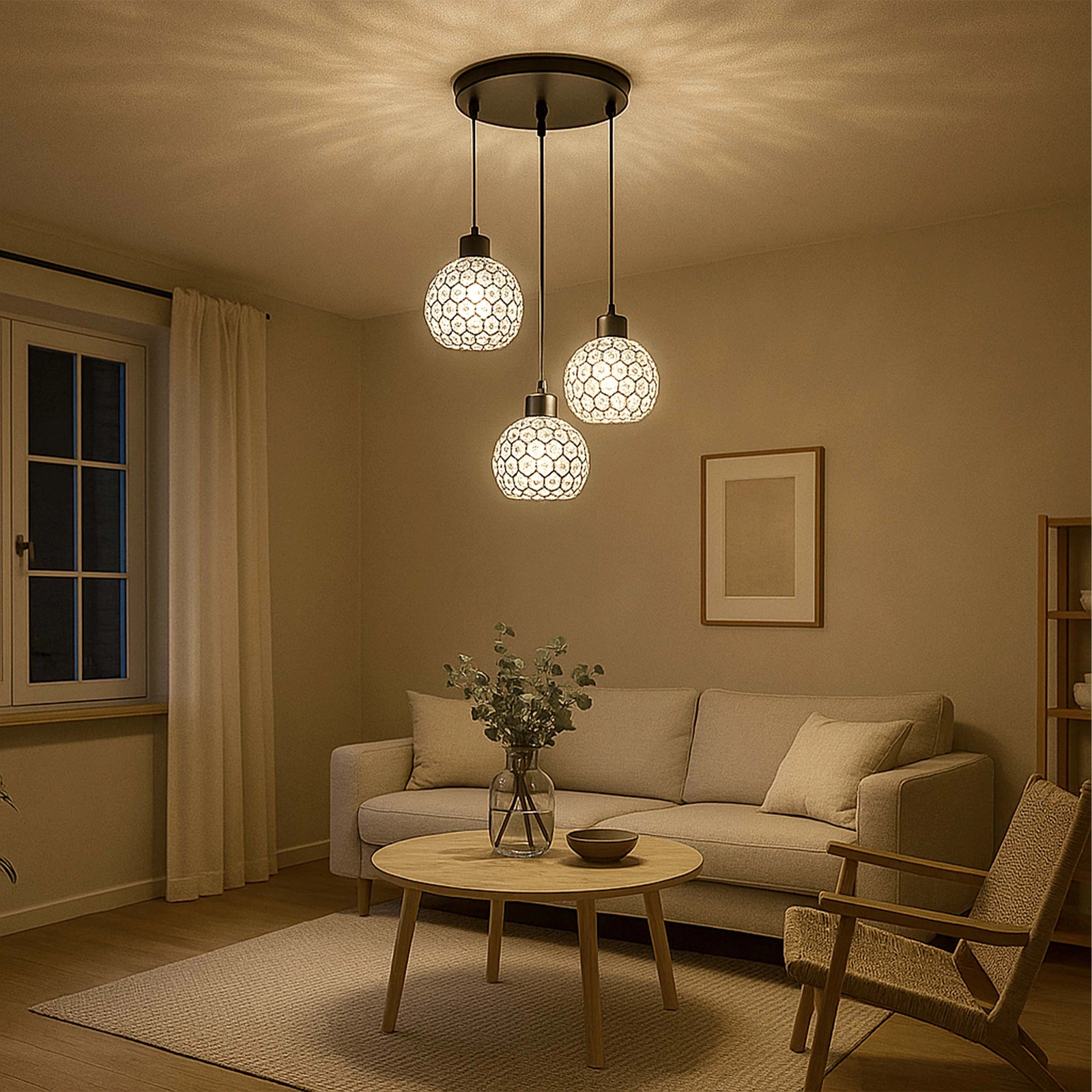 - Dlaczego warto? ◾️ Trzy źródła światła (E27) – równomierne oświetlenie całego wnętrza ◾️ Okrągła podsufitka i wiszące klosze w formie kul – lekka, zrównoważona kompozycja ◾️ Kryształowe wykończenie – błysk, który odbija światło w setkach drobnych refleksów ◾️ Styl glamour i nowoczesny w jednym –elegancka forma z nowoczesną linią ◾️ Regulowana wysokość zawieszenia – od 30 do 80 cm (dostosuj do sufitu i przestrzeni)