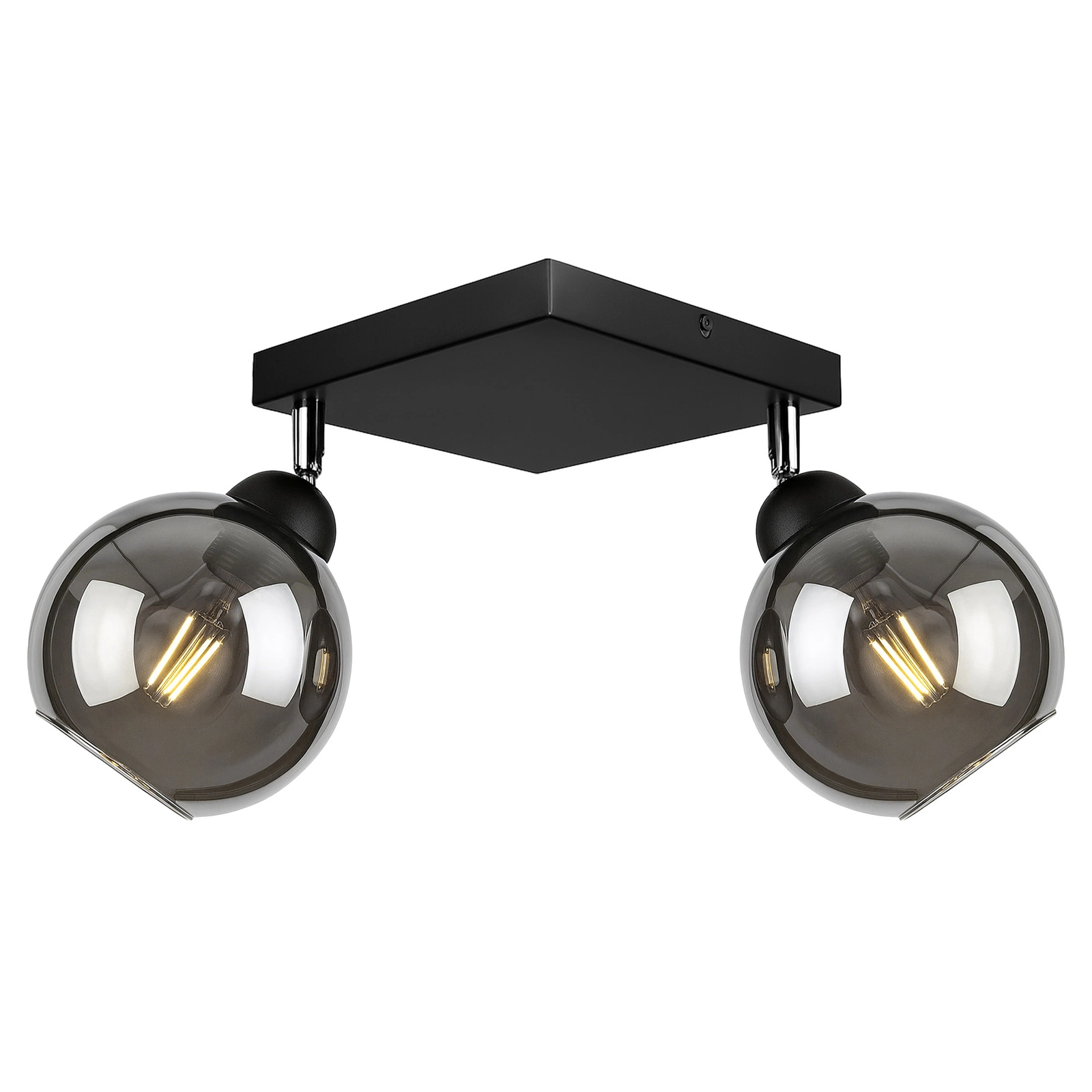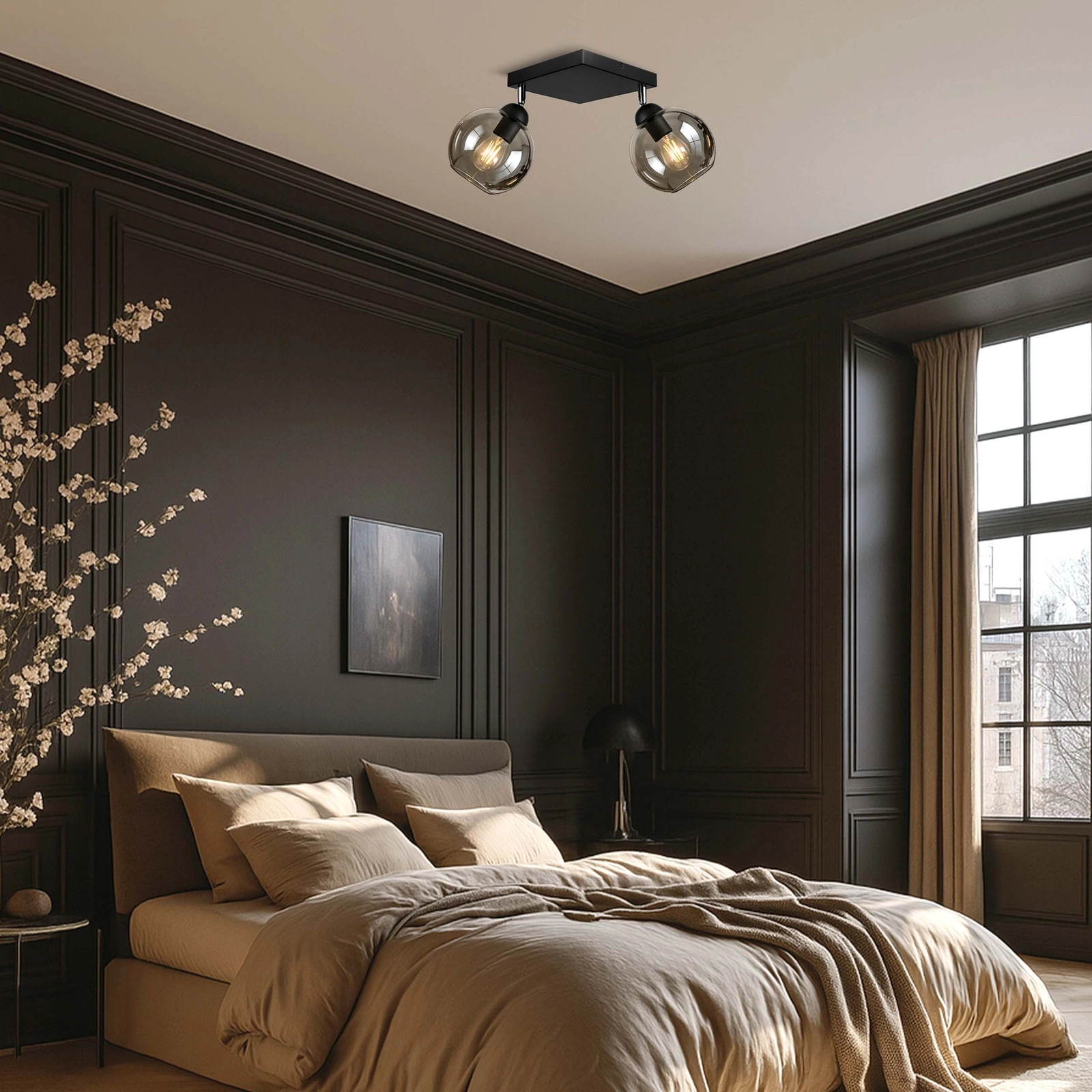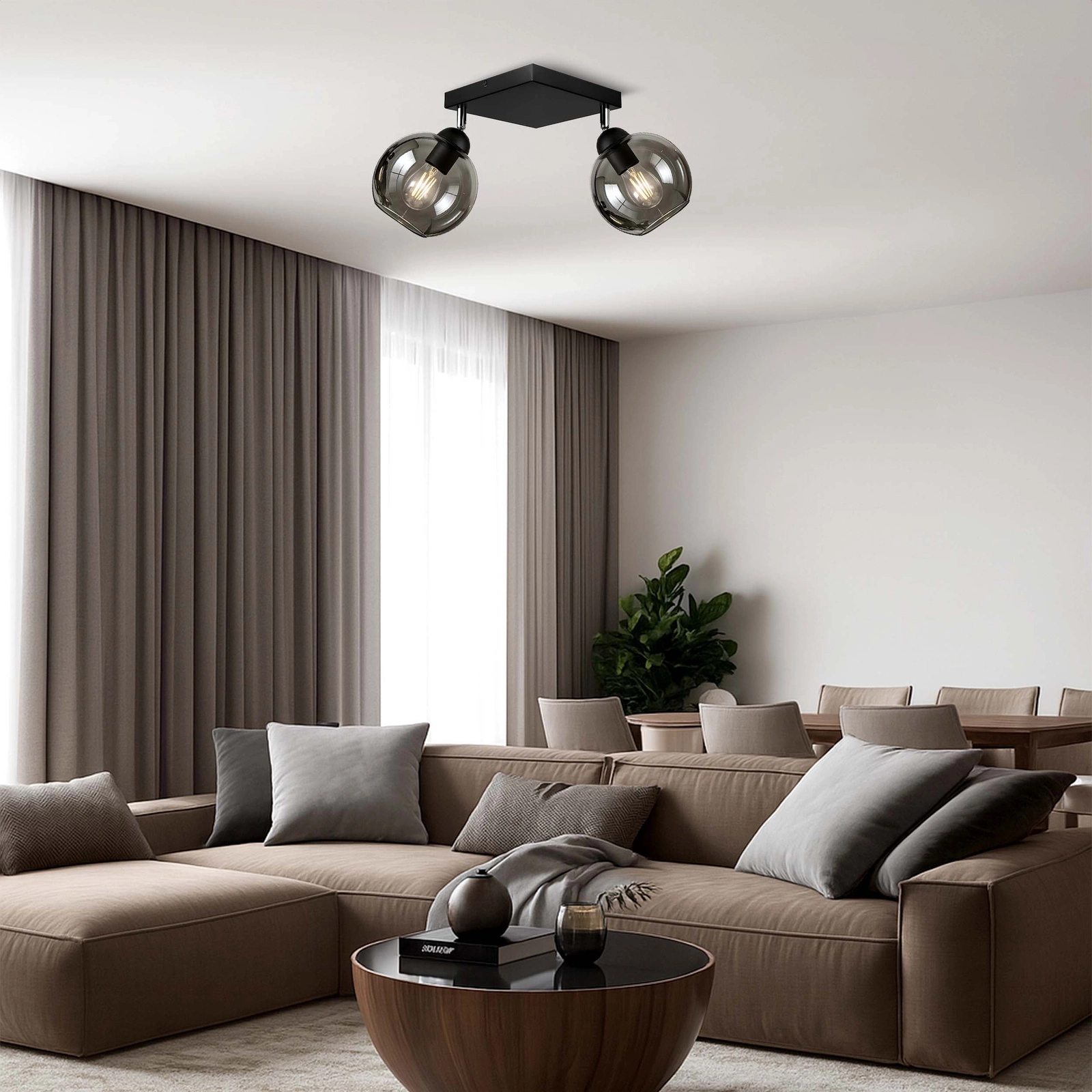 Elegancka lampa sufitowa z dwoma, regulowanymi kloszami z dymionego szkła łączy loftowy sznyt z nutą glamour. Niewielka wysokość sprawia, że świetnie sprawdza się także w pomieszczeniach z niższym sufitem.