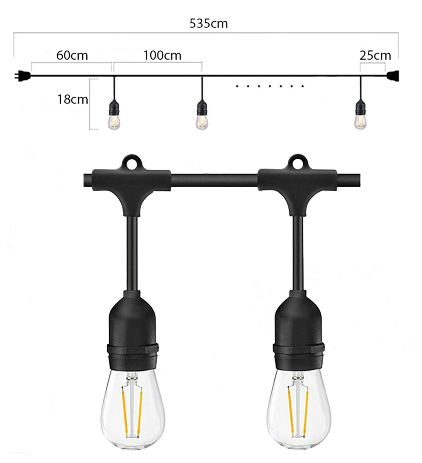 ▪️Model: Girlanda ogrodowa ▪️Długość: 5 metrów ▪️Odległość między żarówkami: około 100cm ▪️Klasa szczelności: IP44 ▪️Możliwość łączenia ze sobą girland: Tak ▪️Napięcie zasilania: 230V ▪️Uchwyt na montaż na lince nad żarówkami. Dane techniczne żarówki: ▪️ST14 1W WW ▪️Gwint: E27 ▪️Żarówki w zestawie: Tak, 5x LED ▪️Klasa szczelności: IP44 ▪️Ilość cykli włącz-wyłącz: 25 000 ▪️Żywotność: 30 000 godzin ▪️Barwa światła: biała ciepła 3000K ▪️Certyfikaty: CE, RoHS
