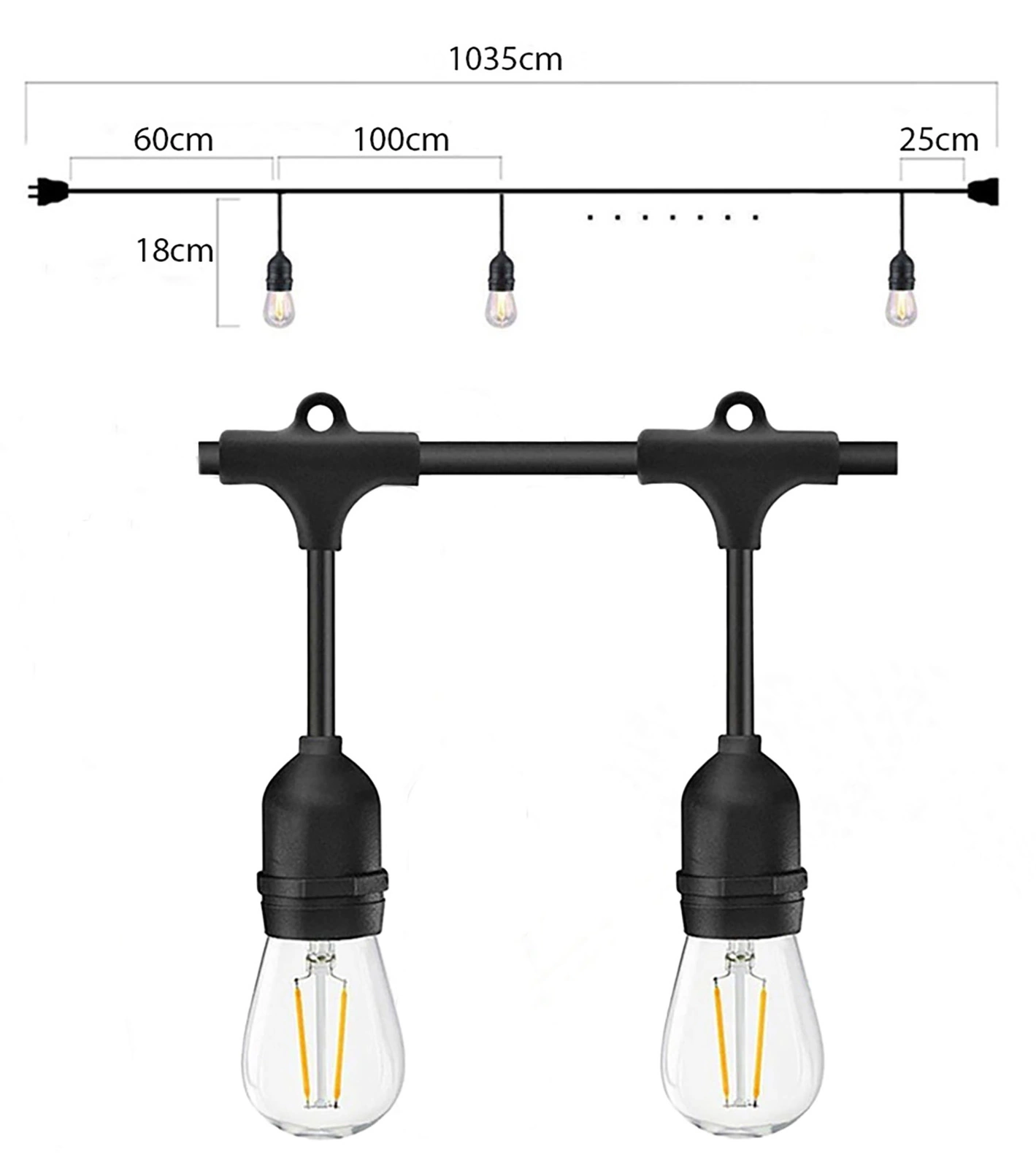 ▪️Model: Girlanda ogrodowa ▪️Długość: 10 metrów ▪️Odległość między żarówkami: około 100cm ▪️Klasa szczelności: IP44 ▪️Możliwość łączenia ze sobą girland: Tak ▪️Napięcie zasilania: 230V ▪️Uchwyt na montaż na lince nad żarówkami. Dane techniczne żarówki: ▪️ST14 1W WW ▪️Gwint: E27 ▪️Żarówki w zestawie: Tak, 10x LED ▪️Klasa szczelności: IP44 ▪️Ilość cykli włącz-wyłącz: 25 000 ▪️Żywotność: 30 000 godzin ▪️Barwa światła: biała ciepła 3000K ▪️Certyfikaty: CE, RoHS