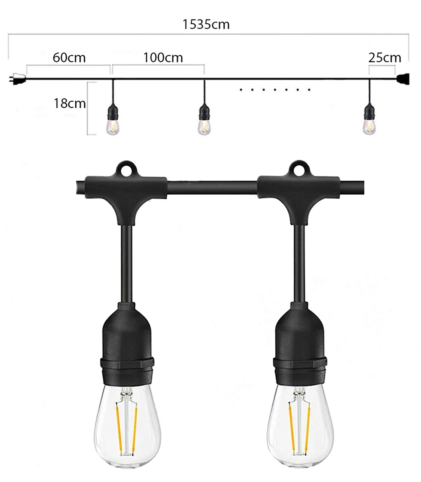 ▪️Model: Girlanda ogrodowa ▪️Długość: 15 metrów ▪️Odległość między żarówkami: około 100cm ▪️Klasa szczelności: IP44 ▪️Możliwość łączenia ze sobą girland: Tak ▪️Napięcie zasilania: 230V ▪️Uchwyt na montaż na lince nad żarówkami. Dane techniczne żarówki: ▪️ST14 1W WW ▪️Gwint: E27 ▪️Żarówki w zestawie: Tak, 15x LED ▪️Klasa szczelności: IP44 ▪️Ilość cykli włącz-wyłącz: 25 000 ▪️Żywotność: 30 000 godzin ▪️Barwa światła: biała ciepła 3000K ▪️Certyfikaty: CE, RoHS