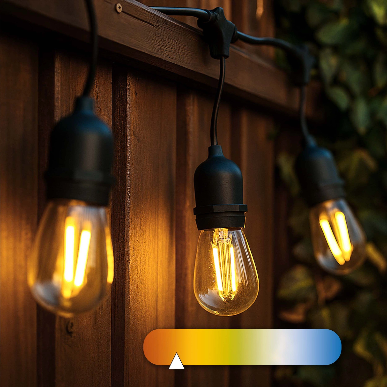 Girlanda ogrodowa, łańcuch o długości 15 metrów, wyposażona w oprawki pod żarówki E27 wraz z 30 dekoracyjnymi żarówkami LED filament o mocy 1W, tworzy wydajne i estetyczne źródło oświetlenia. Zestaw doskonale uzupełnia wystrój ogrodu, a także może służyć jako główne oświetlenie w altanie.