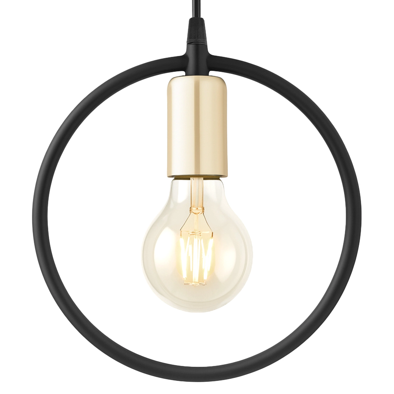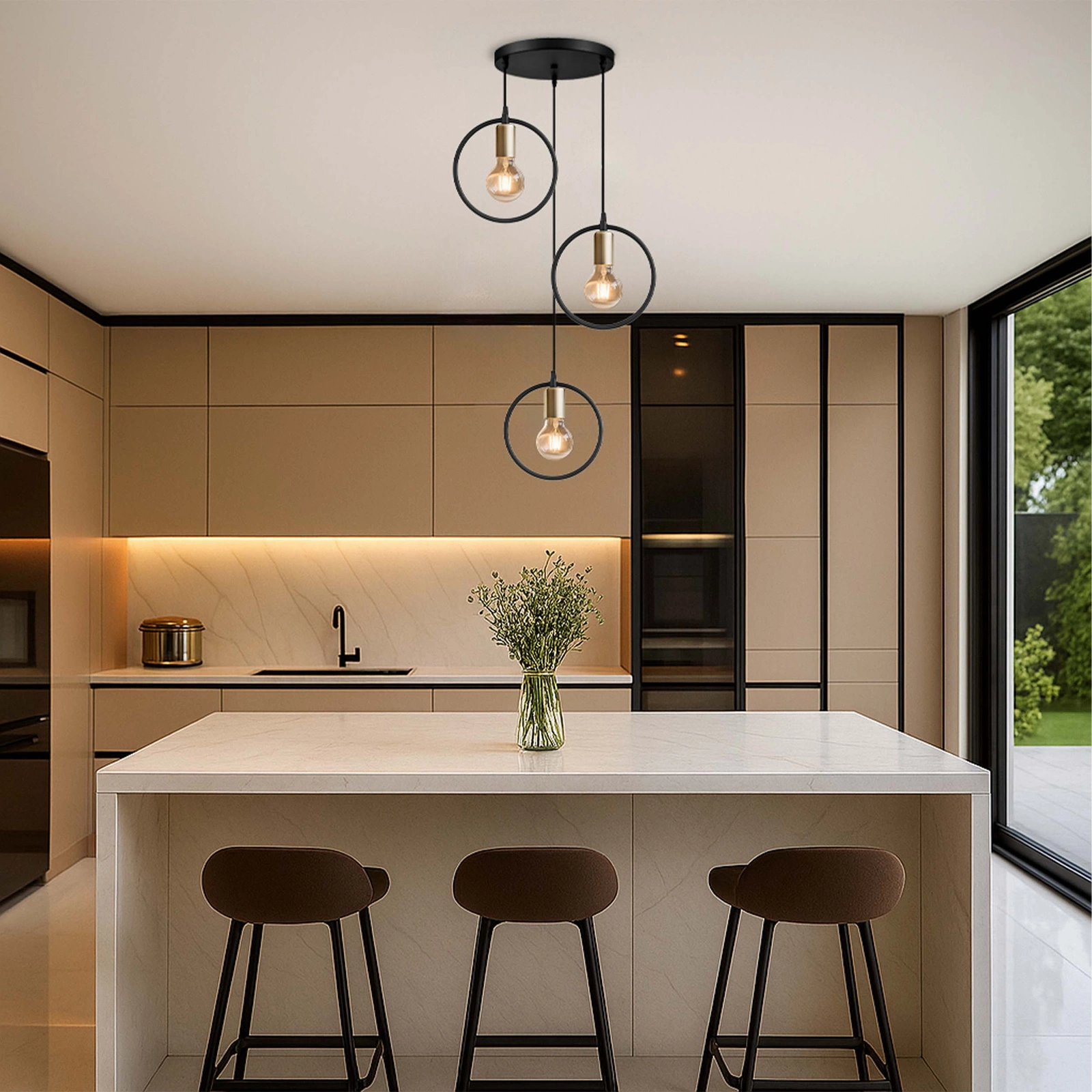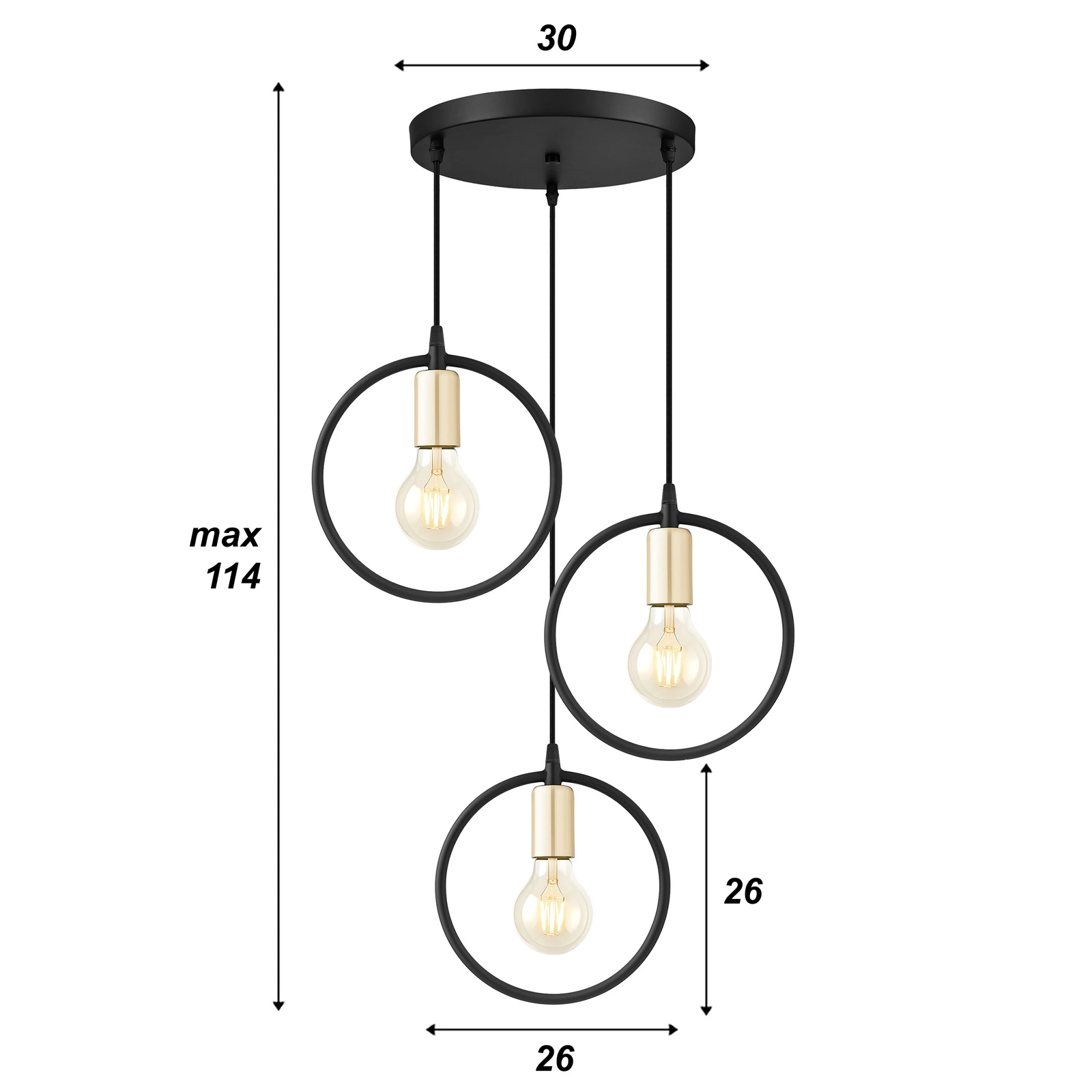 Trzy świetlne pierścienie w matowej czerni ze złotymi oprawkami tworzą efektowną kaskadę światła. Regulowane przewody (do 114 cm) pozwolą zawiesić każdy punkt na innej wysokości – idealnie nad stołem, wyspą lub w salonie.