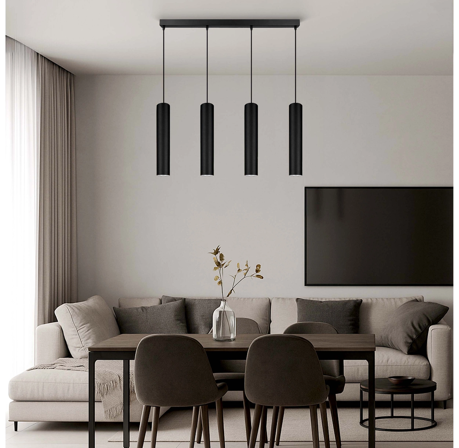 - Lampa Wisząca Tuba 4-Punktowa Czarna | Nowoczesna Lampa Sufitowa LED GU10 | Styl LOFT Minimalistyczny 60 cm ✴️ Styl loftowy, czystość formy i światło tam, gdzie chcesz! Prezentujemy designerską lampę wiszącą tubową 4-punktową w kolorze czarnym matowym. Jej minimalistyczna forma i nowoczesny charakter idealnie wpisują się w aranżacje wnętrz w stylu LOFT, industrialnym, nowoczesnym, a nawet skandynawskim. To idealna lampa nad wyspę kuchenną, stół jadalniany, bar lub do nowoczesnych przestrzeni komercyjnych.