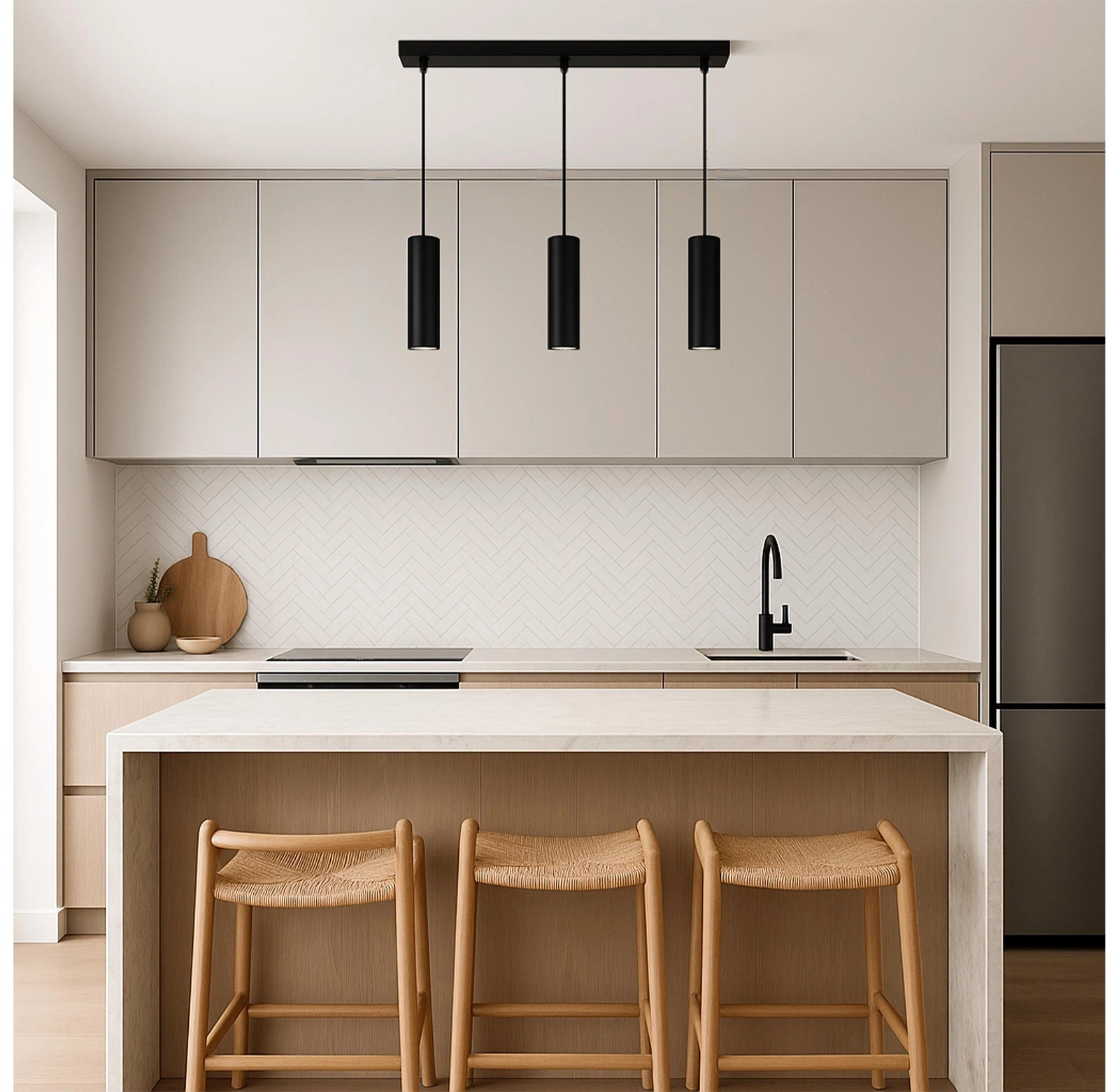 - ✅ Najważniejsze cechy: ◾️ 3 źródła światła – równomierne oświetlenie nad blatem, wyspą, stołem ◾️ Klosze w formie tub metalowych – odporne na uszkodzenia, trwałe i lekkie ◾️ Kolor czarny matowy – ponadczasowy, uniwersalny i elegancki ◾️ Regulowana długość przewodów – maksymalna wysokość aż 100 cm ◾️ Każda lampa zasilana żarówką GU10 – energooszczędne źródło światła LED ◾️ Idealna do nowoczesnych, loftowych, industrialnych przestrzeni