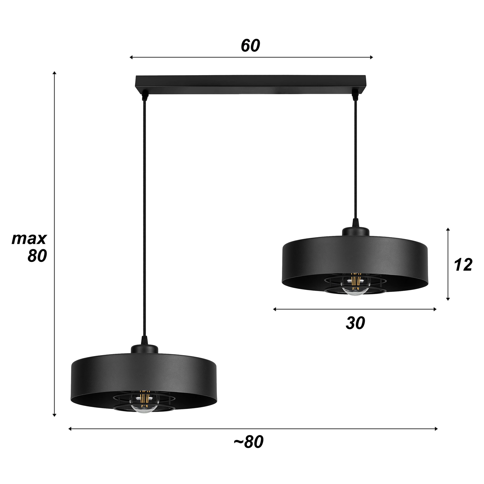 - ⚙️ Parametry techniczne: ▪️Długość listwy sufitowej: 60 cm ▪️Średnica klosza: 30 cm ▪️Wysokość klosza: 12 cm ▪️Maksymalna wysokość lampy: 80 cm (regulowana) ▪️Gwint: 2x E27 ▪️Moc maksymalna: 2x 40W (zalecane LED 4–8W) ▪️Materiał: metal malowany proszkowo ▪️Kolor: czarny mat ▪️Zasilanie: 230V ▪️Stopień ochrony: IP20