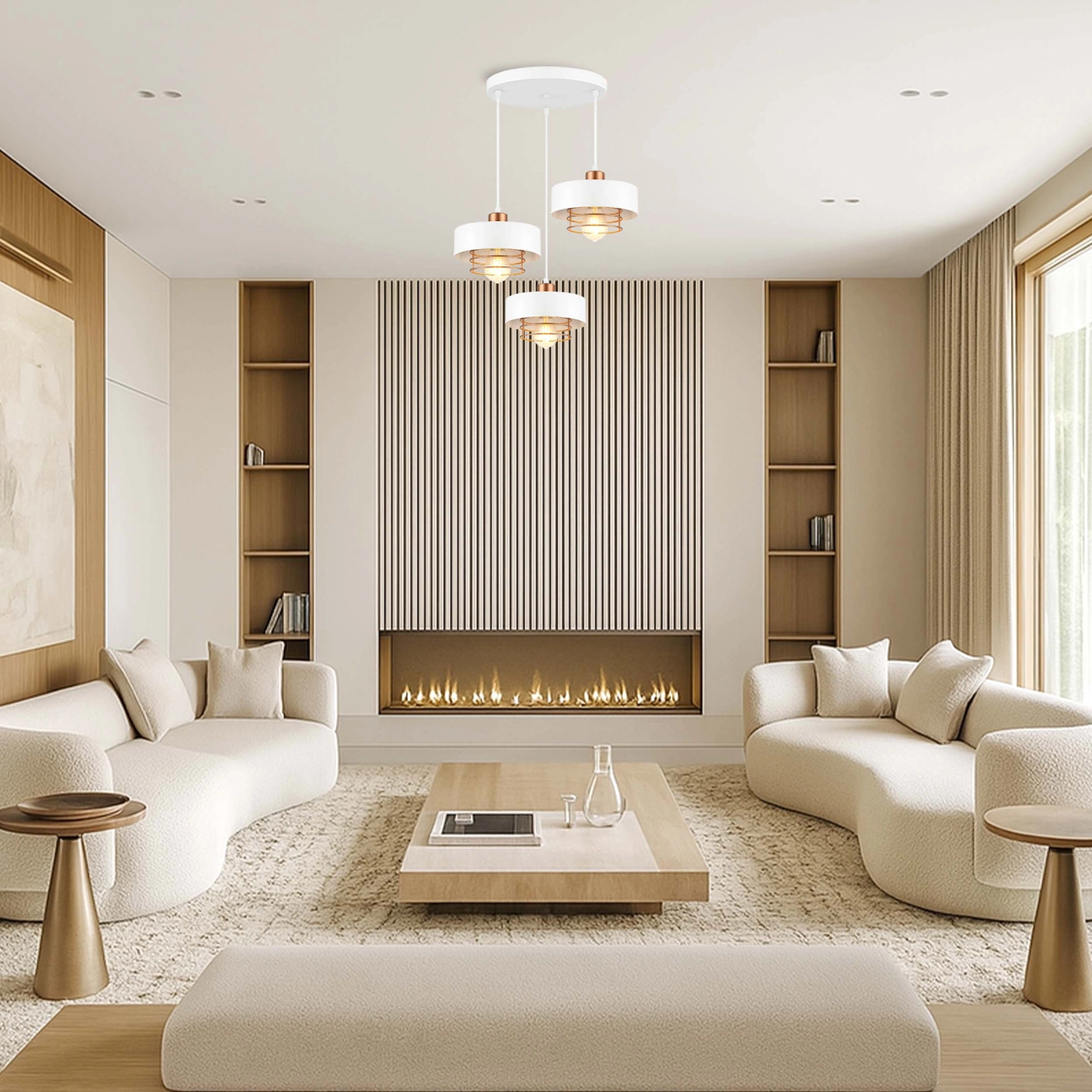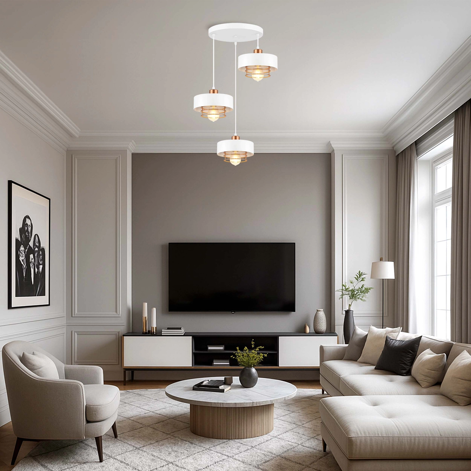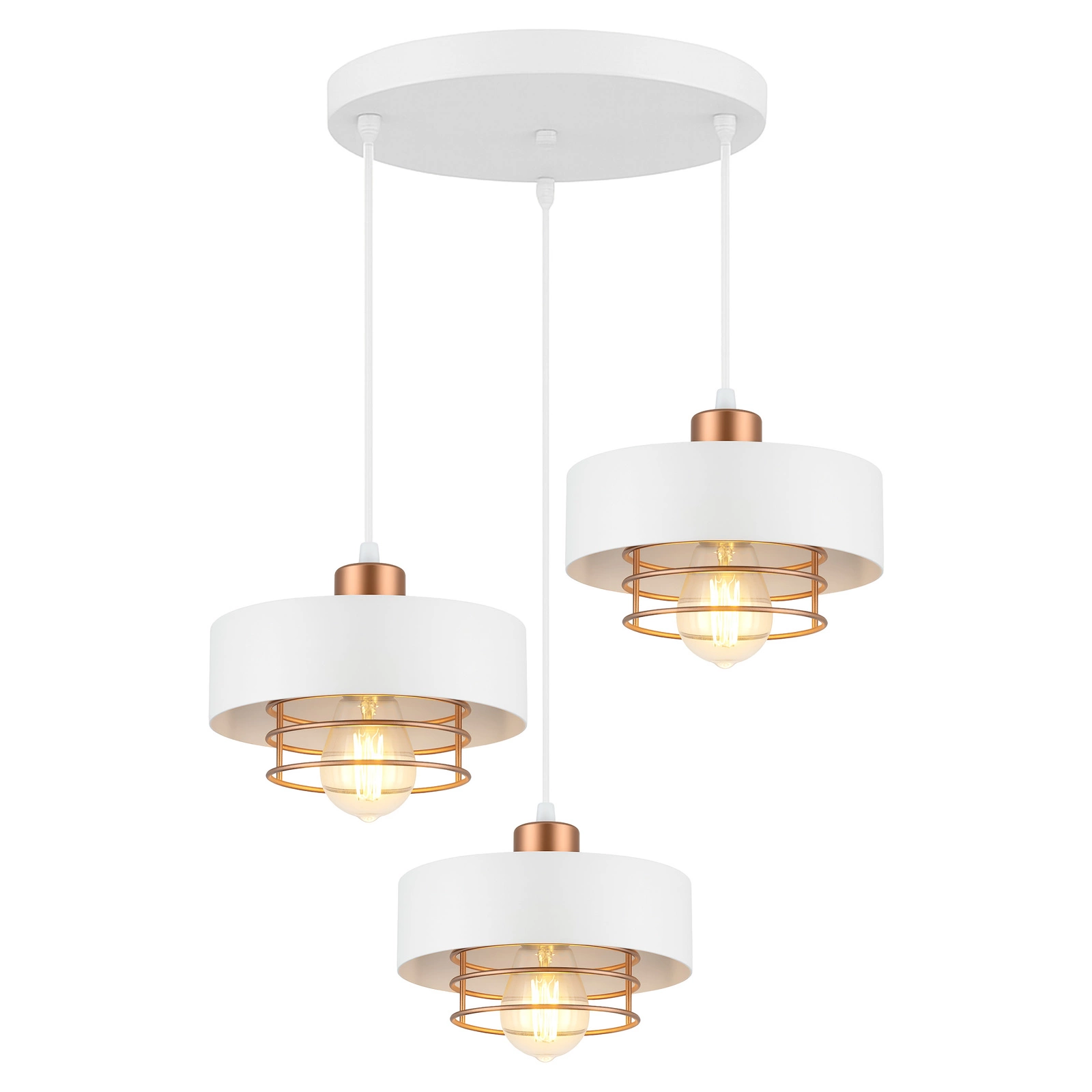 - ✴️Lampa wisząca 3-punktowa biała z miedzianym wykończeniem – do kuchni, salonu, jadalni Szukasz nowoczesnej lampy do kuchni lub salonu? Ta biała lampa wisząca z trzema kloszami to połączenie funkcjonalności, stylu loft i eleganckiego akcentu w postaci miedzianych detali. Idealna jako oświetlenie nad stół, do jadalni, kuchni wyspy lub salonu.