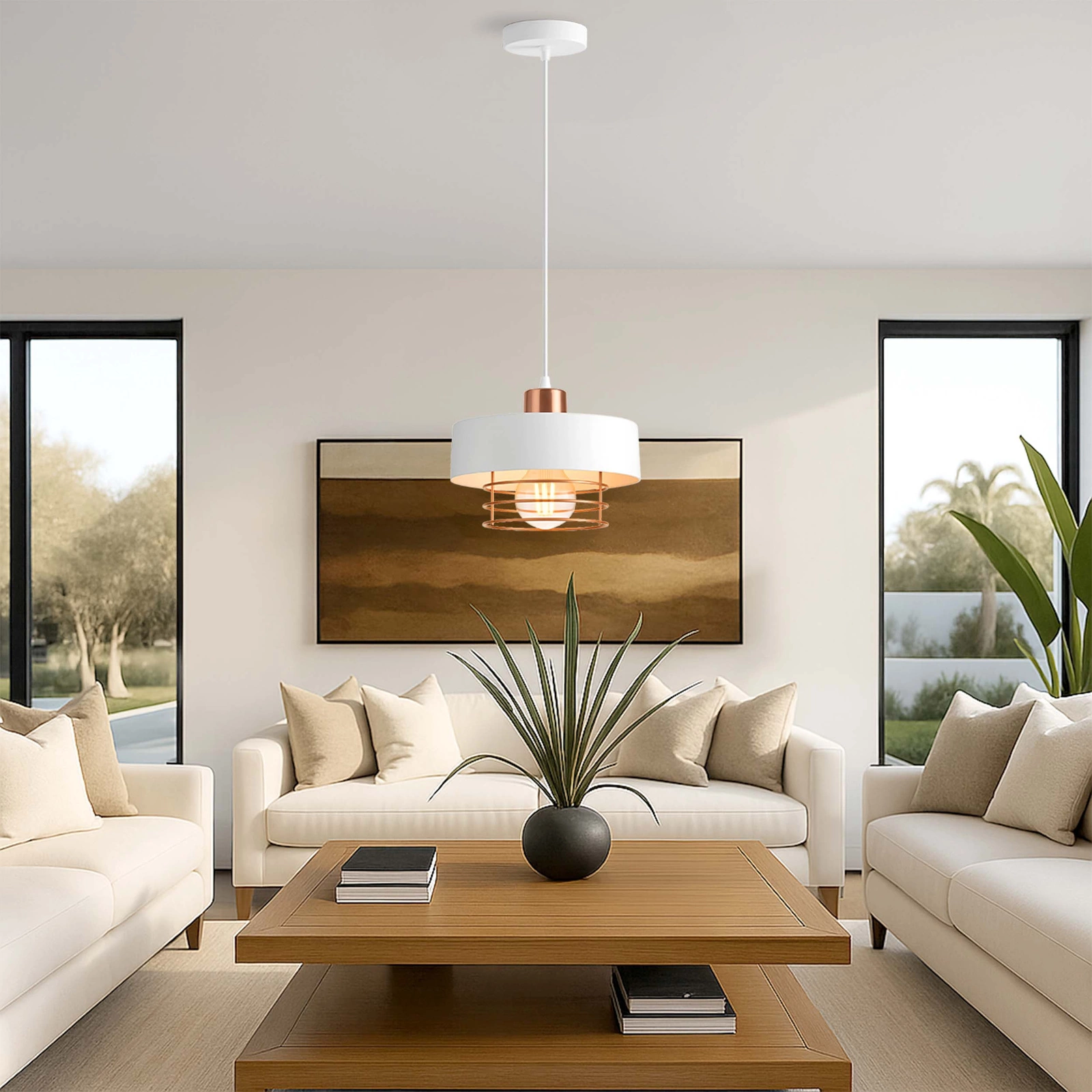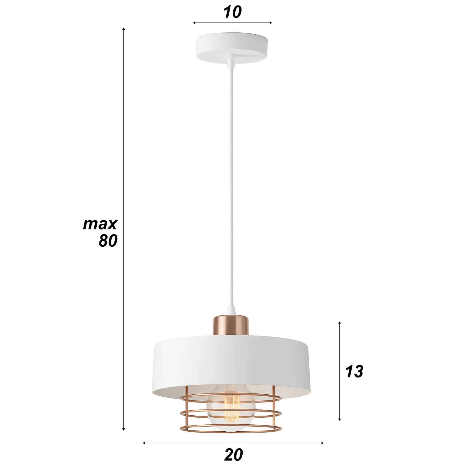- ⚙️ Specyfikacja techniczna: ▪️Model: Lampa wisząca 1xE27, LX-1187 WHITE COOPER ▪️Źródło światła: 1x E27 (brak w zestawie) ▪️Materiał: metal malowany proszkowo ▪️Kolor: biały mat + miedziane akcenty ▪️Wysokość całkowita: max 80 cm (regulowana) ▪️Średnica klosza: 20 cm ▪️Wysokość klosza: 13 cm ▪️Zasilanie: 230V / 50Hz ▪️Stopień ochrony: IP20 (do użytku wewnętrznego)