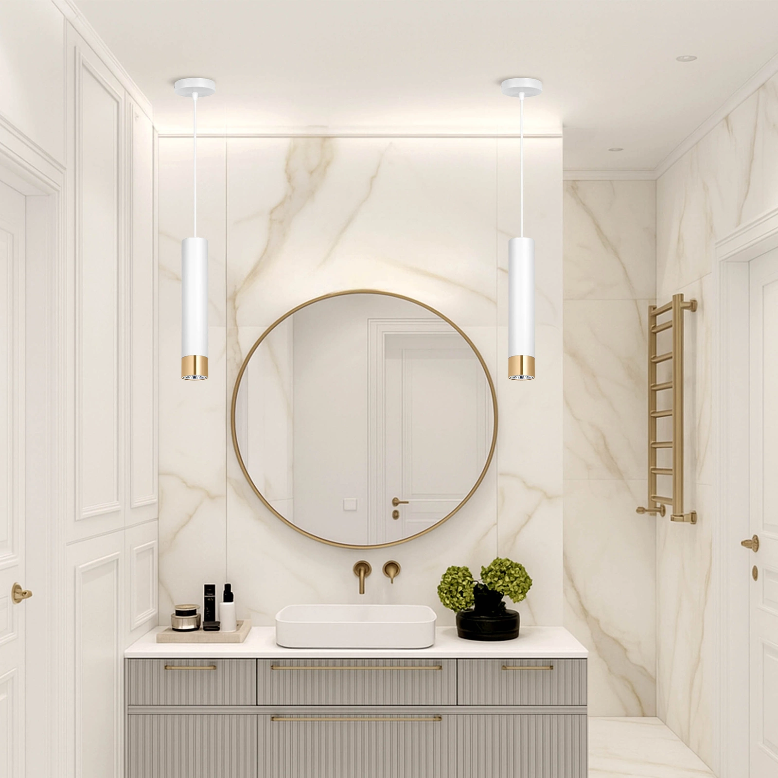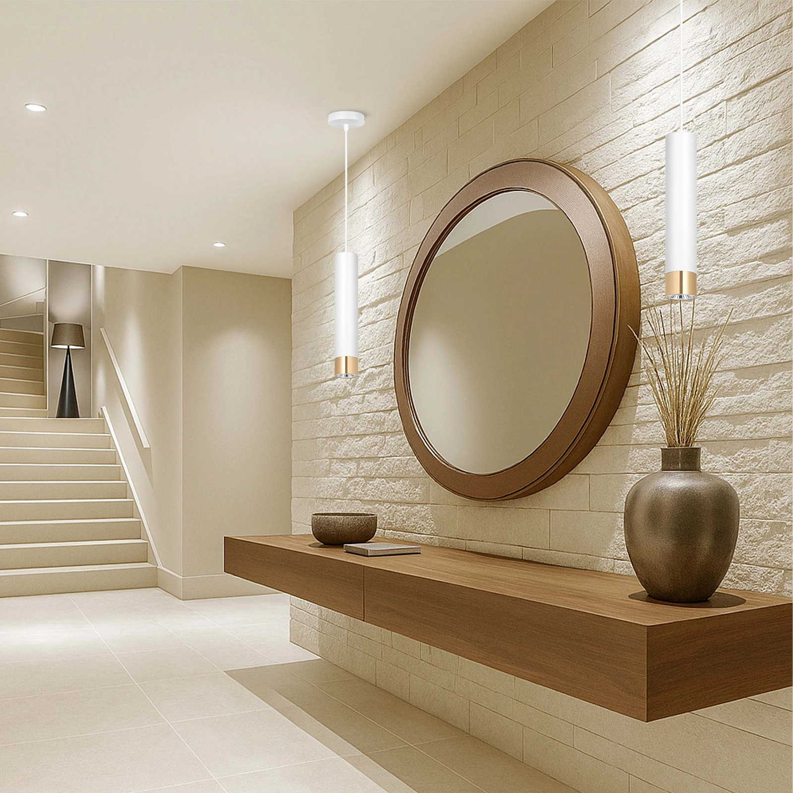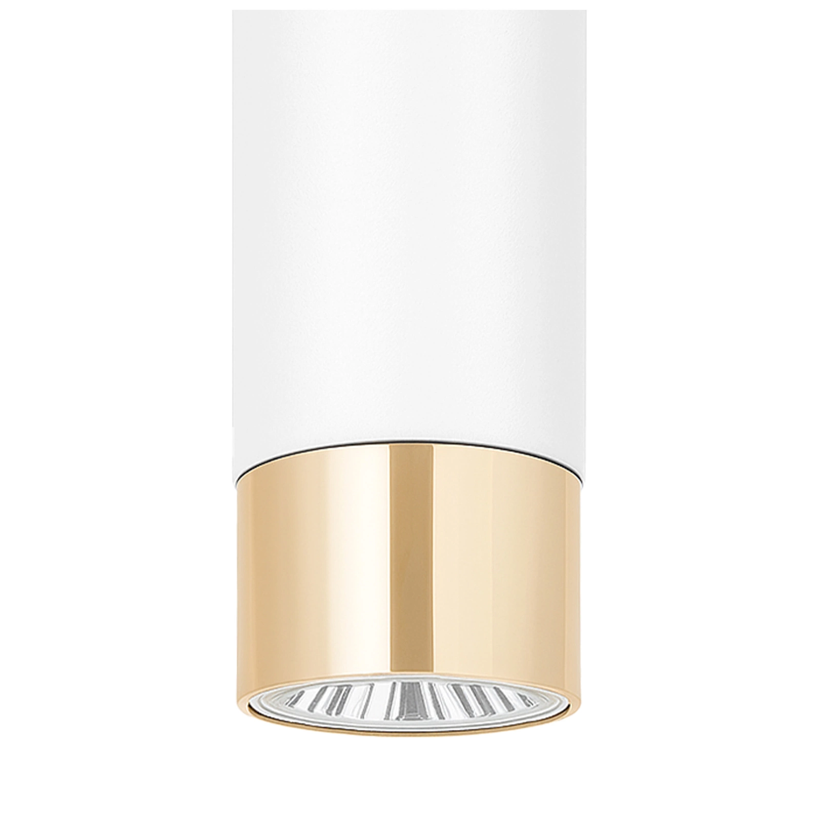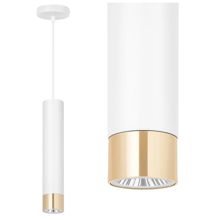 Smukła, cylindryczna forma i połączenie matowej bieli ze złotym pierścieniem tworzą ponadczasowy duet. Ta oprawa pięknie wpisuje się w nowoczesne i skandynawskie aranżacje – solo albo w szeregu nad wyspą. Regulowana długość przewodu pozwala idealnie dopasować wysokość do Twojej przestrzeni.