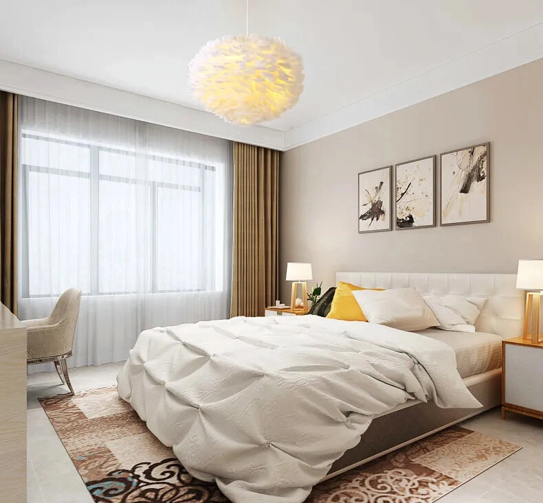 Rozproszone światło: Dzięki piórom zamocowanym na lampie, światło jest delikatnie rozpraszane, tworząc przyjemną, przytulną atmosferę w pomieszczeniu. To idealne rozwiązanie do sypialni, salonu czy jadalni.