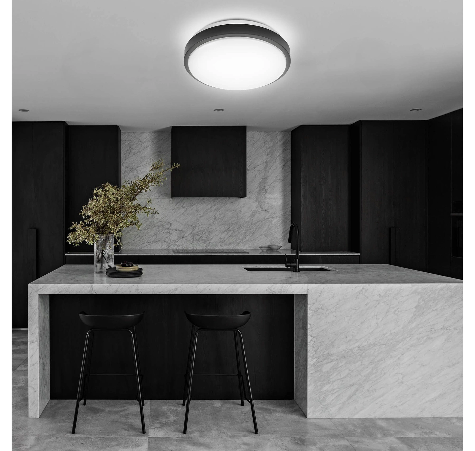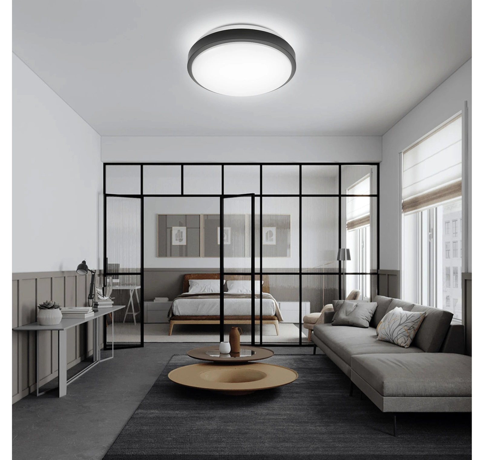 - ✅ Stylowa konstrukcja: Okrągły plafon w eleganckim kolorze mlecznobiałym z subtelną czarną wstawką.