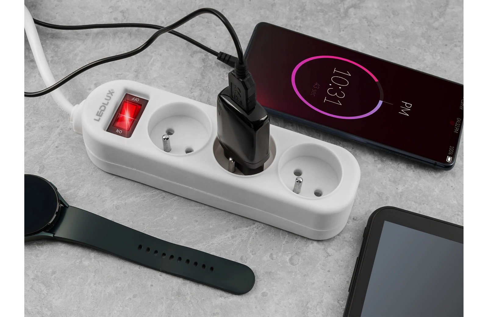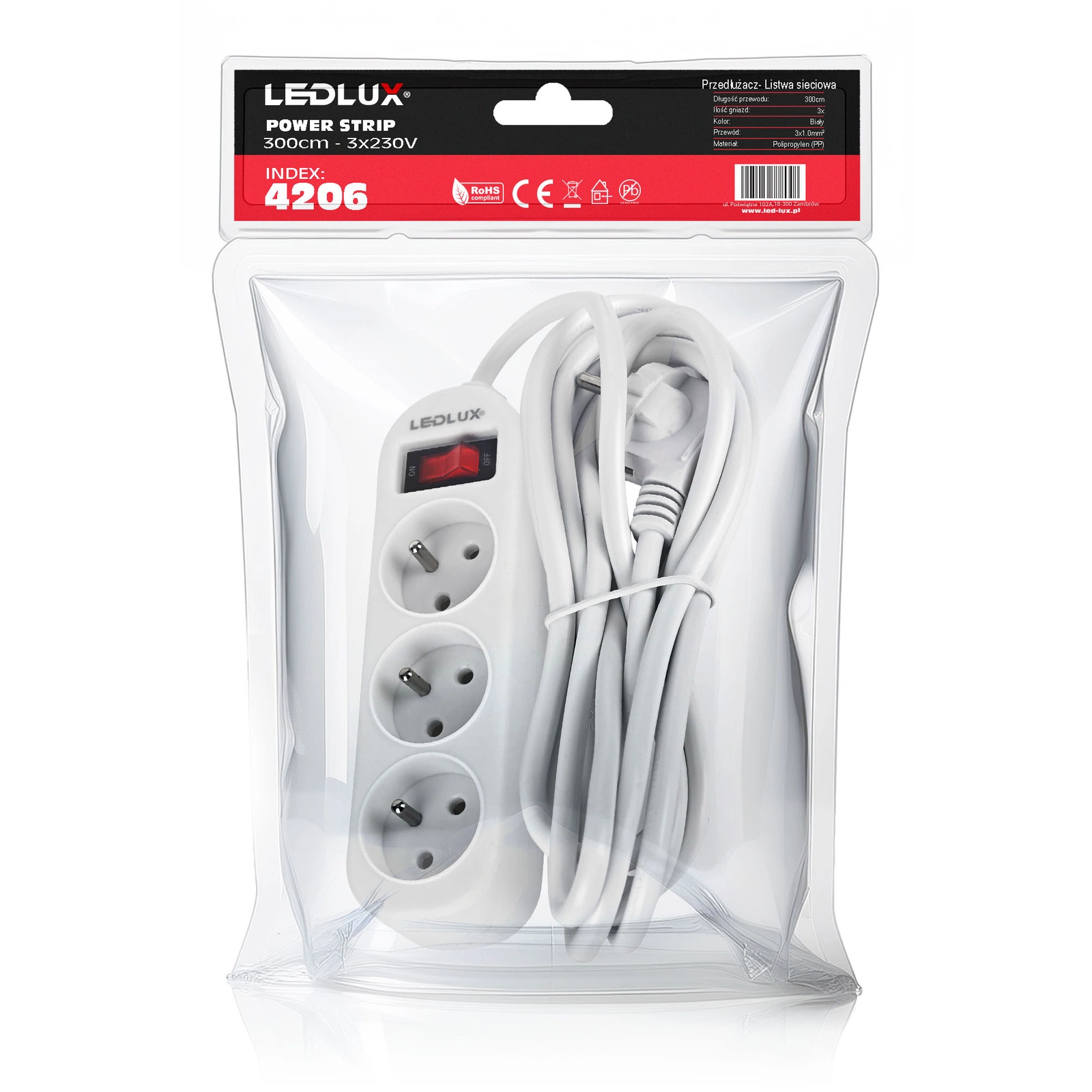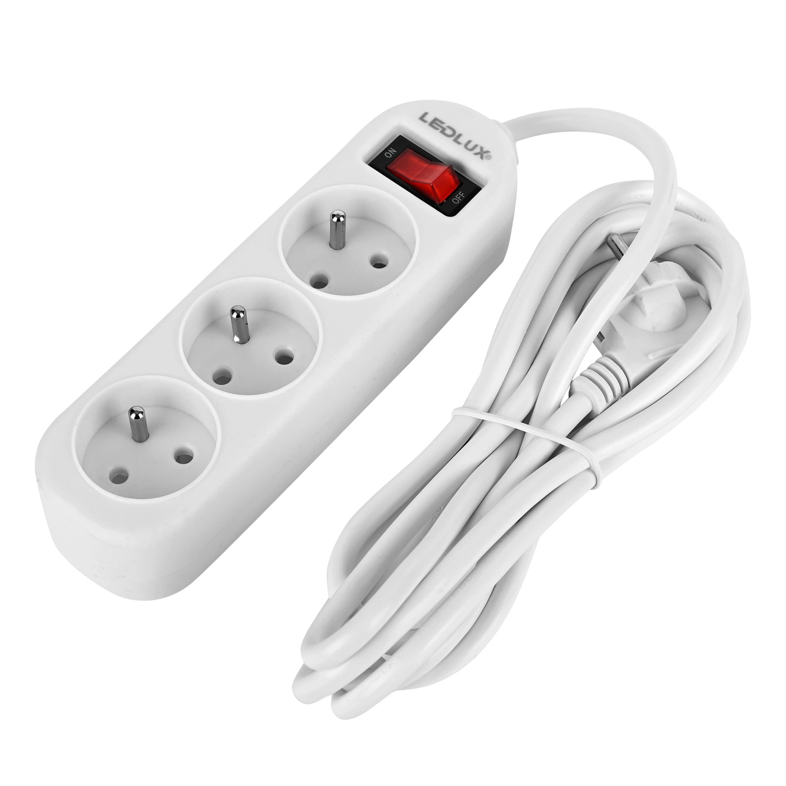 Przedłużacz sieciowy LEDLUX z trzema gniazdami przeznaczony do użytku domowego. Przedłużacz pozwala na podłączenie do prądu urządzeń znajdujących się pewnej odległości od gniazdka elektrycznego. Przedłużacz posiada 3 gniazda obrócone pod kątem dla jeszcze większej wygody użytkowania oraz włącznik, który umożliwia szybkie wyłączenie urządzeń bez potrzeby odłączania listwy od źródła zasilania.