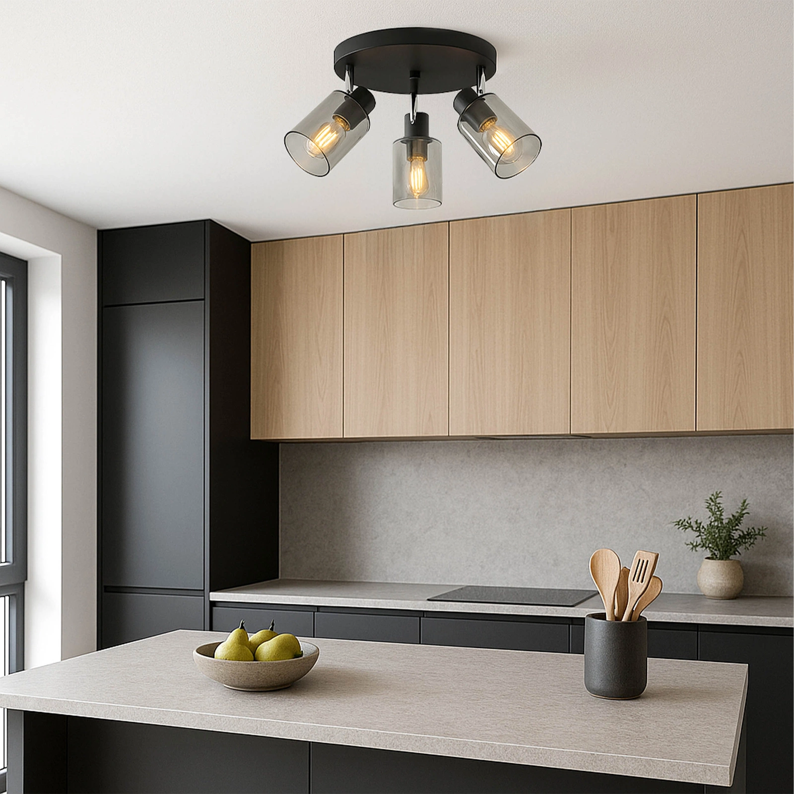 - Zobacz lampę w akcji – inspiracje aranżacyjne ️ ◾️ W salonie – zamontowana centralnie lub nad sofą, tworzy przytulną strefę wypoczynku. Gdy zapalisz żarówki filament, światło miękko rozlewa się po ścianach przez delikatnie przydymione szkło. ️ ◾️ W kuchni – trzy klosze obracają się niezależnie, dzięki czemu możesz doświetlić blat roboczy, wyspę kuchenną i strefę jadalnianą jednocześnie. To doskonałe rozwiązanie, jeśli gotujesz i spędzasz czas z rodziną przy wspólnym stole. ◾️ W przedpokoju lub korytarzu – niskoprofilowa konstrukcja nie zabiera przestrzeni, a daje mocne, kierunkowe światło. Świetnie eksponuje elementy wystroju: lustra, obrazy, wnęki.