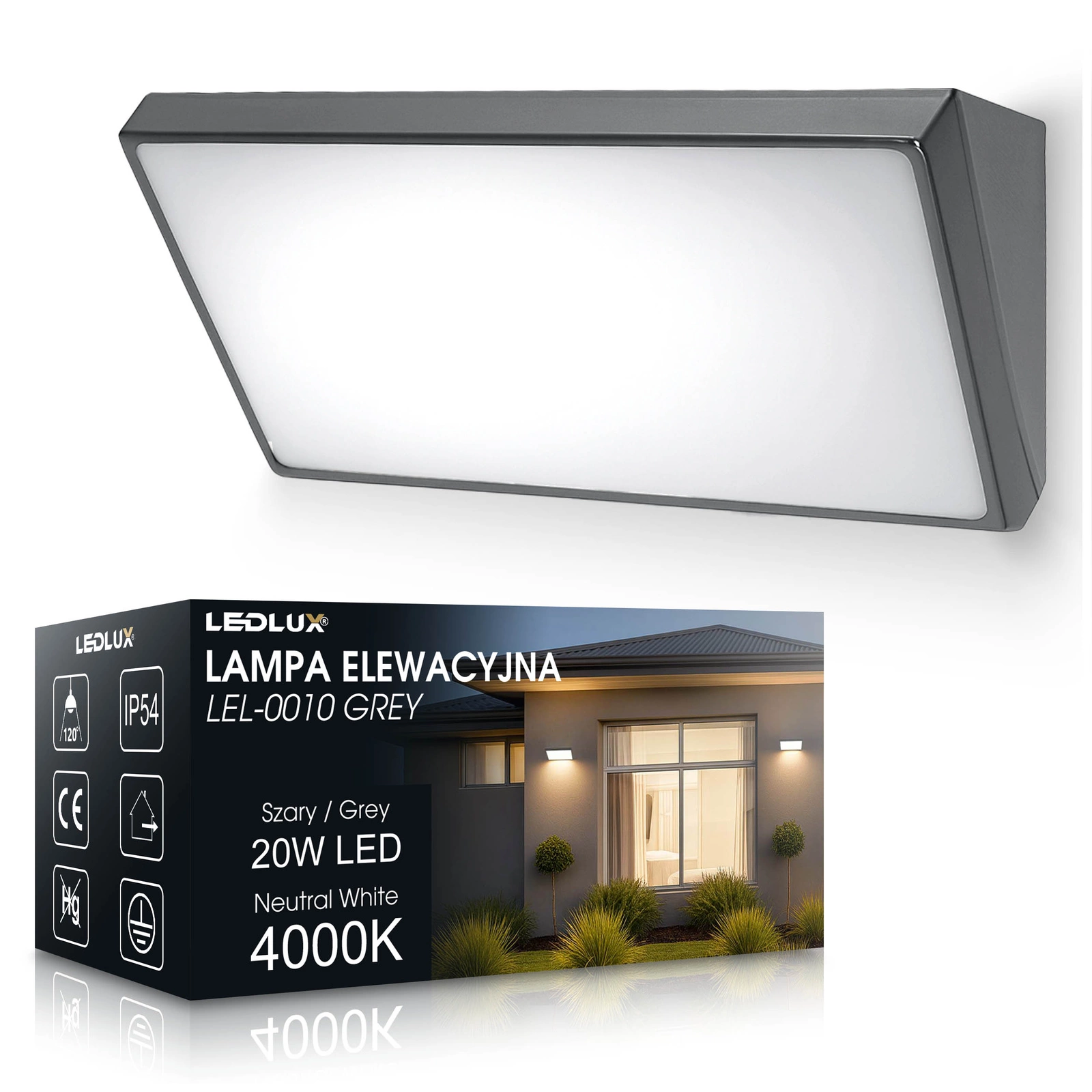 Prosta, geometryczna forma w szarym macie i mleczny klosz sprawiają, że model LEL-0010 GREY harmonijnie dopełnia nowoczesną architekturę. Zintegrowany moduł LED 20 W emituje jasne światło 4000 K, idealne przy wejściu, na tarasie czy przy ogrodzie.
