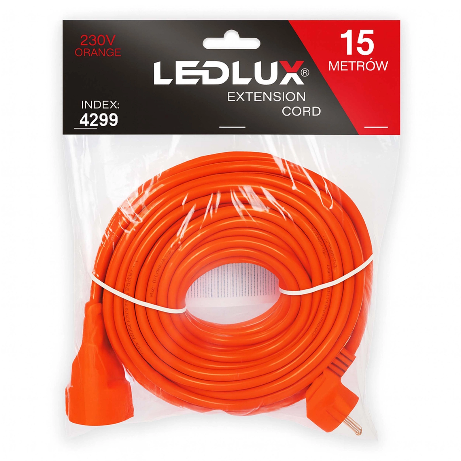 LEDLUX 15 m to widoczny, pomarańczowy przewód z 1 gniazdem z uziemieniem. Zapewnia bezpieczne podłączenie urządzeń w ogrodzie, garażu, warsztacie i na budowie. Przeznaczony do użytkowania wyłącznie w suchych warunkach (IP20).