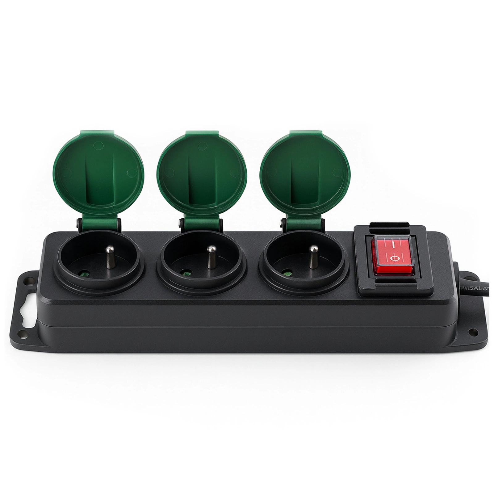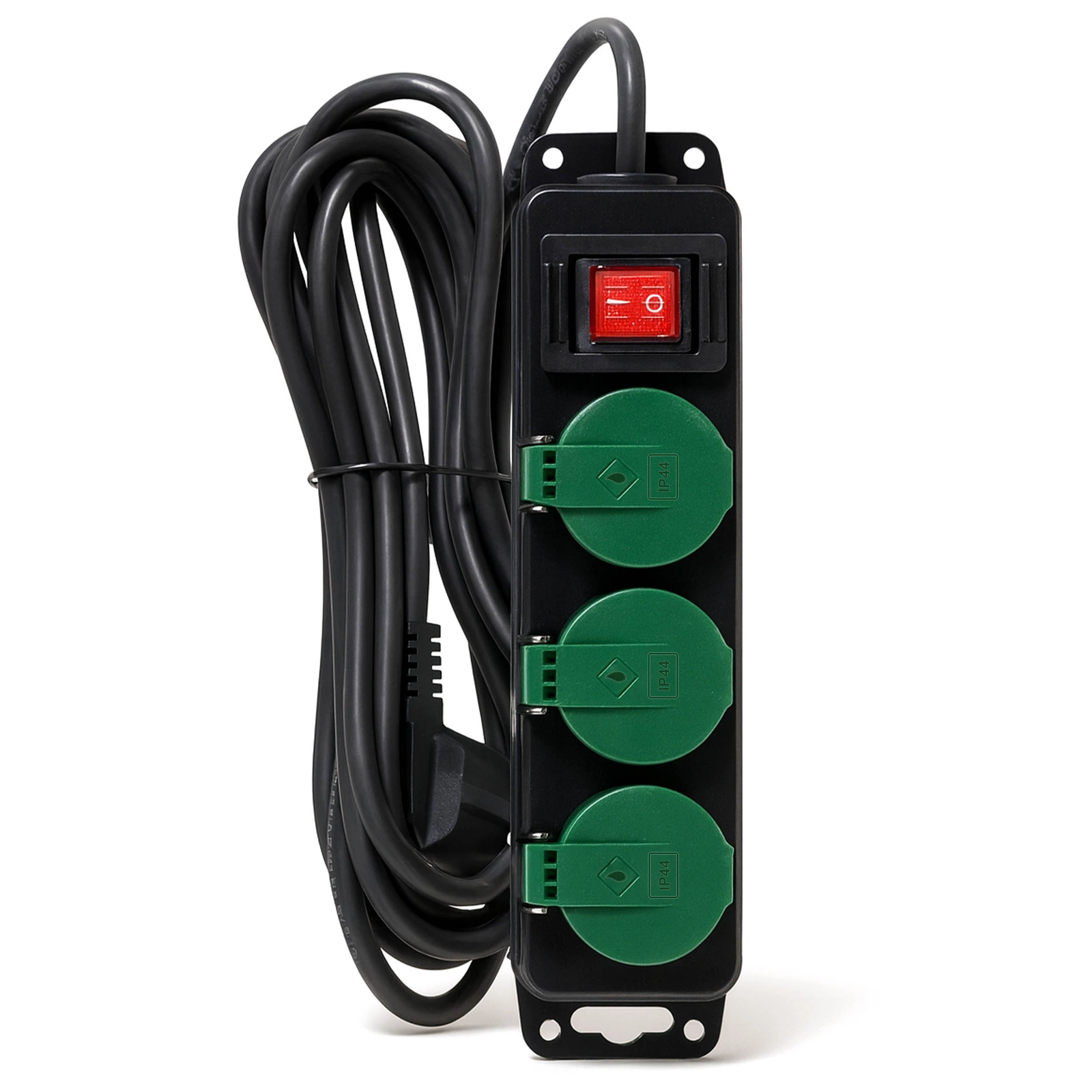 Listwa z 3 gniazdami 230V, kablem 5 m i włącznikiem ON/OFF. Klapki zabezpieczają gniazda przed kurzem i przypadkowym zabrudzeniem – idealna do pracy w miejscach osłoniętych.