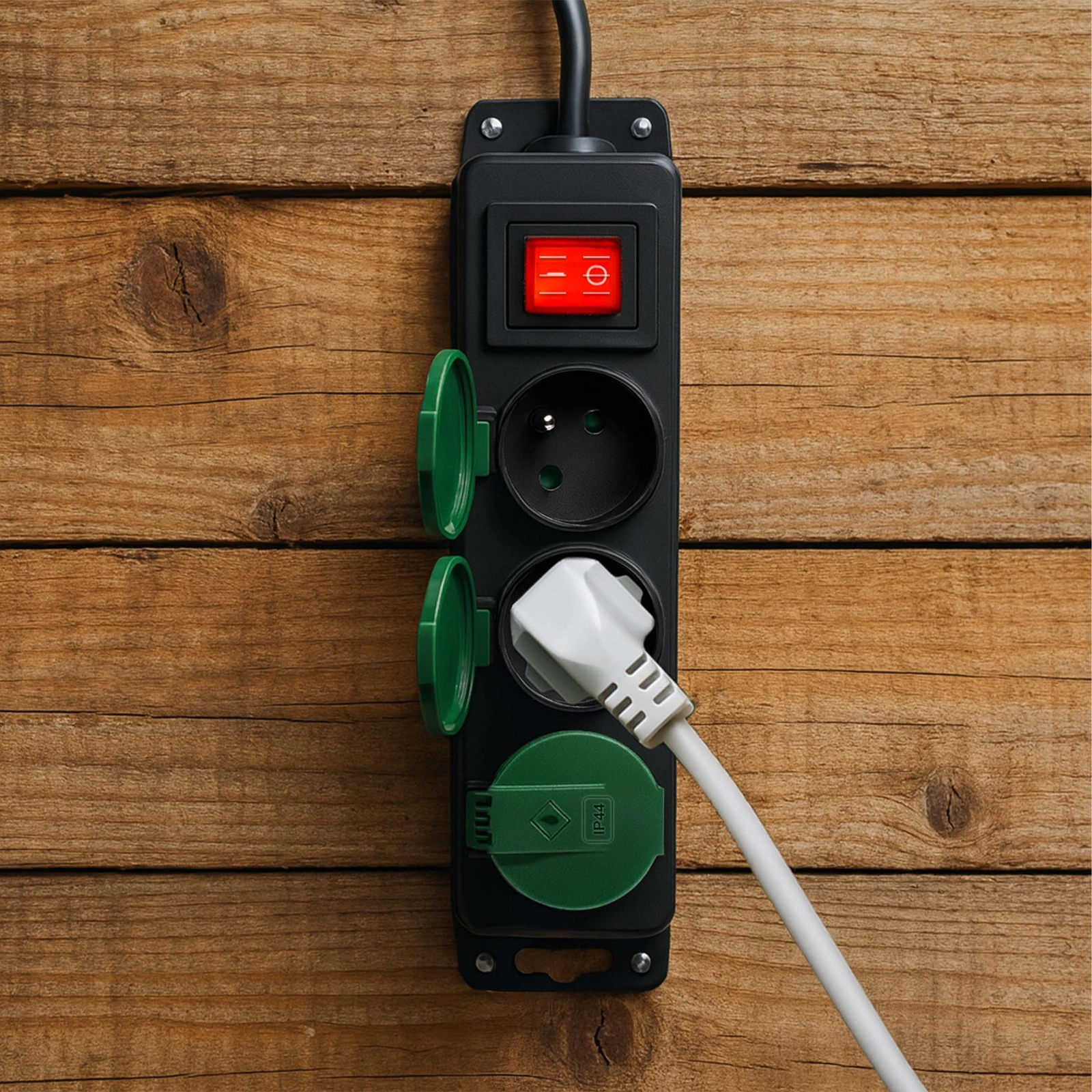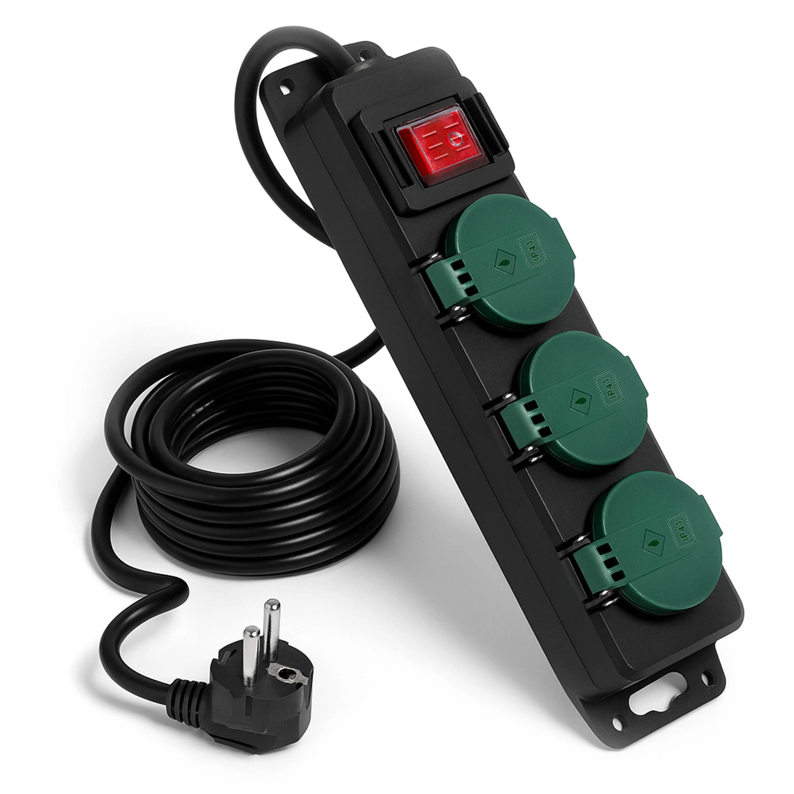 Listwa z 3 gniazdami 230V, kablem 10 m i włącznikiem ON/OFF. Klapki zabezpieczają gniazda przed kurzem i przypadkowym zabrudzeniem – idealna do pracy w miejscach osłoniętych.