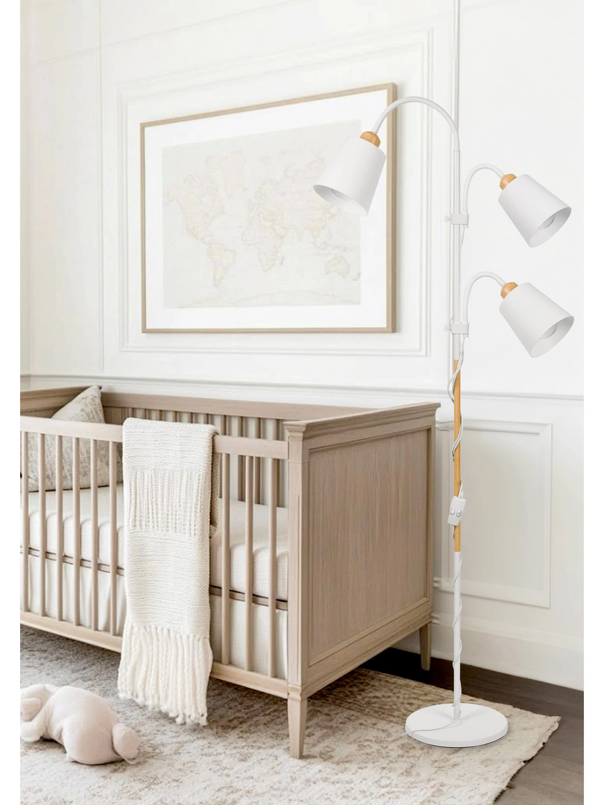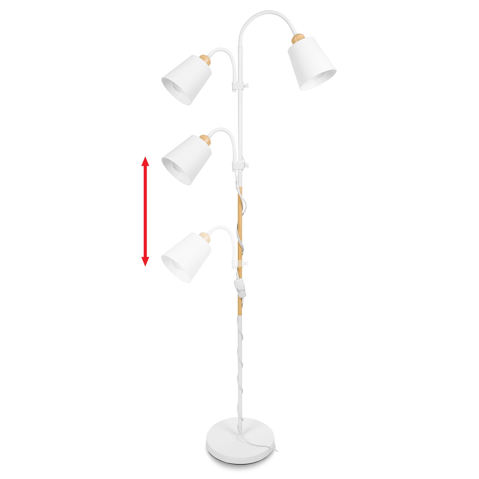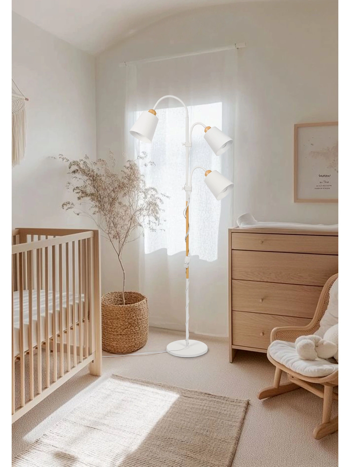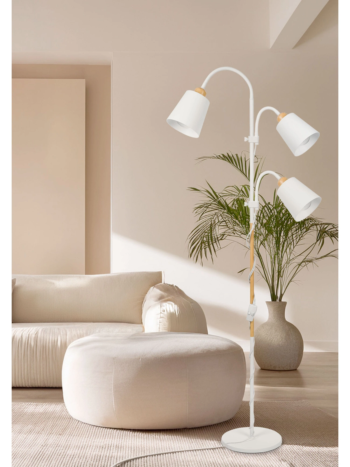 Elegancka lampa podłogowa LEDLUX z 3 kloszami tworzy jednocześnie światło ogólne i punktowe. Smukła sylwetka w białym macie przełamana akcentami w kolorze drewna – to metal malowany na wzór drewna – idealnie wpisuje się w styl scandi, loft i nowoczesny minimalizm.