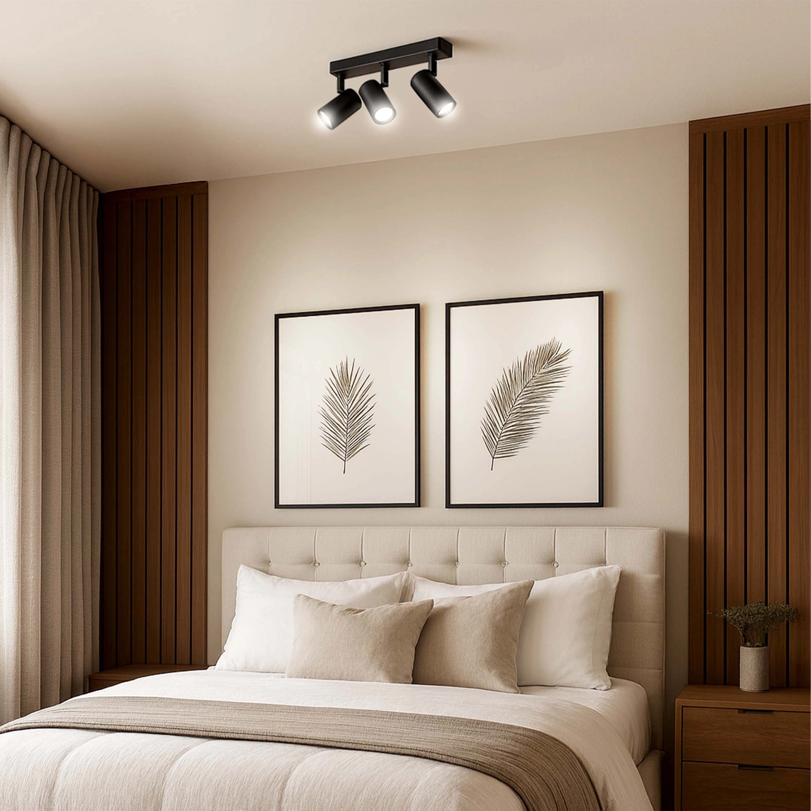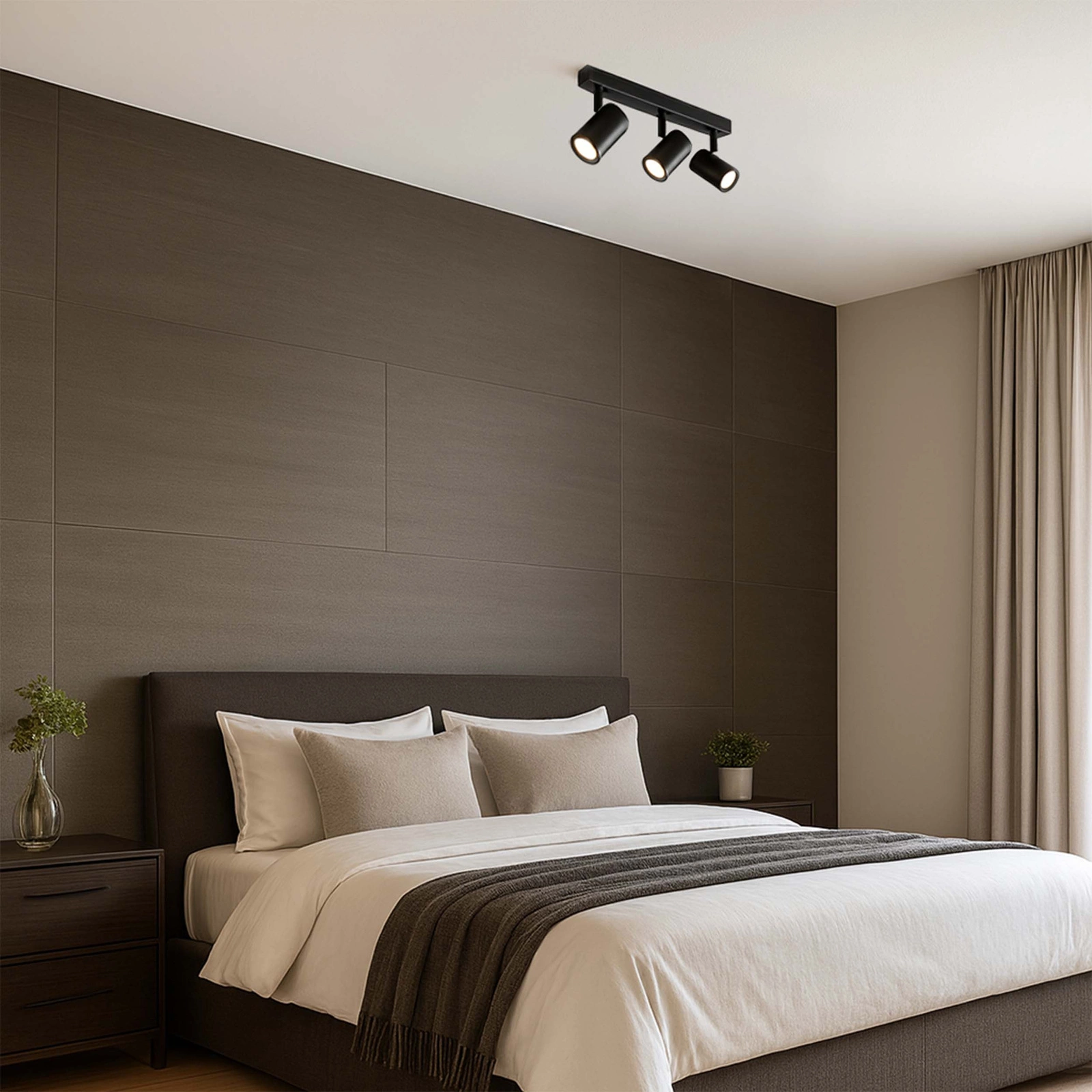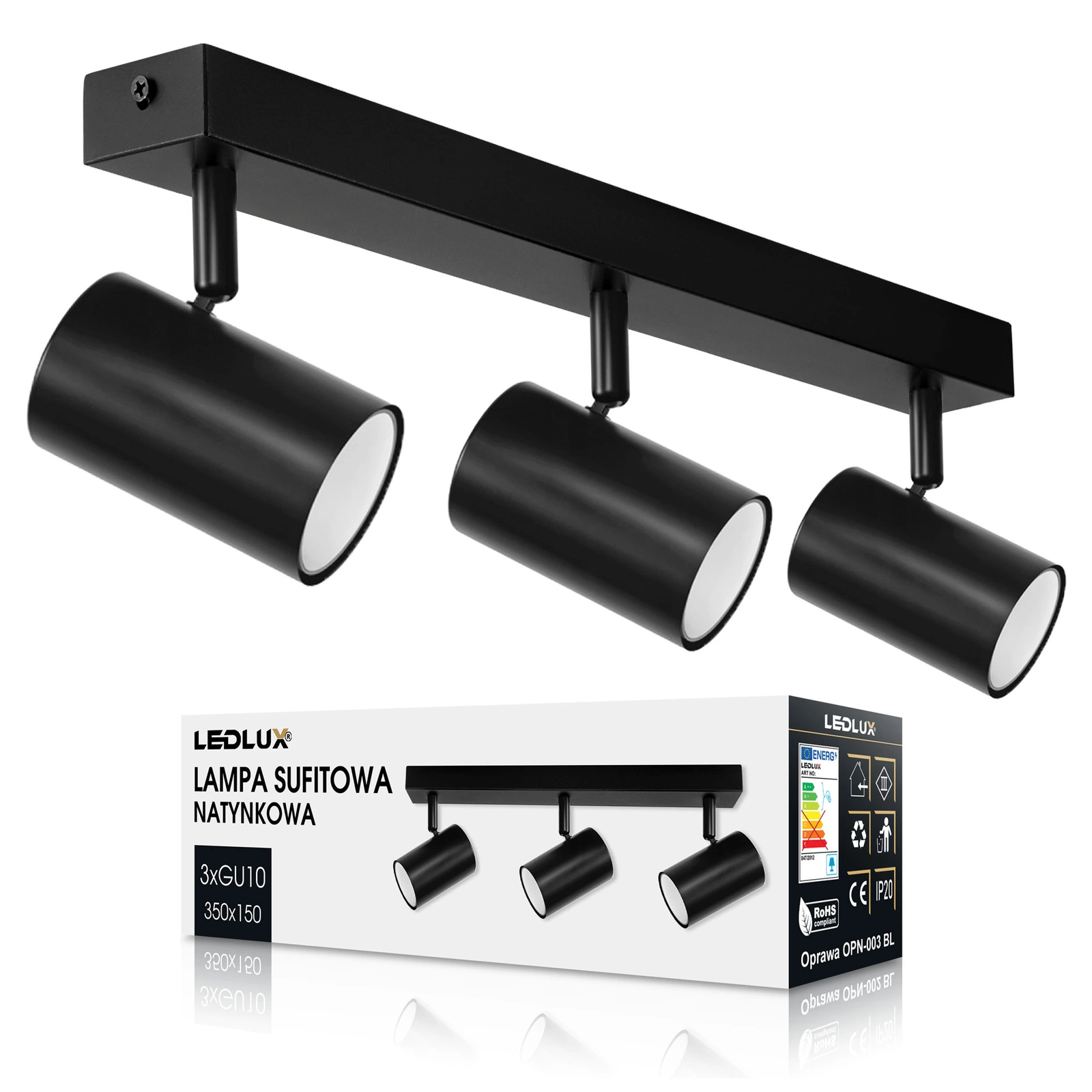 Minimalistyczna listwa LEDLUX 3×GU10 w czarnym kolorze świetnie doświetli blat, stół lub korytarz. Trzy ruchome tuby pozwalają prowadzić strumień światła dokładnie tam, gdzie go potrzebujesz, a niska konstrukcja (ok. 15 cm) pasuje także do niższych wnętrz.