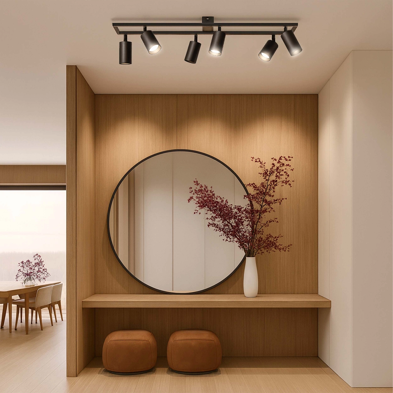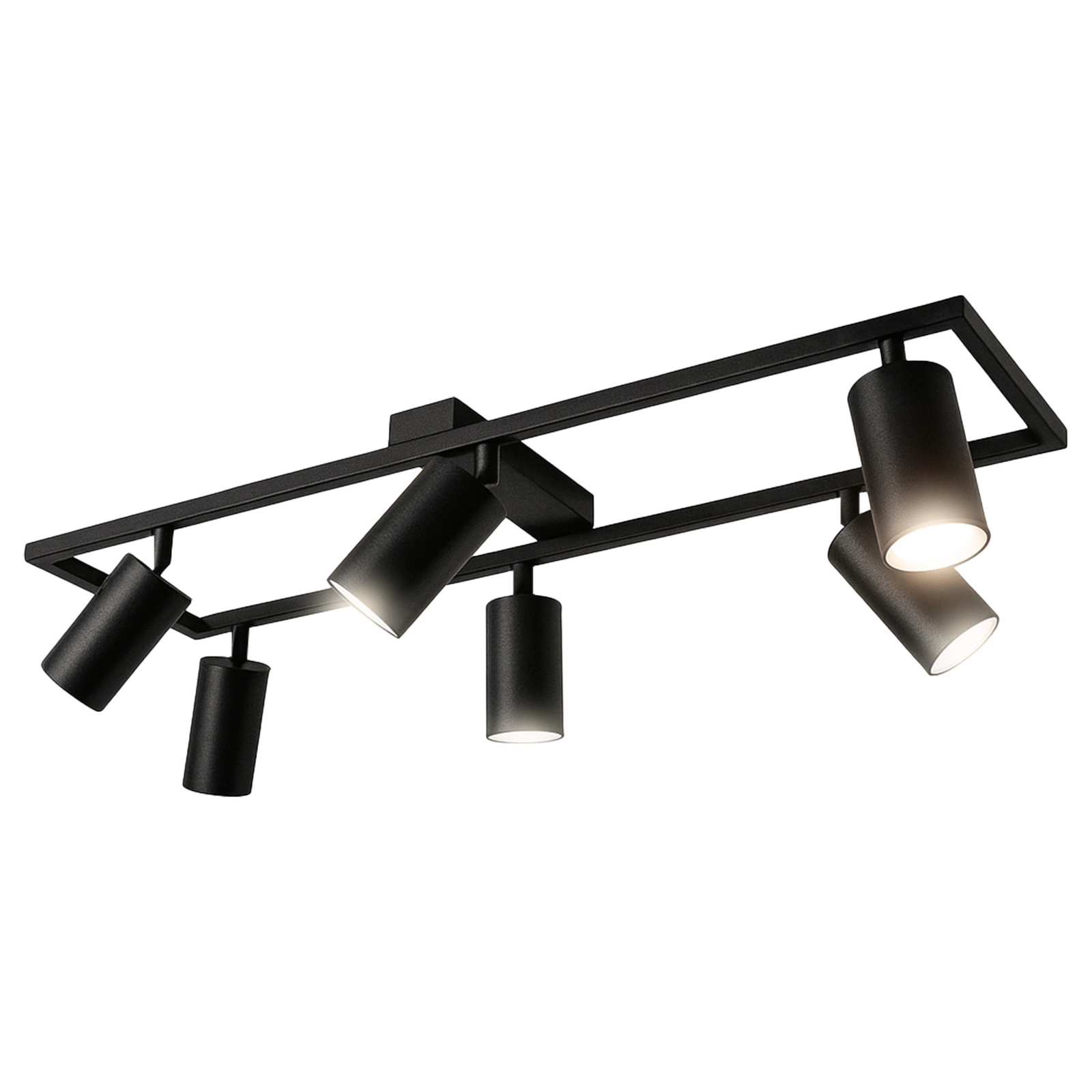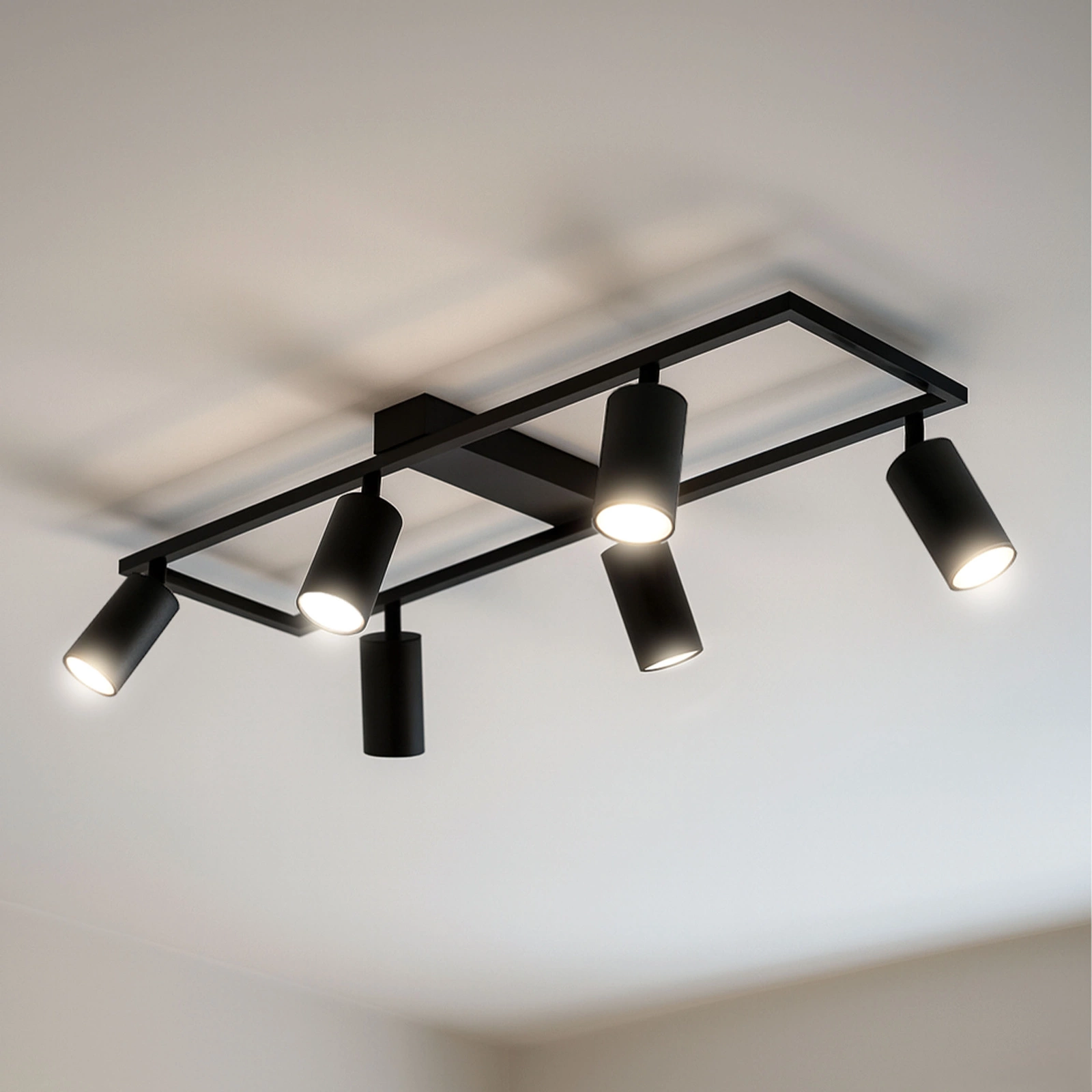 Nowoczesny plafon LEDLUX 6×GU10 łączy graficzną formę z pełną kontrolą nad światłem. Sześć ruchomych tub (obrót ok. 300° i wychylenie do 180°) pozwala oświetlić blat, wyspę czy ekspozycję z chirurgiczną precyzją. Czarny mat i smukła rama 80 cm wprowadzają loftowy charakter do kuchni, salonu i biura.