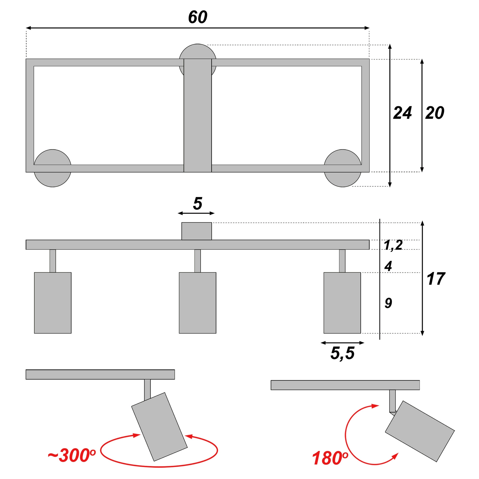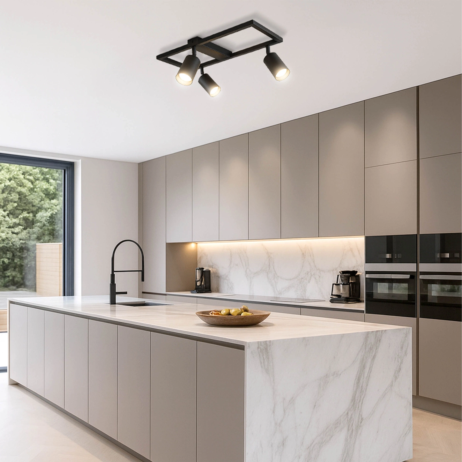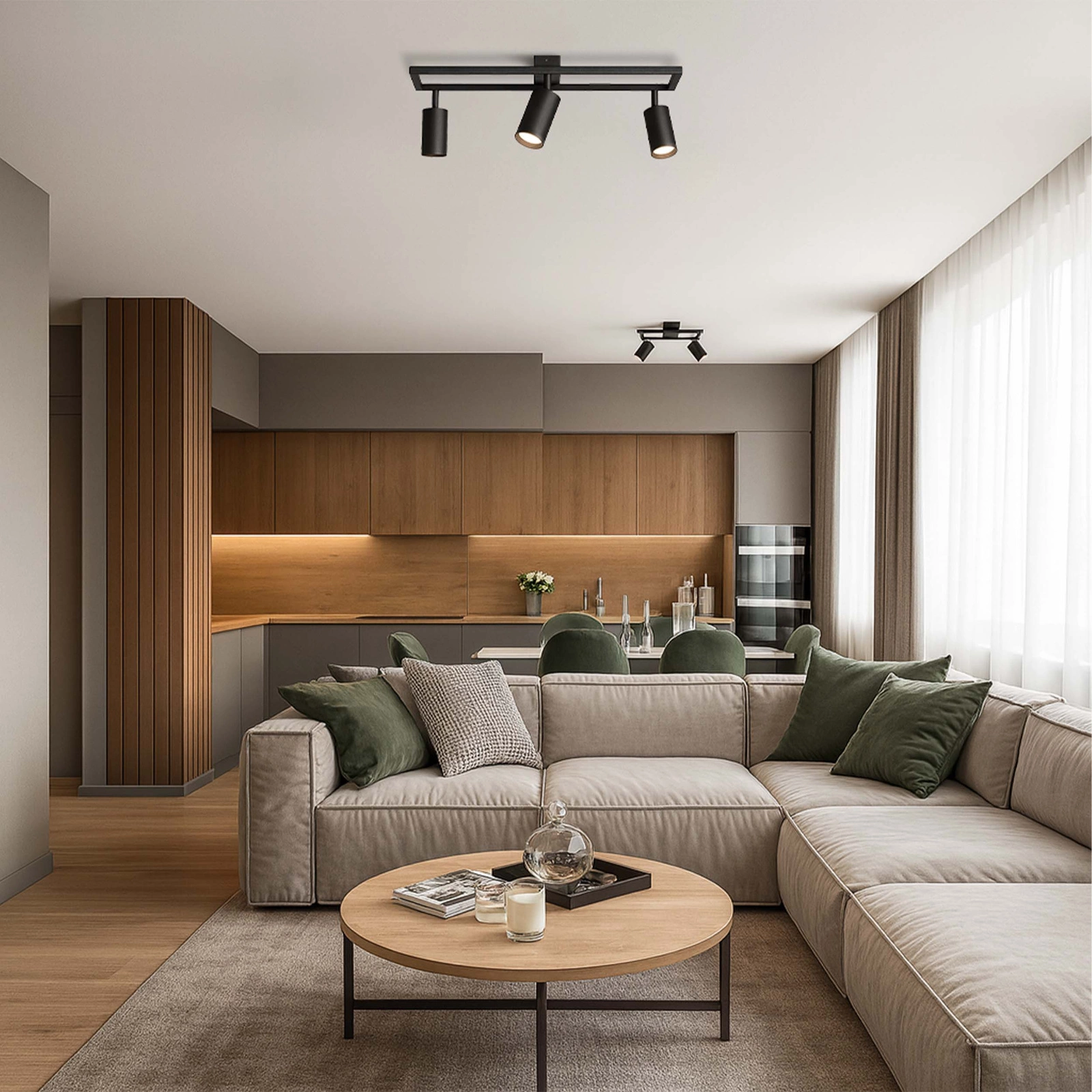 Prosta, graficzna rama o wymiarach 60×24 cm mieści trzy niezależne reflektory GU10. Każdą tubę ustawisz pod idealnym kątem (obrót ok. 300°, wychylenie do 180°), dzięki czemu łatwo doświetlisz blat w kuchni, ścianę z obrazem czy korytarz. Matowa czerń nadaje wnętrzu loftowego, eleganckiego charakteru.