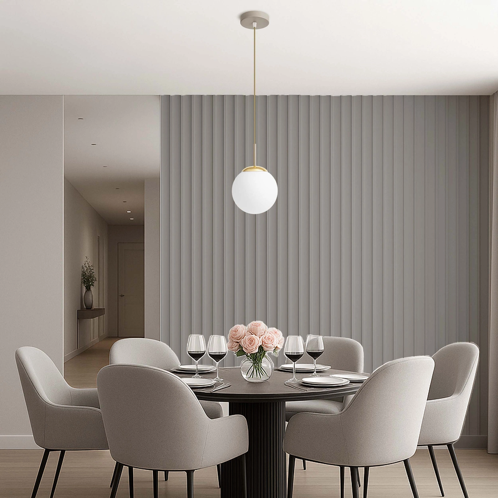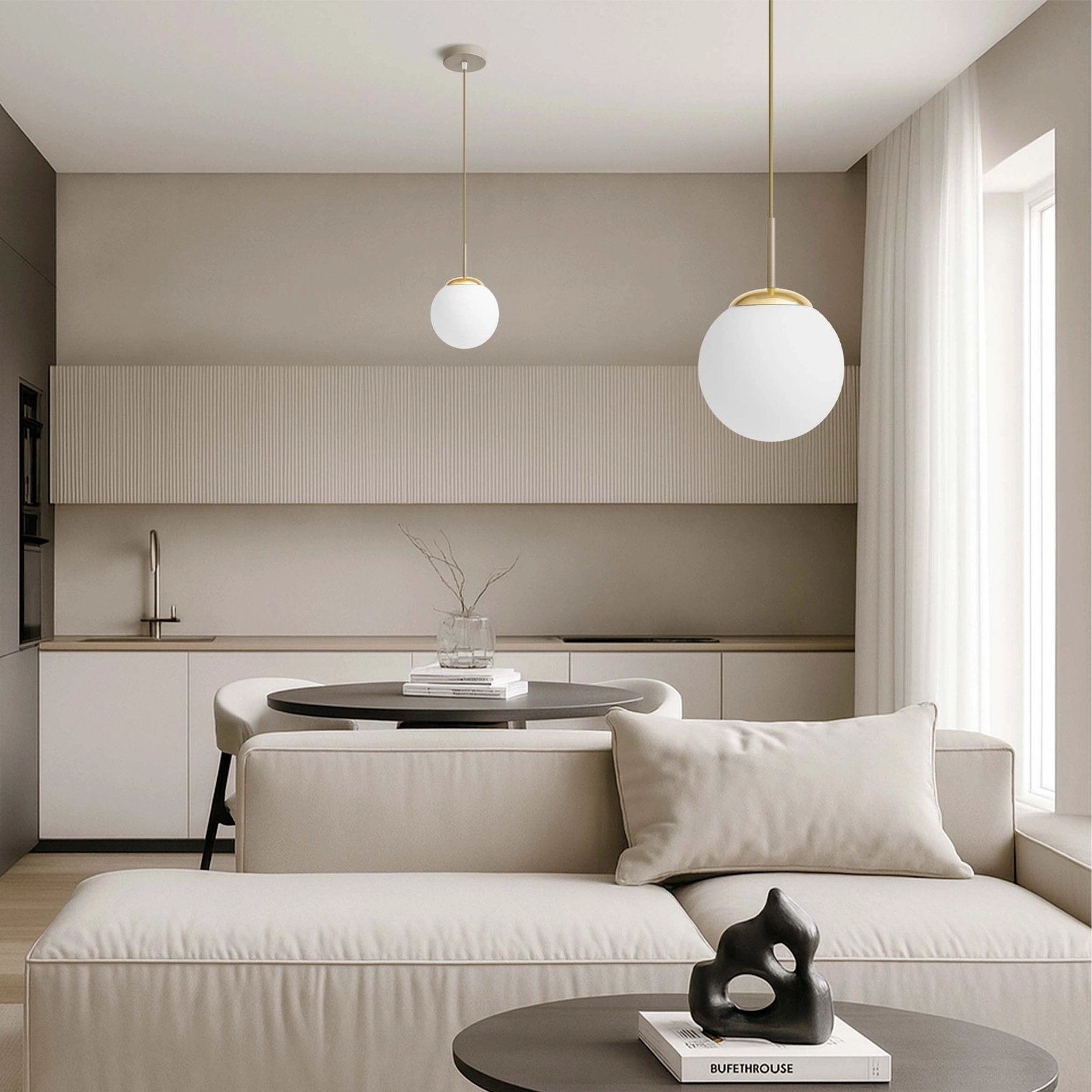 Minimalistyczna forma, złote wykończenie i mleczne szkło tworzą efektowny akcent w każdym wnętrzu – od salonu po kuchnię.