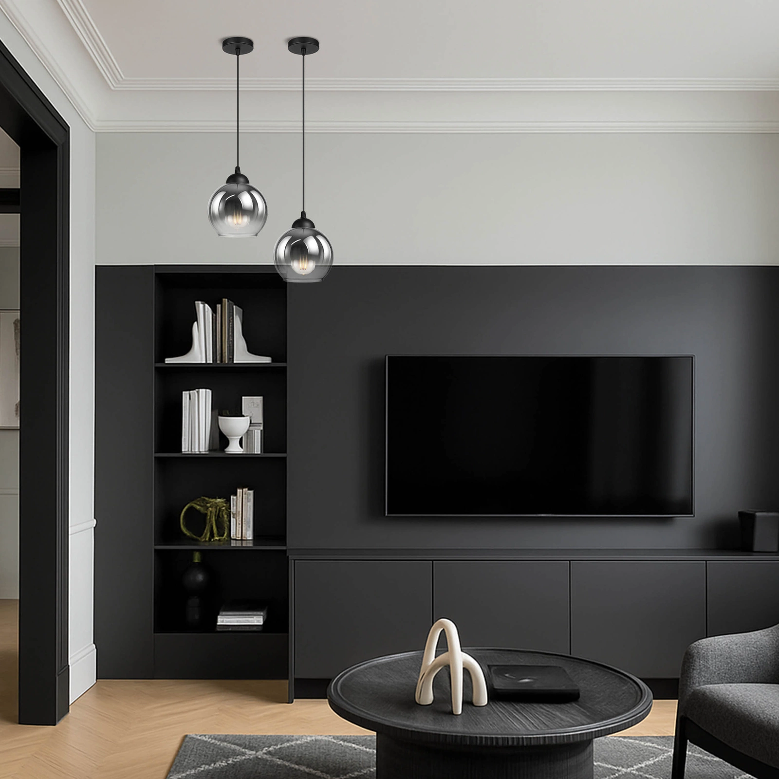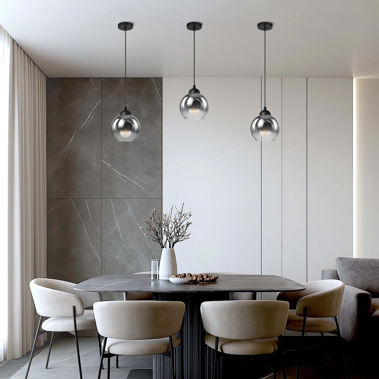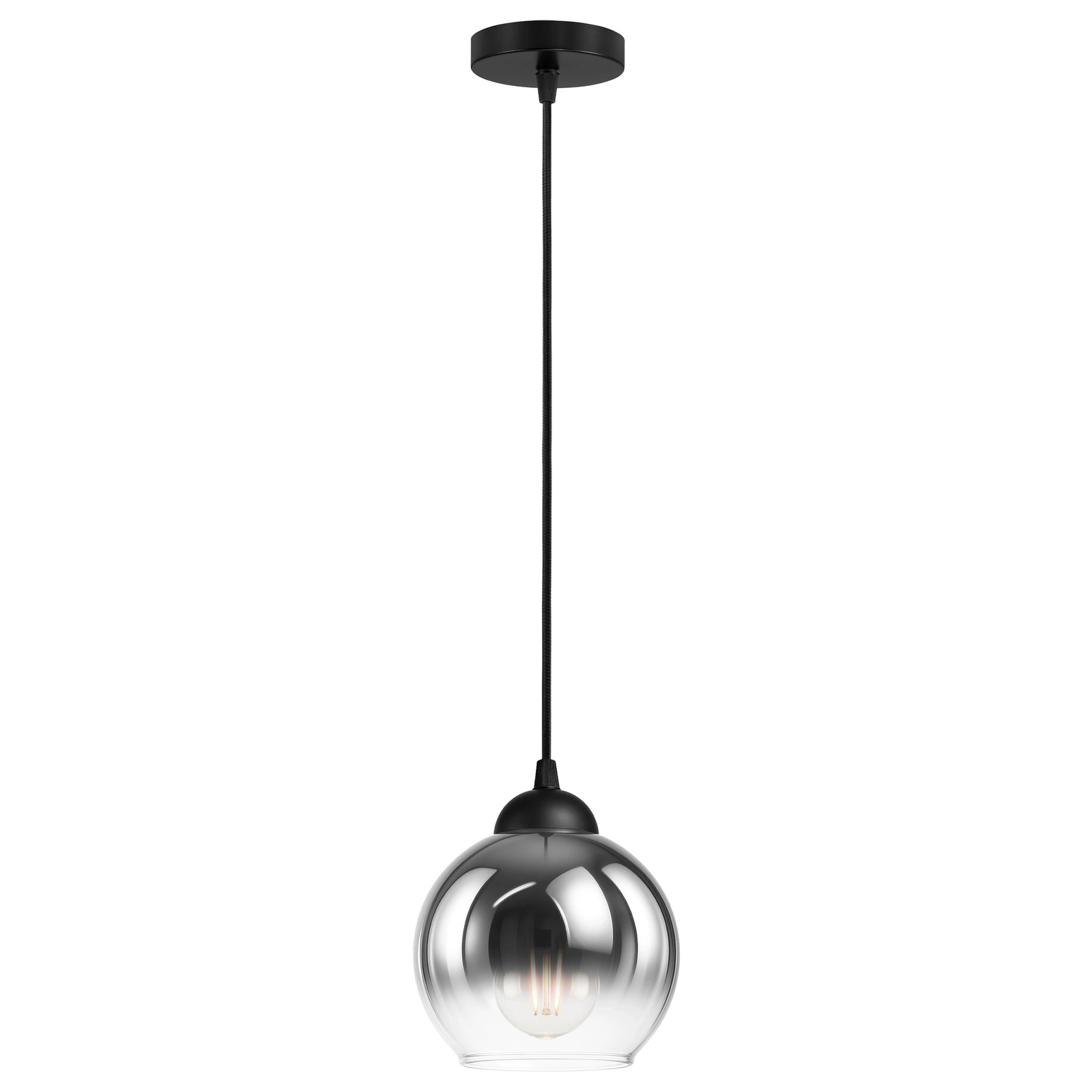 - ✔️ Nowoczesny design – kulisty klosz z dymionego szkła tworzy elegancki, ponadczasowy efekt pasujący do stylów: loft, industrial, nowoczesny i glamour.