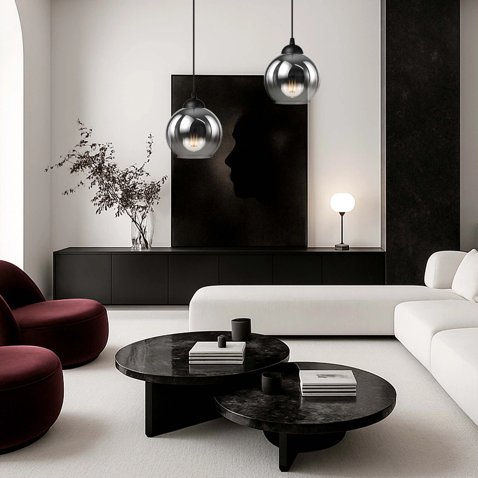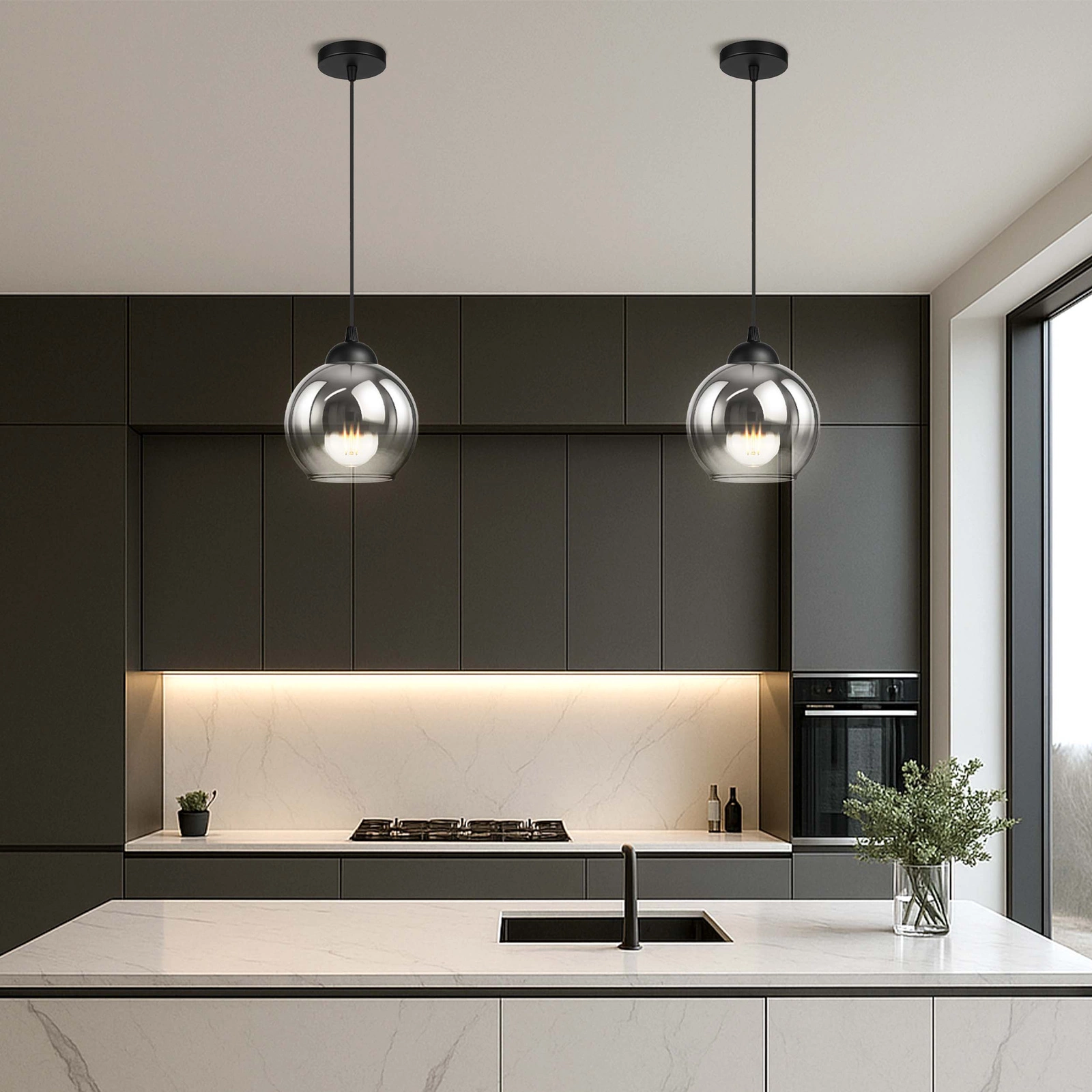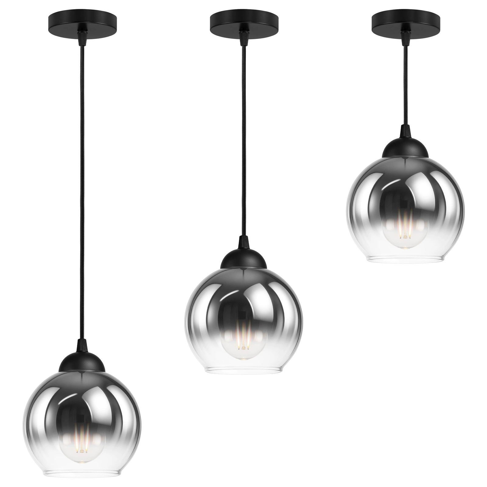 - ✔️ Nowoczesny design – kulisty klosz z dymionego szkła tworzy elegancki, ponadczasowy efekt pasujący do stylów: loft, industrial, nowoczesny i glamour.
