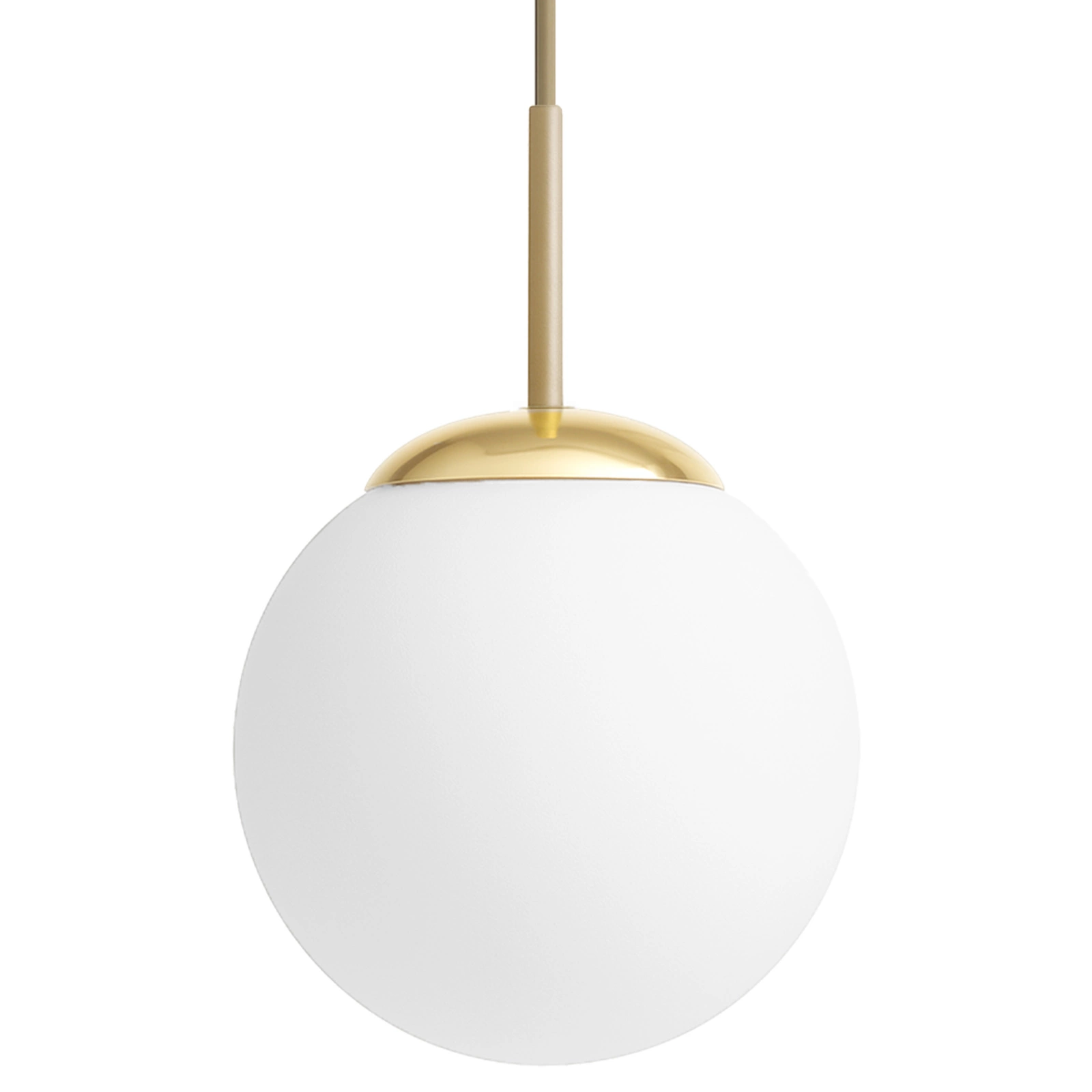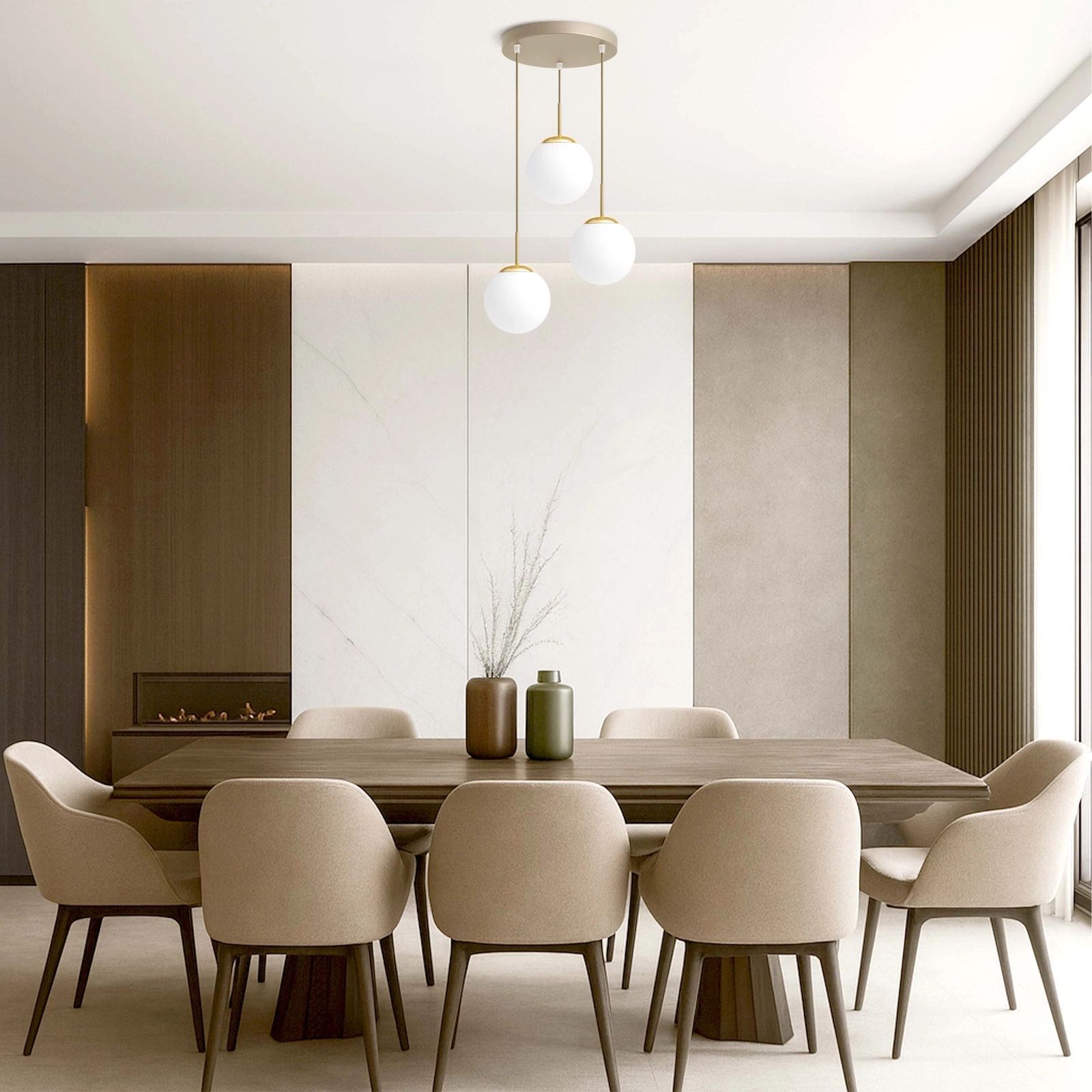 Jej prosta forma z trzema kulistymi kloszami ze szkła mlecznego w połączeniu z subtelnymi złotymi detalami tworzy oświetlenie, które idealnie wpisuje się w aktualne trendy wnętrzarskie.