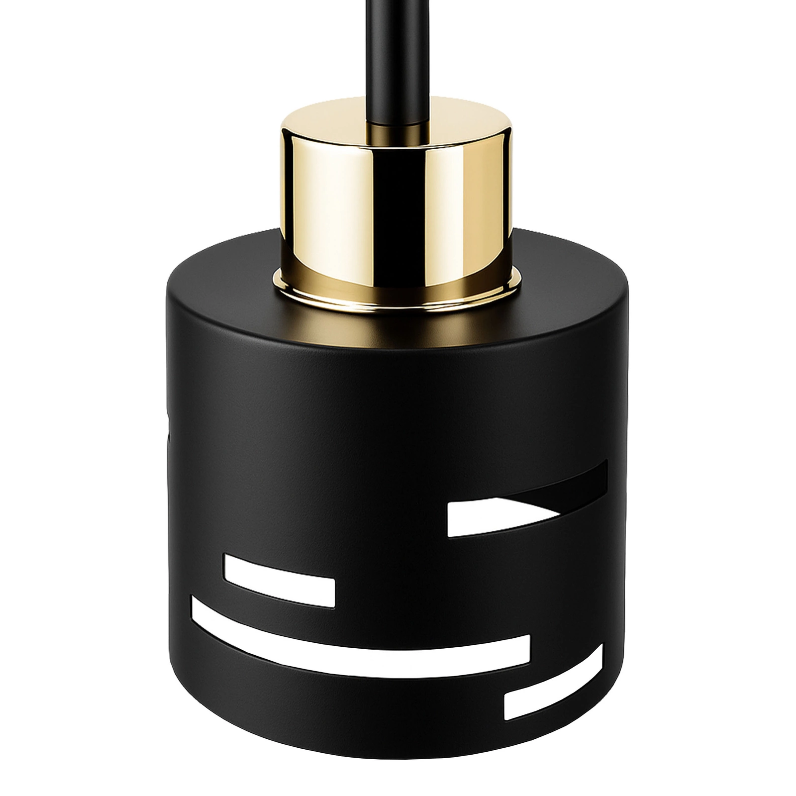 Metalowe klosze w matowym odcieniu czaerni, ozdobione złotymi pierścieniami i geometrycznymi wycięciami, pięknie przepuszczają światło, tworząc przyjemny efekt wizualny.
