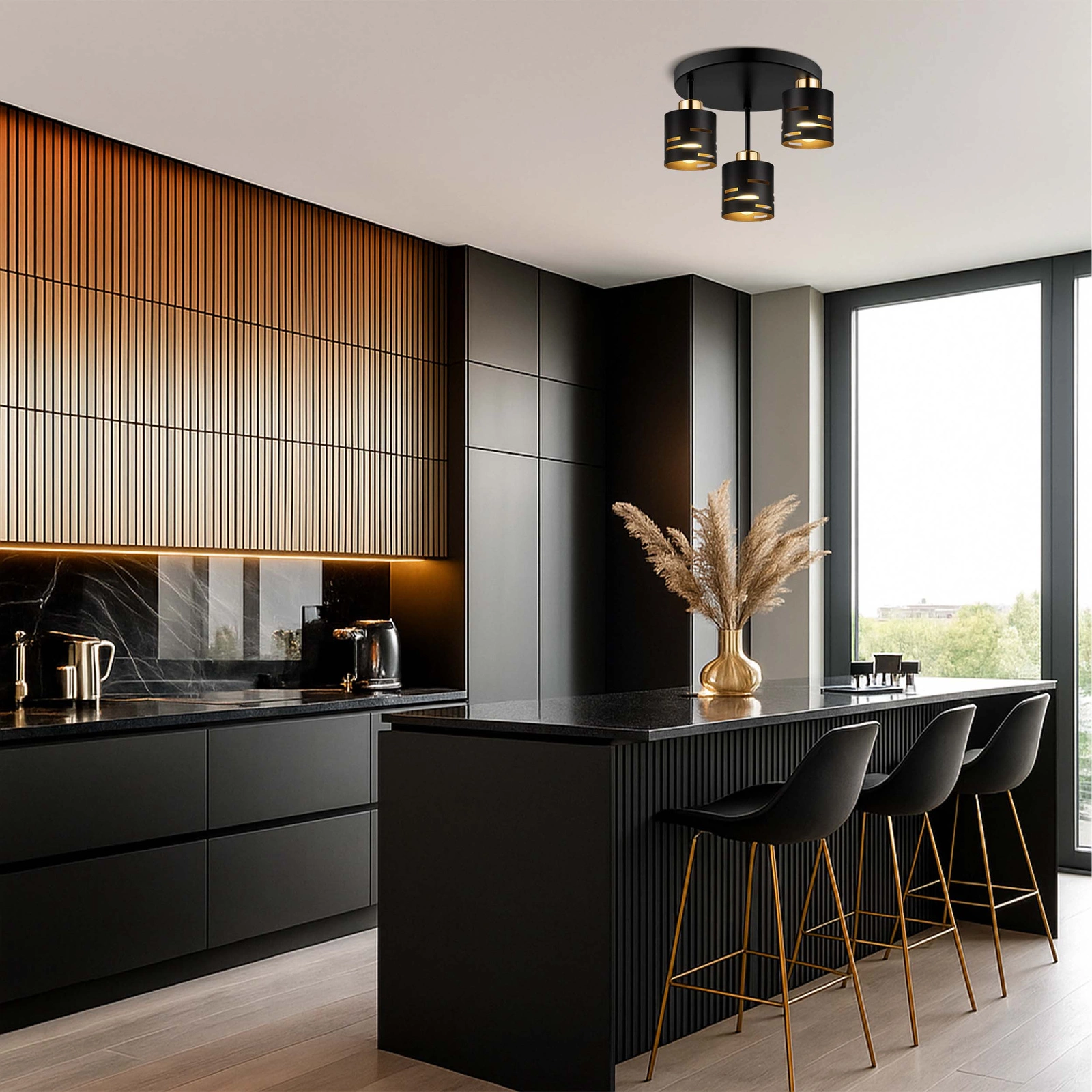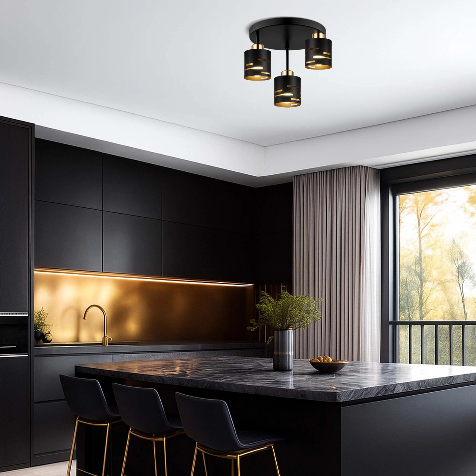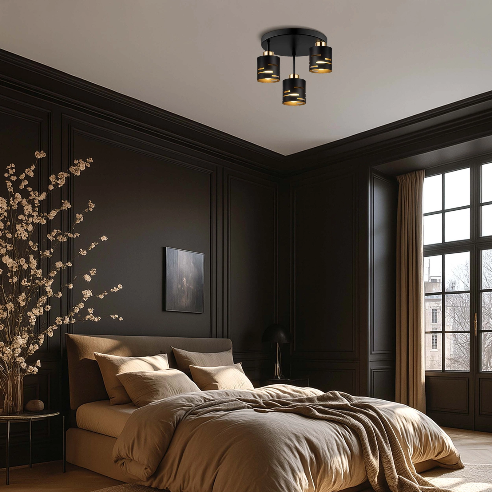 - Ta czarno-złota lampa sufitowa 3xE27 to eleganckie oświetlenie, które łączy funkcjonalność z wyjątkowym stylem.