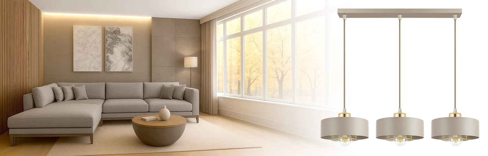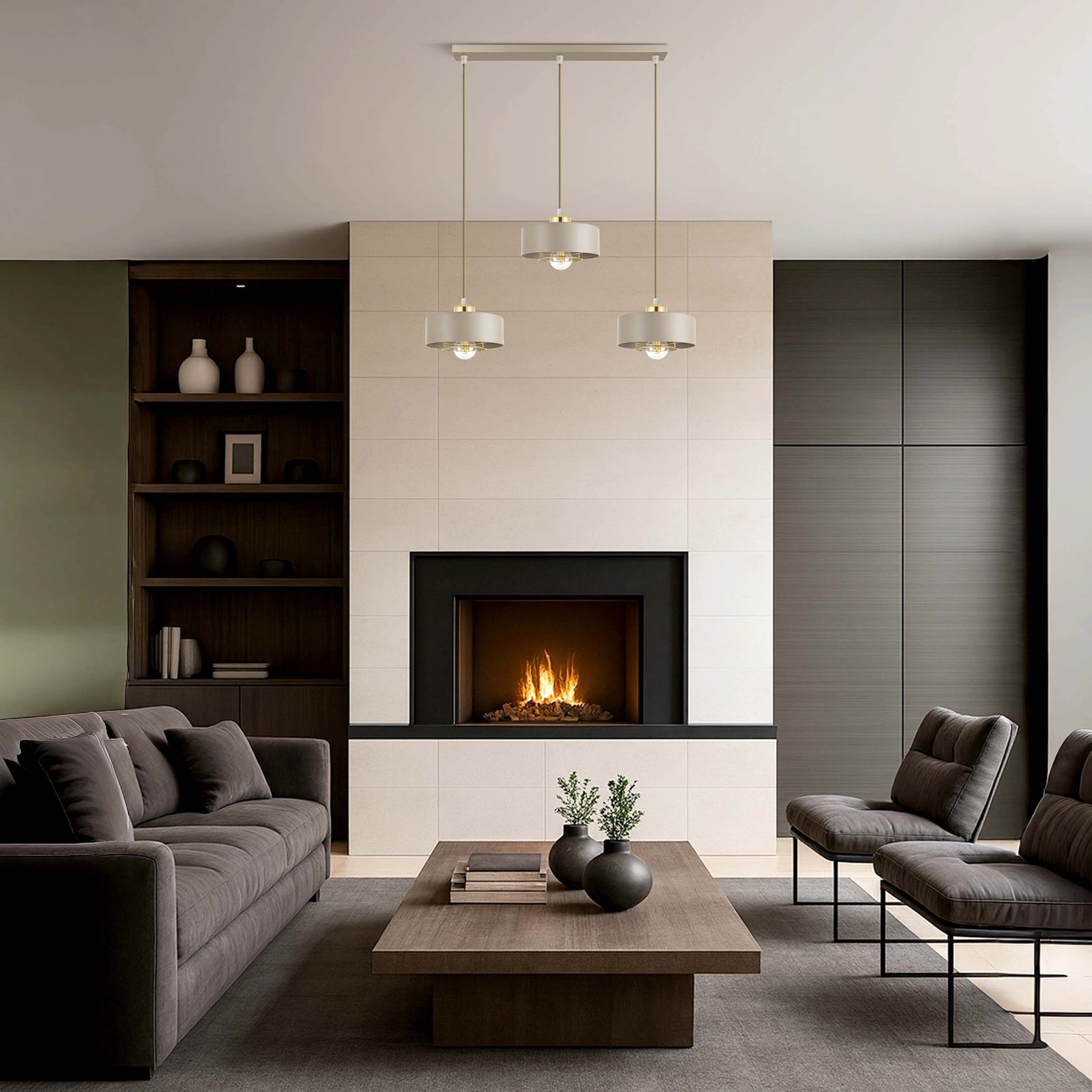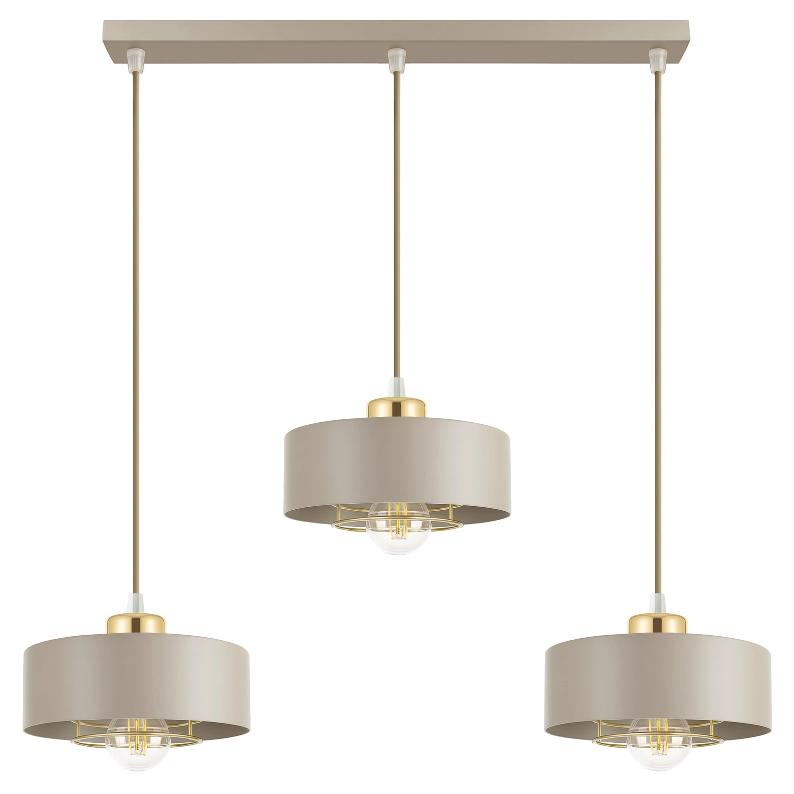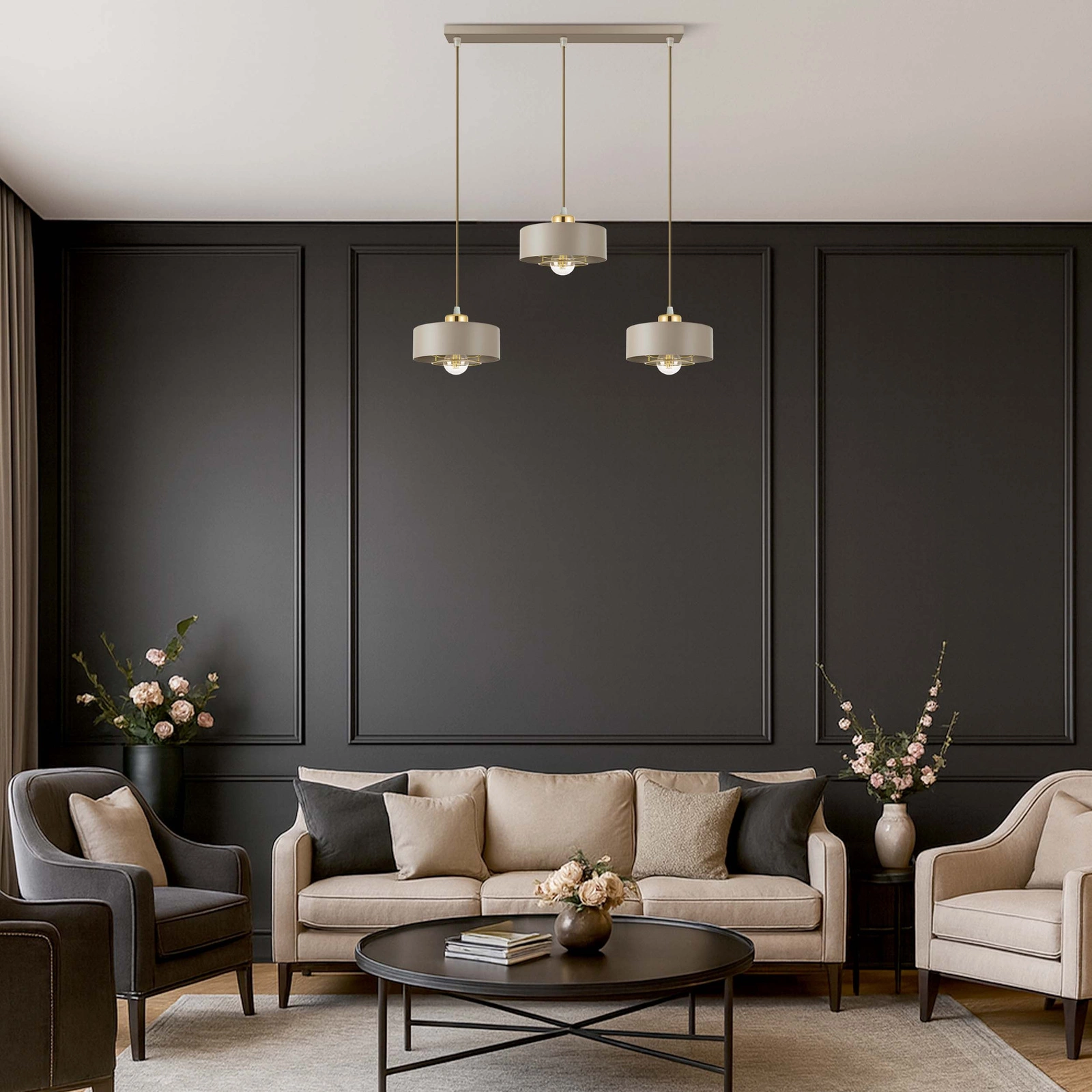 Neutralny, stonowany, a jednocześnie elegancki – świetnie komponuje się z bielą, szarością, czernią, złotem czy naturalnym drewnem. - ✅ Trzy punkty świetlne E27 – zapewniają doskonałe doświetlenie całego pomieszczenia, równomiernie rozpraszając światło.