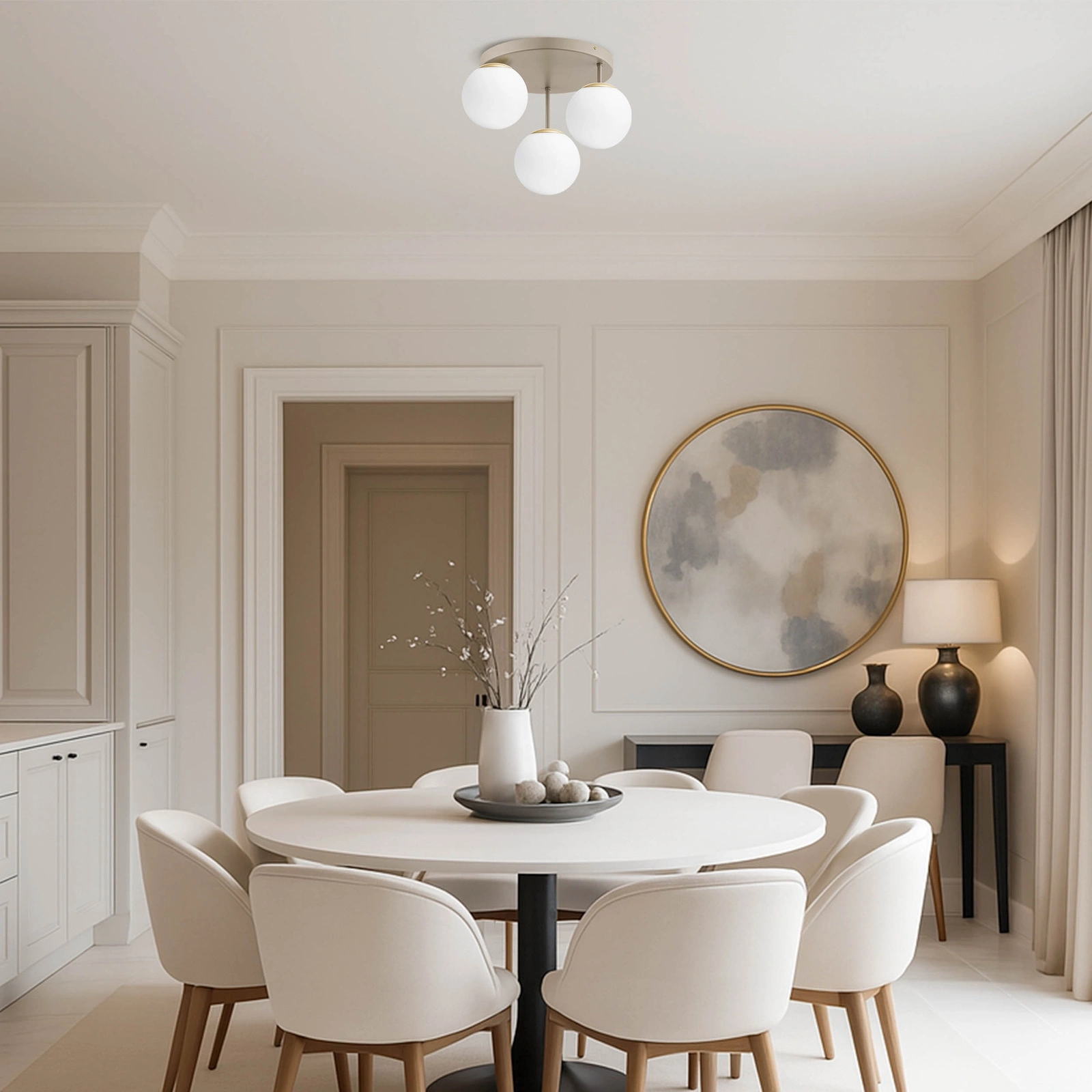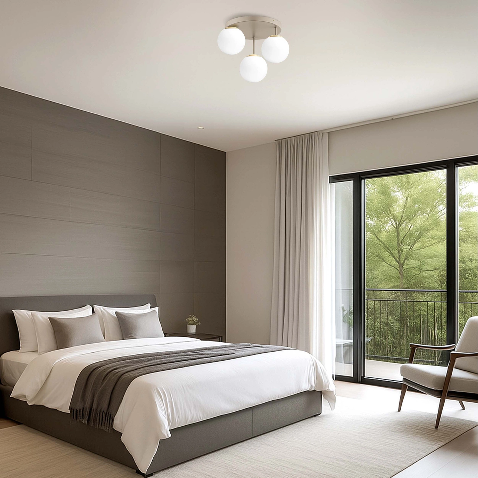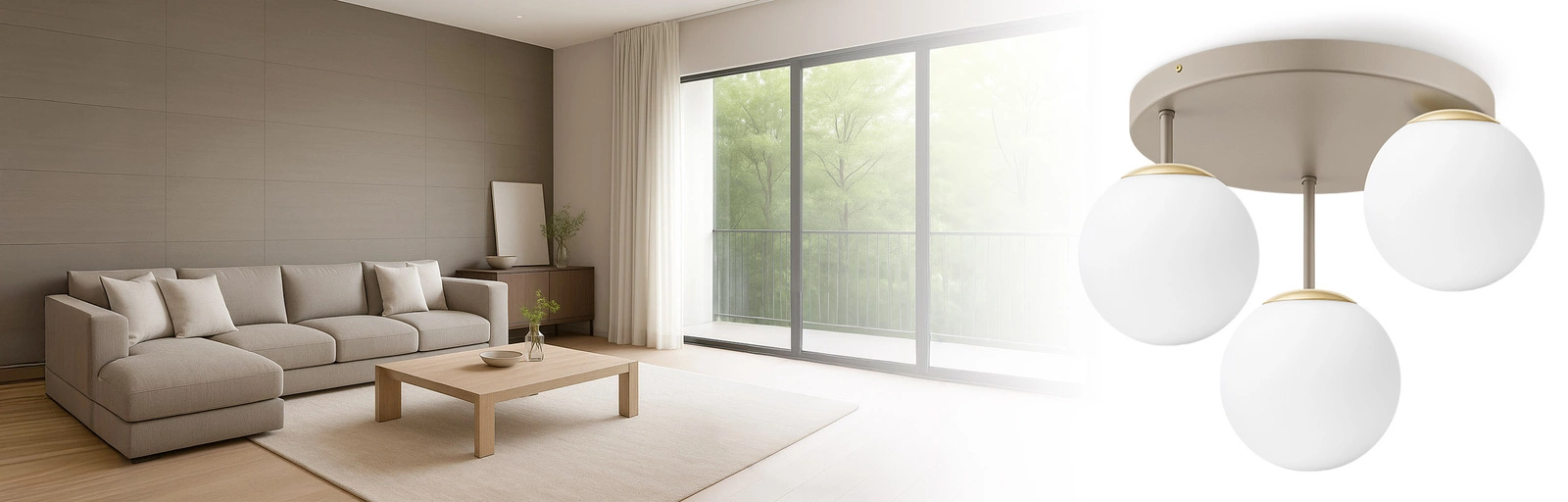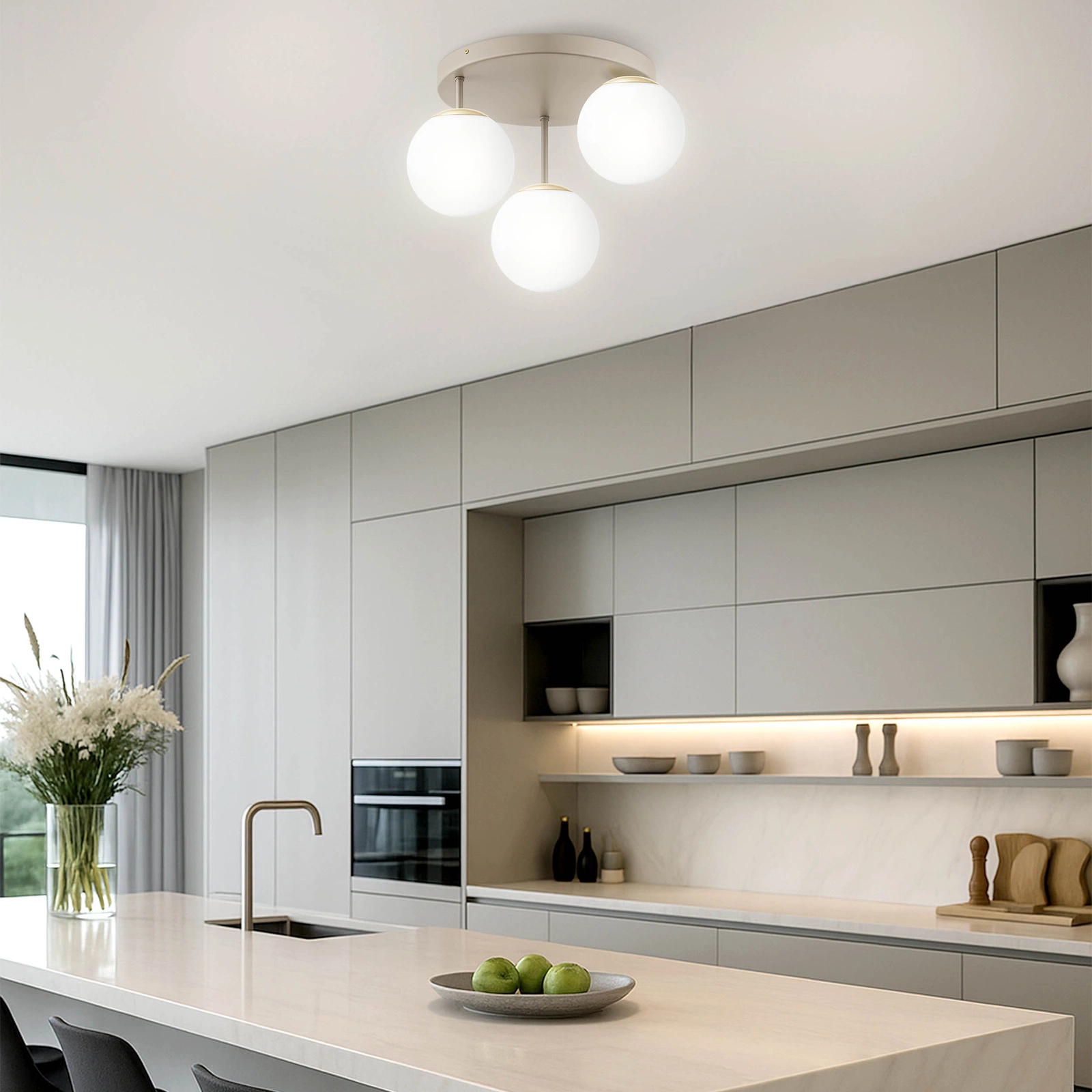 ✅ Trzy szklane klosze w formie kuli – mleczne szkło zapewnia delikatne, równomierne rozproszenie światła, tworząc ciepłą atmosferę w pomieszczeniu.