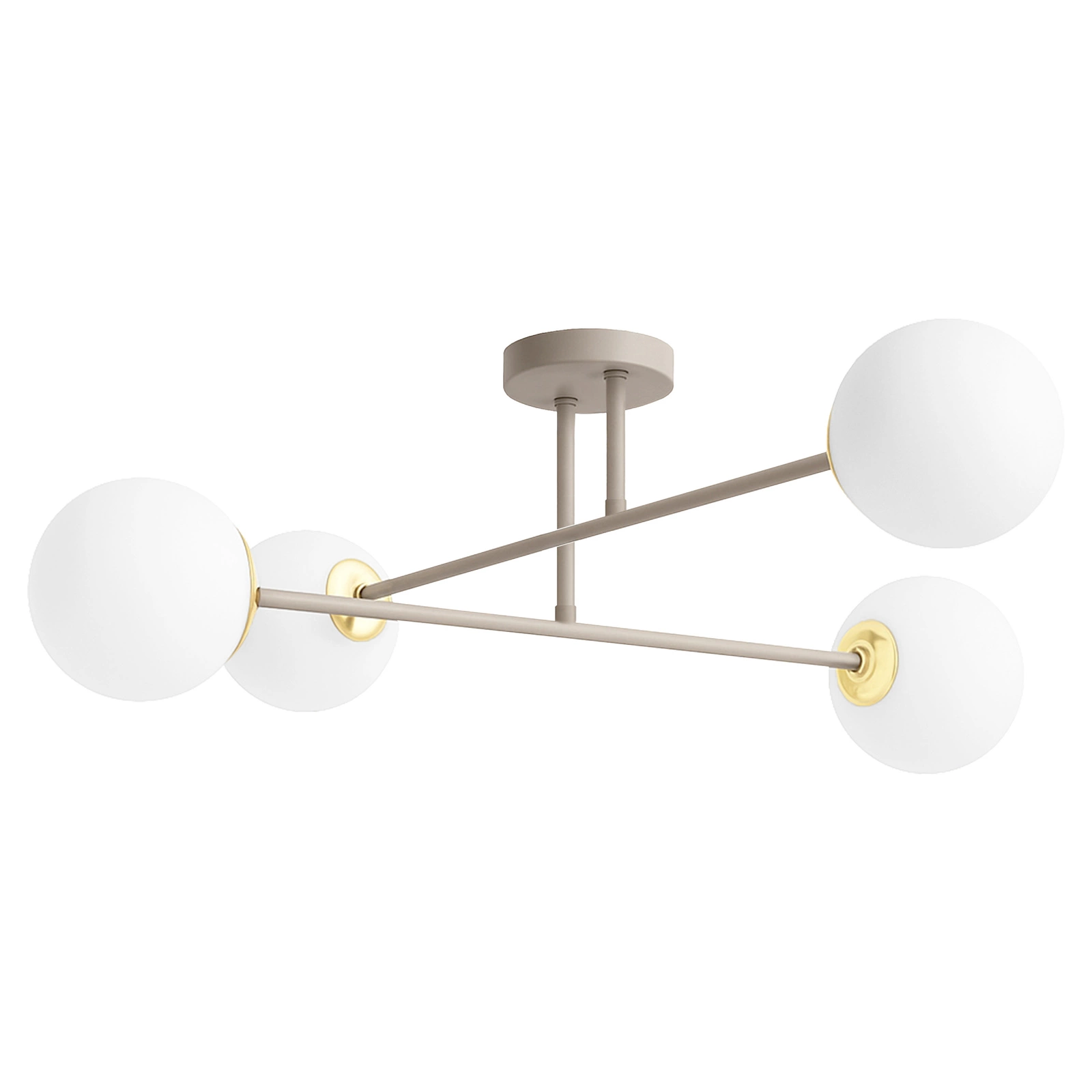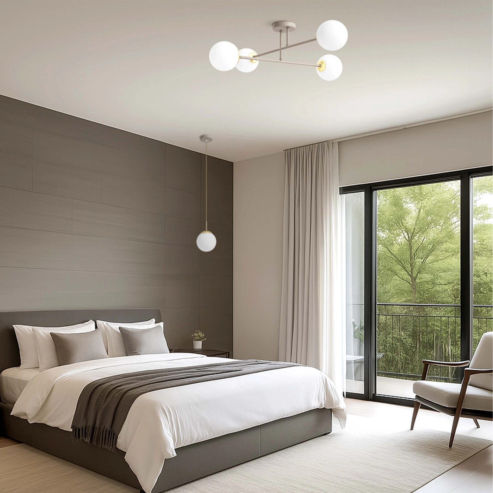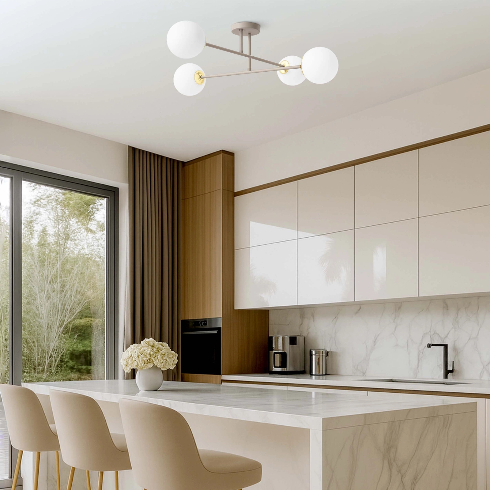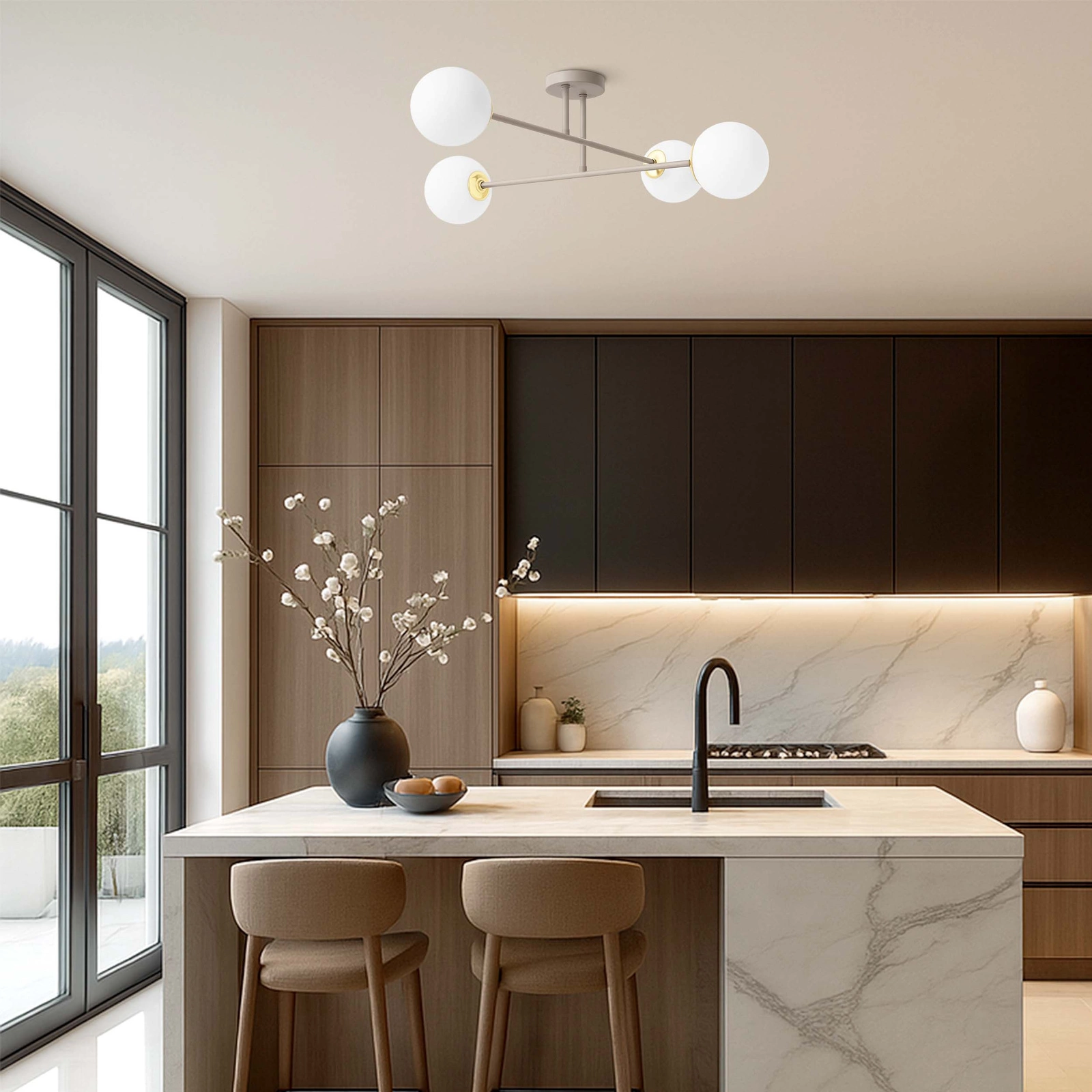 Cztery rozstawione promieniście mleczne kule zapewniają równomierne światło w każdym zakątku pomieszczenia.