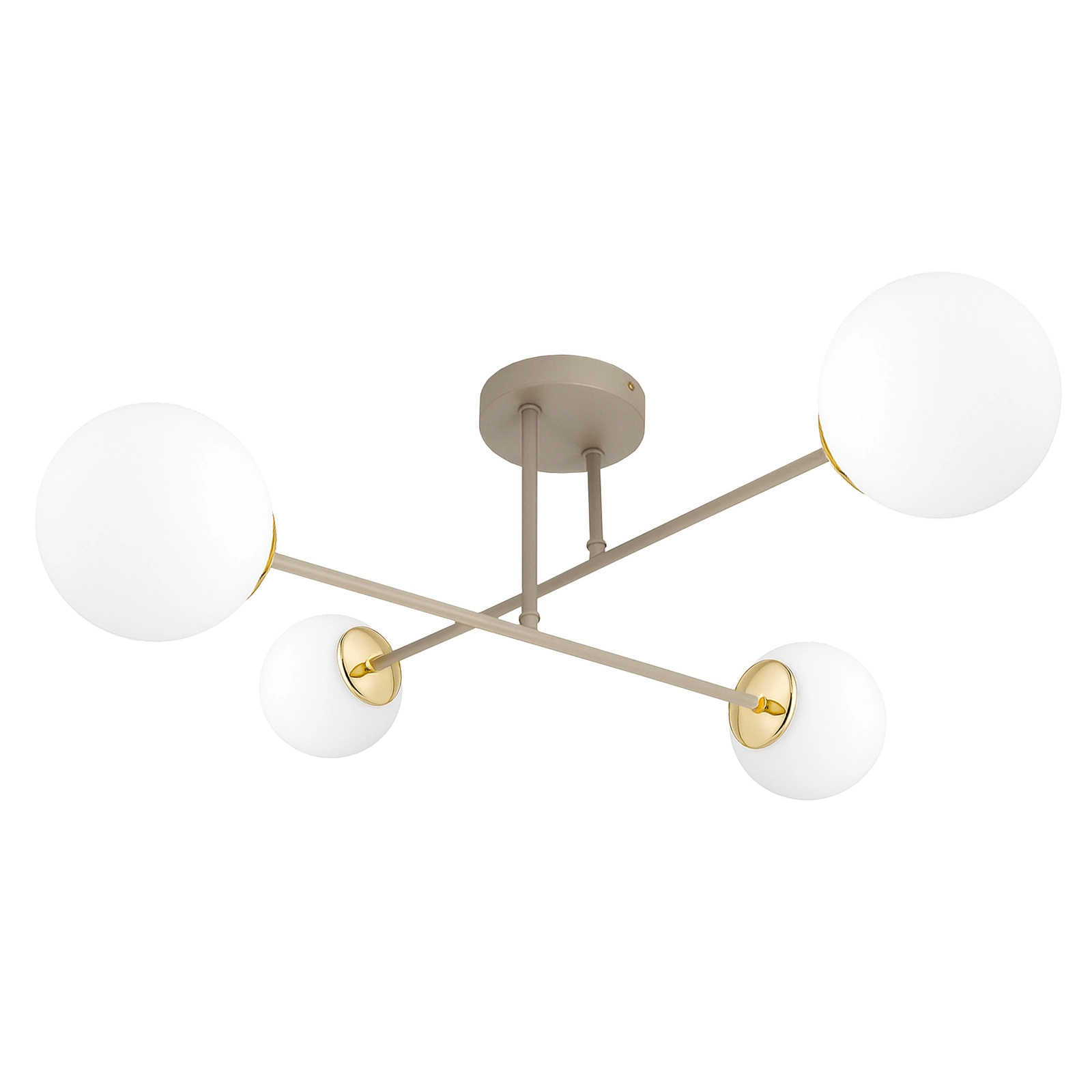 - Wprowadź do swojego wnętrza elegancję, nowoczesność i ponadczasową estetykę dzięki tej wyjątkowej lampie sufitowej. Połączenie modnego beżu (kaszmiru) ze złotymi akcentami oraz kloszami ze szkła mlecznego sprawia, że lampa idealnie wpisuje się w najświeższe trendy wnętrzarskie: glamour, modern classic, japandi, minimalizm czy nowoczesny loft.