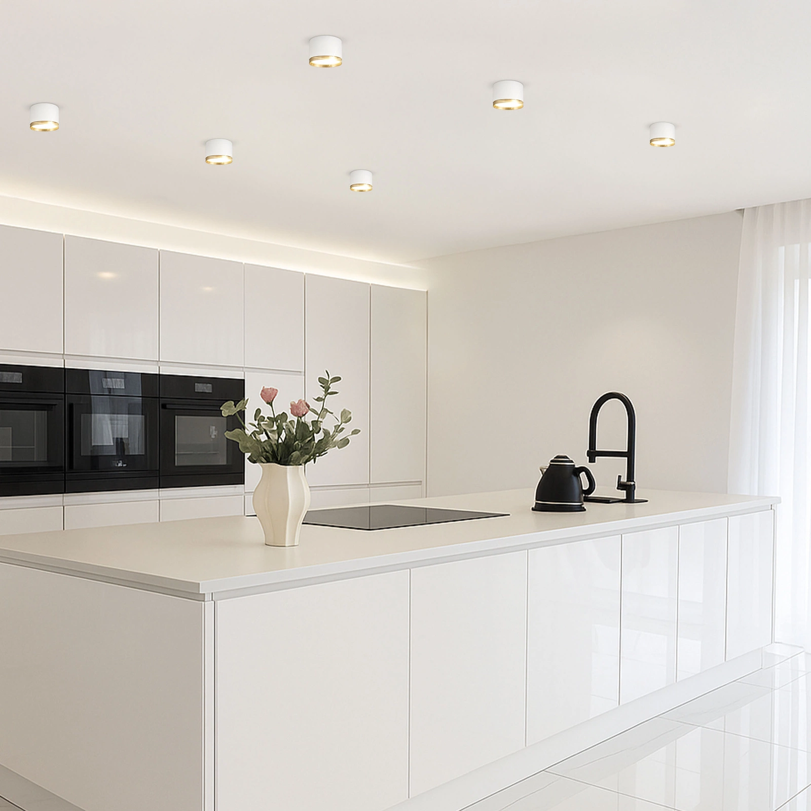 - Stylowa oprawa sufitowa natynkowa LED GX53 to doskonały wybór do nowoczesnych wnętrz, gdzie liczą się design, funkcjonalność i jakość wykonania. Wykonana z solidnego aluminium, łączy w sobie minimalistyczną formę z eleganckim złotym pierścieniem, który nadaje jej luksusowego charakteru. Idealnie sprawdzi się w salonie, kuchni, korytarzu, garderobie, a nawet przestrzeni komercyjnej – wszędzie tam, gdzie potrzebne jest światło i styl w jednym.