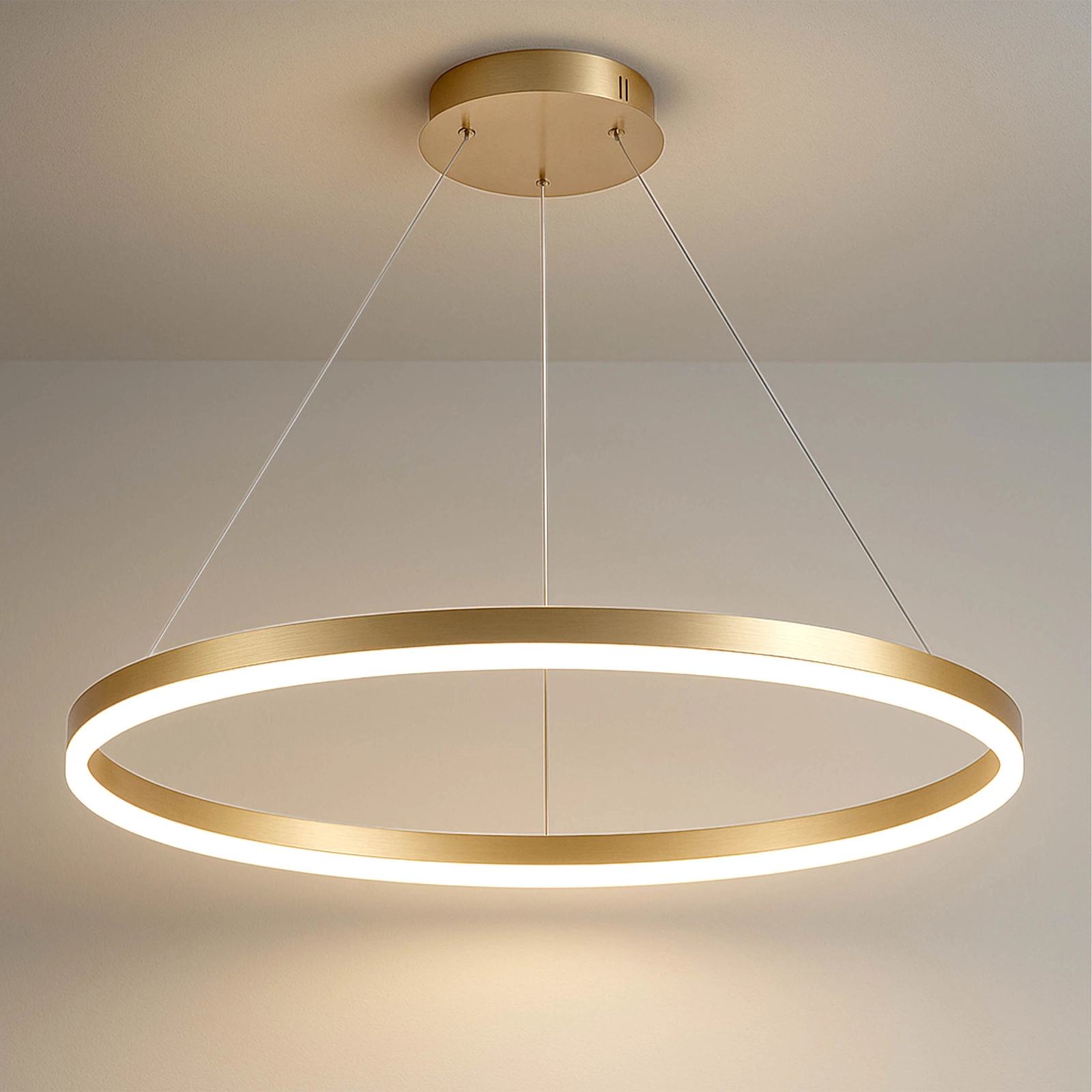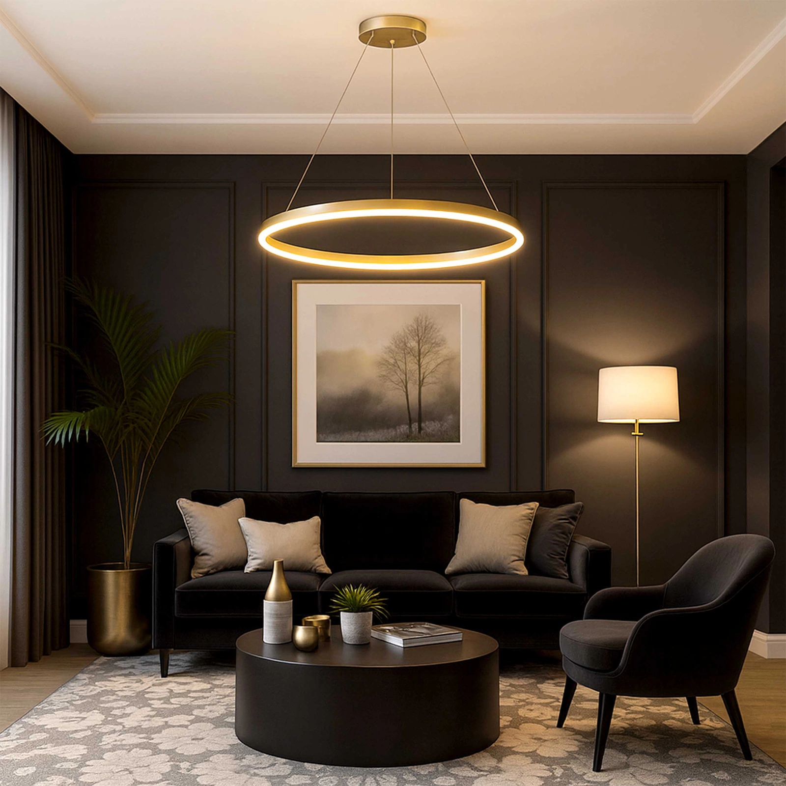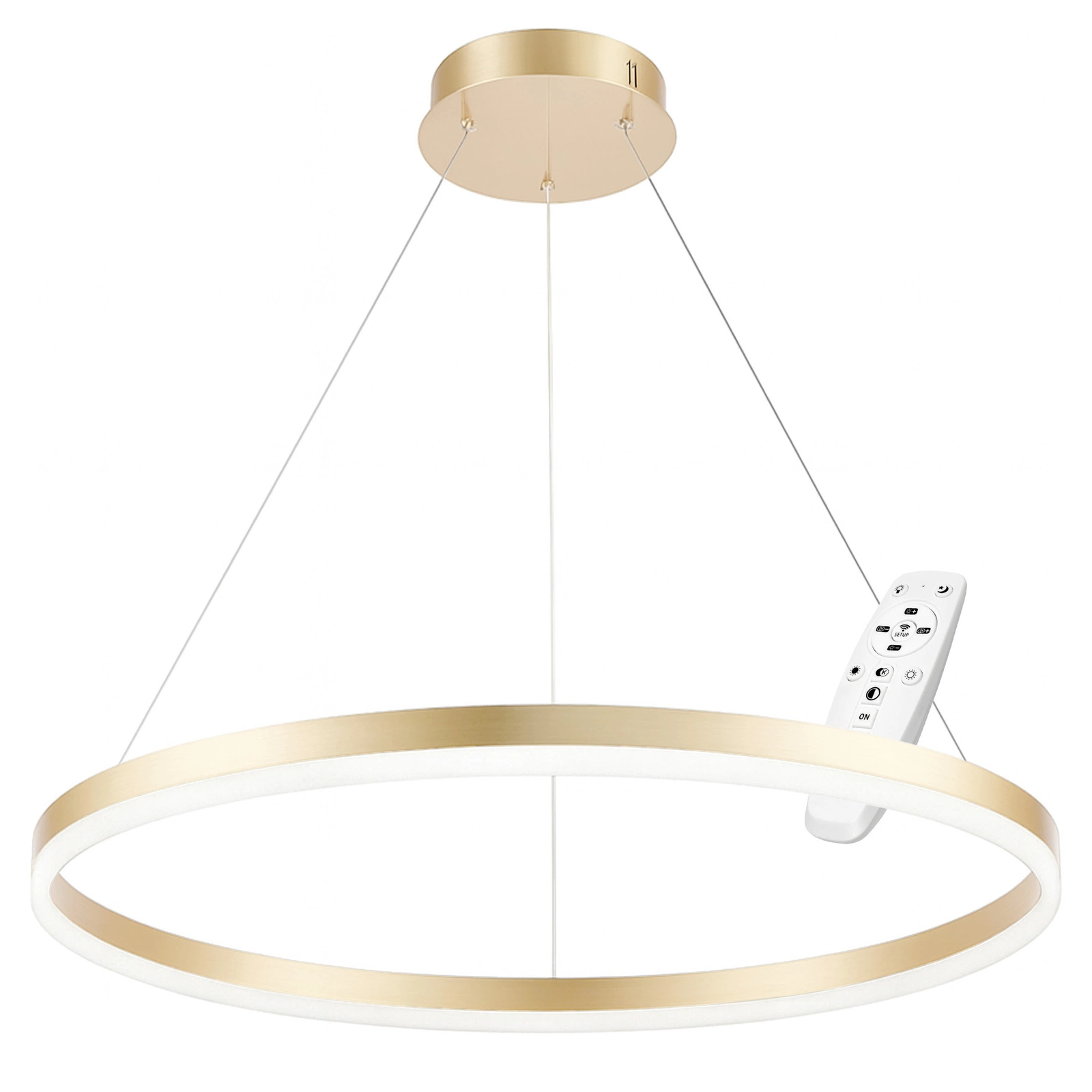 - Nowoczesna lampa sufitowa LED w formie minimalistycznego złotego pierścienia, to idealne połączenie prestiżu, funkcjonalności i najwyższej wygody obsługi. Dzięki pilotowi możesz sterować światłem bez wstawania z miejsca – jednym kliknięciem zmienisz barwę, jasność oraz włączysz lub wyłączysz oświetlenie. Idealna do salonu, jadalni, nowoczesnej sypialni, wnętrz glamour i przestrzeni komercyjnych.