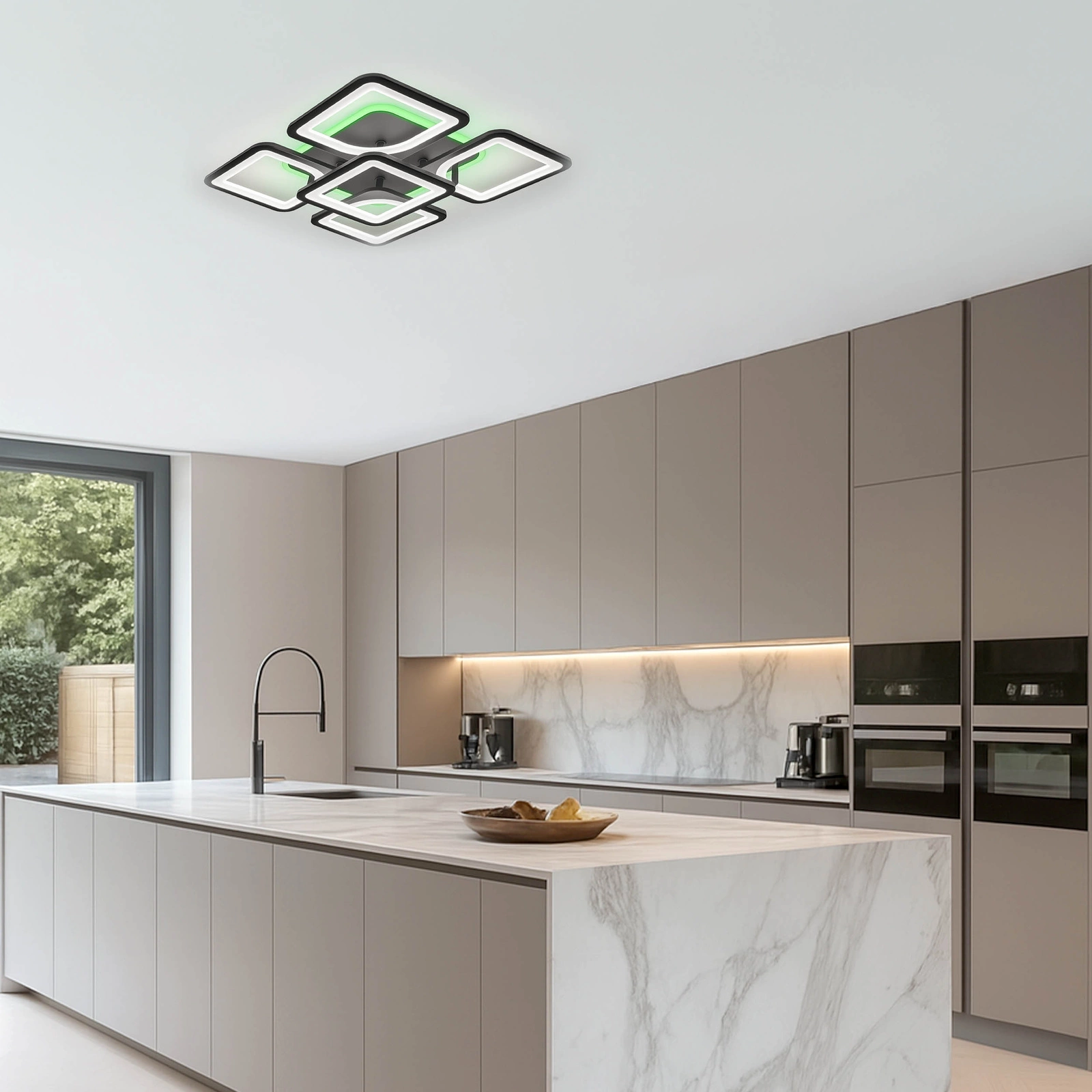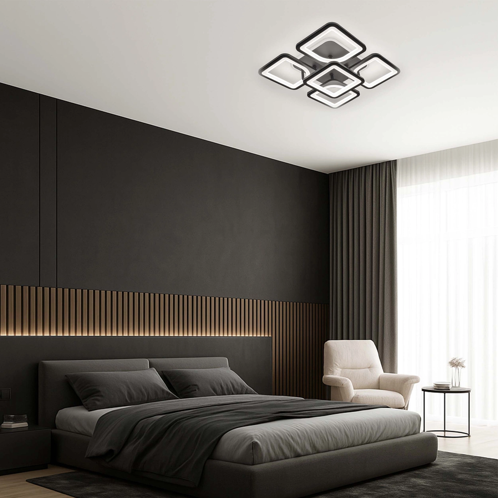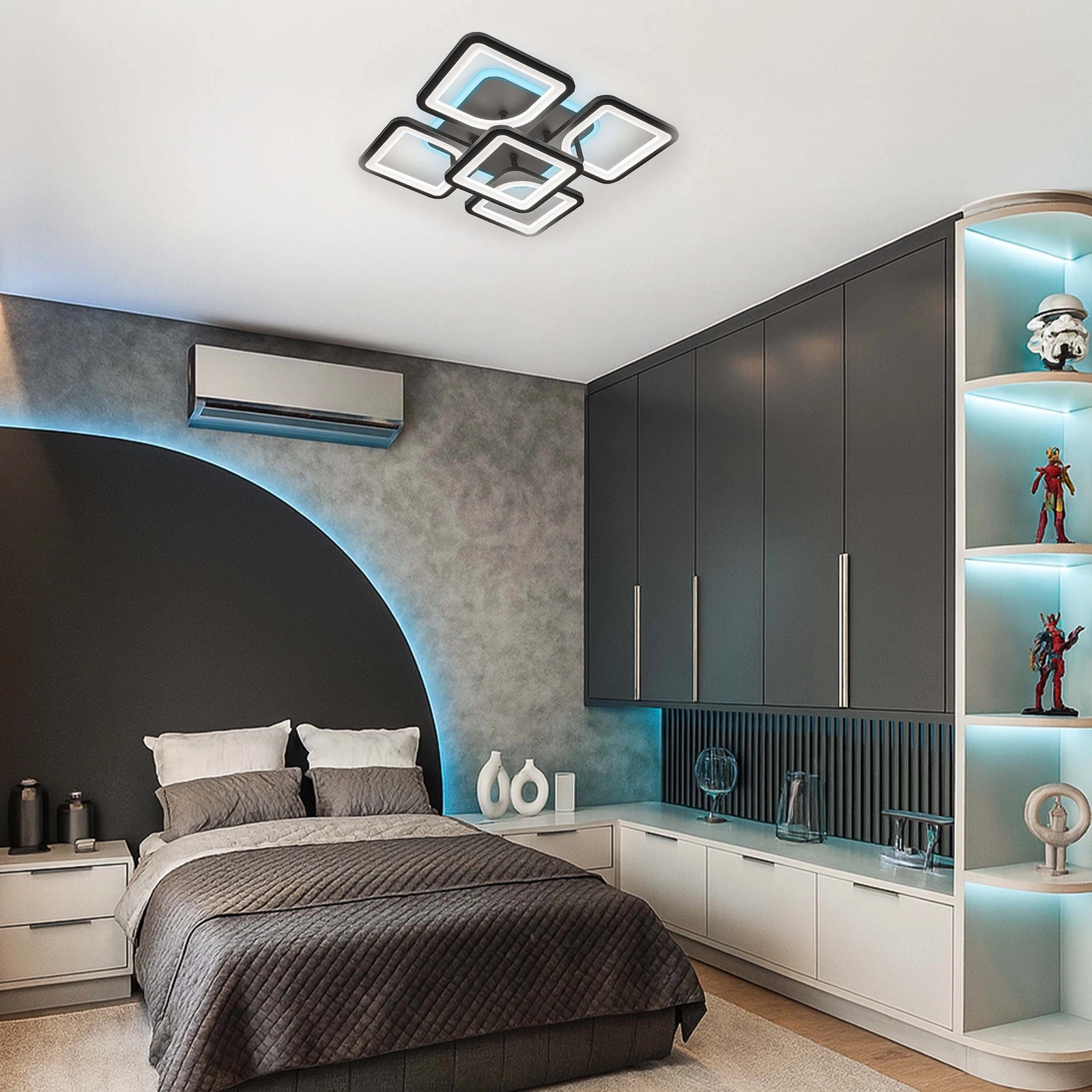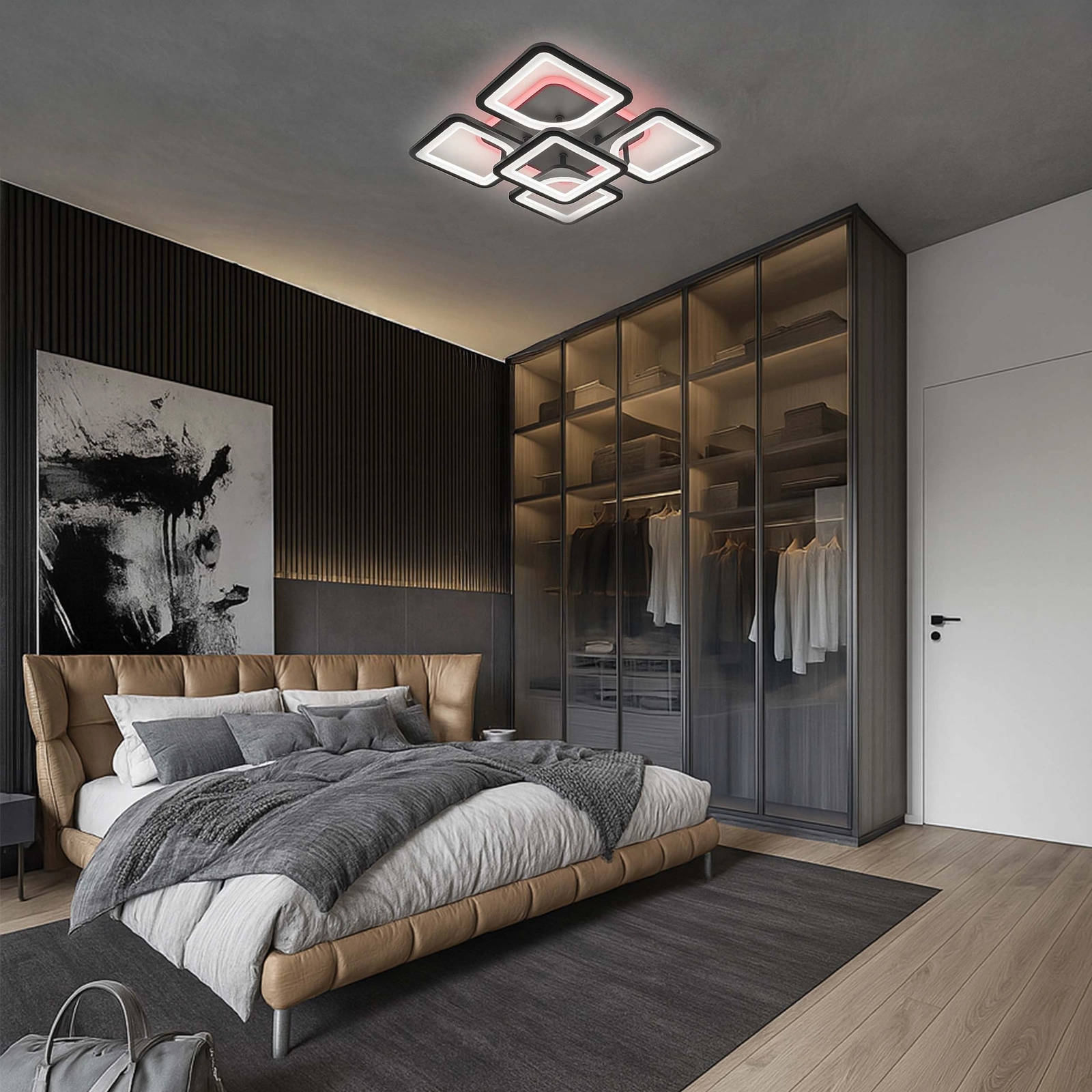 - Ta nowoczesna lampa LED o imponującej mocy 81W to oświetlenie, które natychmiast przyciąga wzrok. Połączenie geometrycznych modułów tworzy wyjątkową kompozycję, dynamiczną w formie i jednocześnie niezwykle elegancką. Górny pierścień z podświetleniem RGB pozwala budować nastrój — od spokojnego, stonowanego światła po kolorowy efekt, który zmienia wnętrze w designerską przestrzeń. To nie jest zwykły plafon. To element wyposażenia, który gra pierwszoplanową rolę w aranżacji.