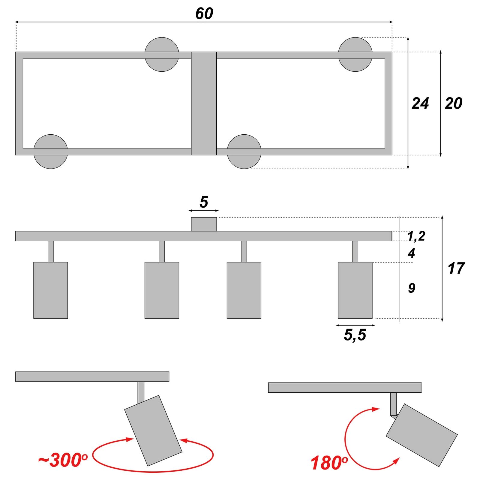 ✔️ Szeroki zakres ustawień – reflektory mają możliwość regulacji kierunku świecenia (obrót ok. ~300° i odchylenie 180°), co daje dużą swobodę w aranżacji światła.